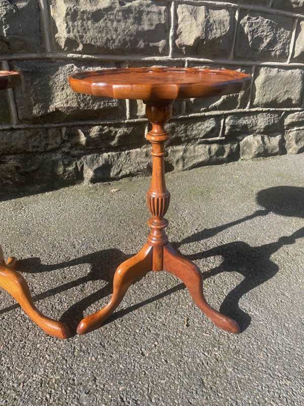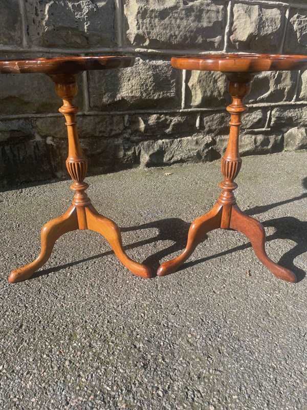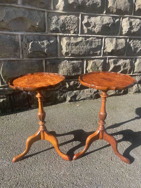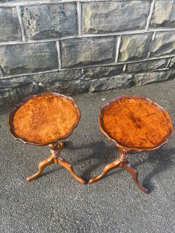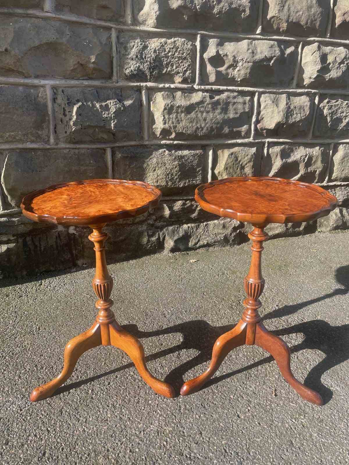 Offered for sale is this pair antique burr walnut tripod wine tables.