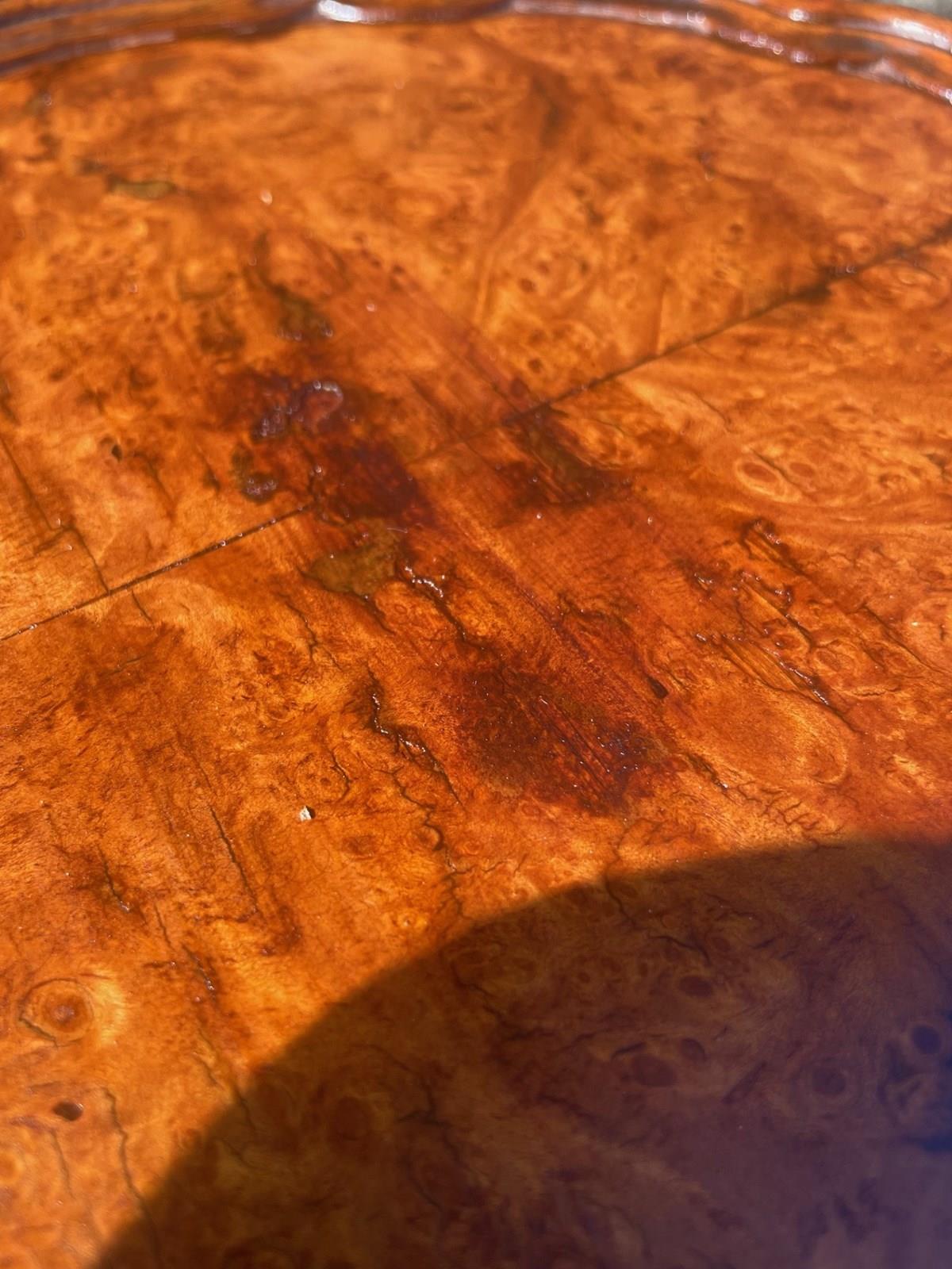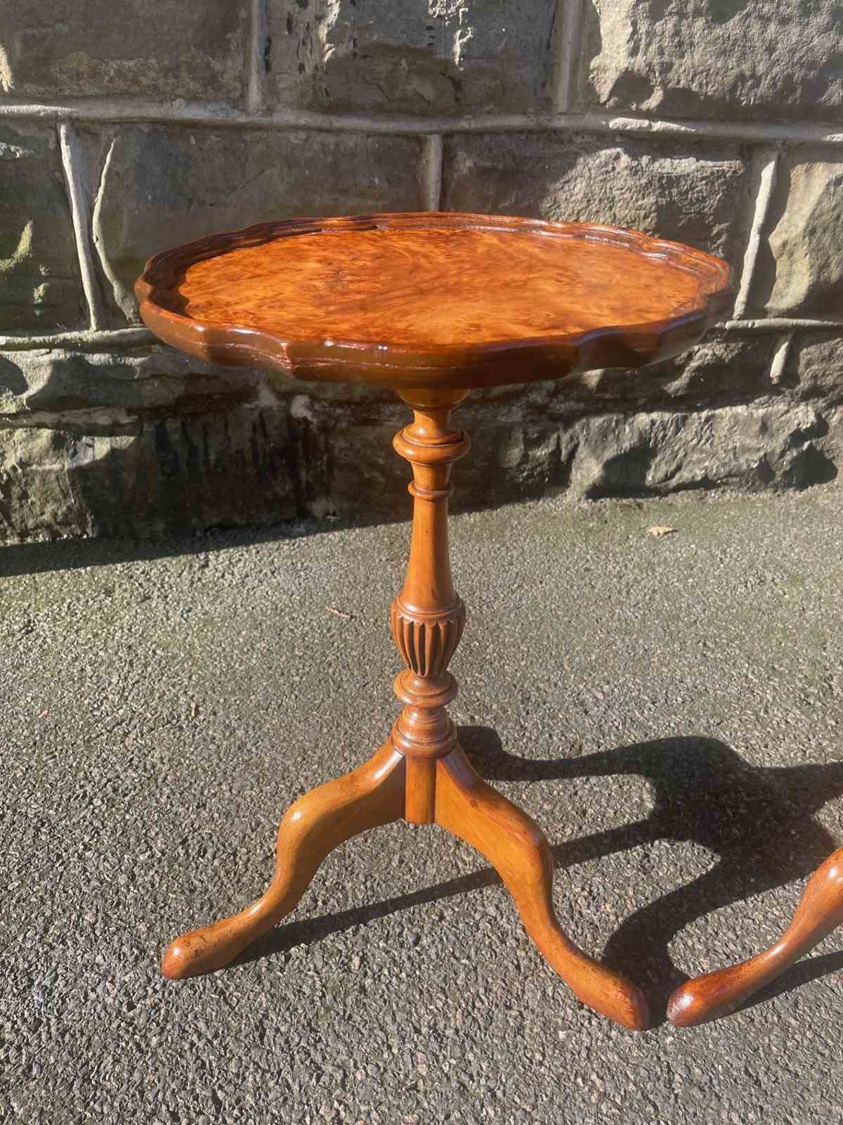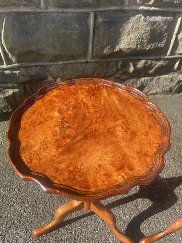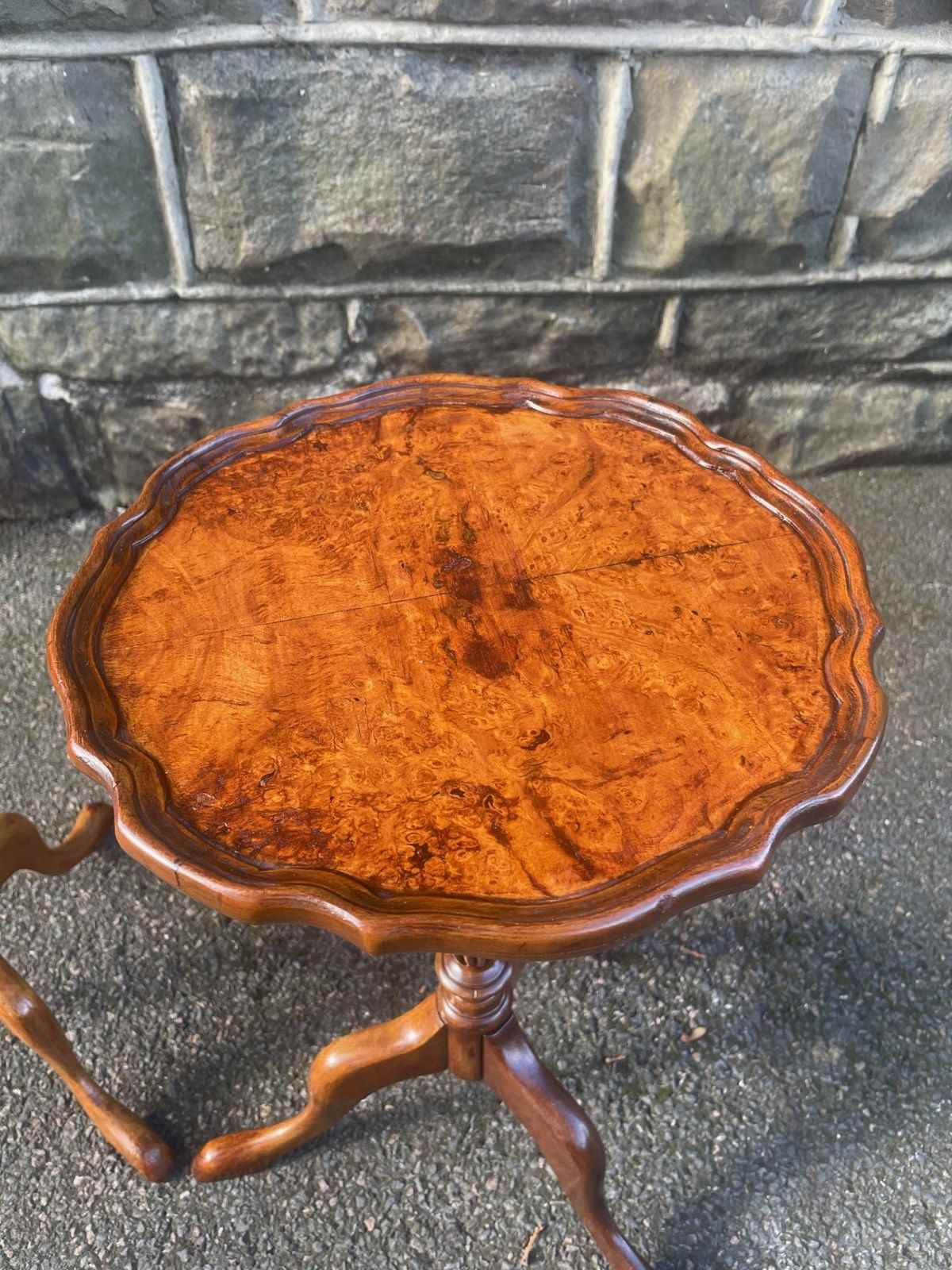 Round burr walnut top with a pie crust edge, upon a turned column with 3 shaped legs.