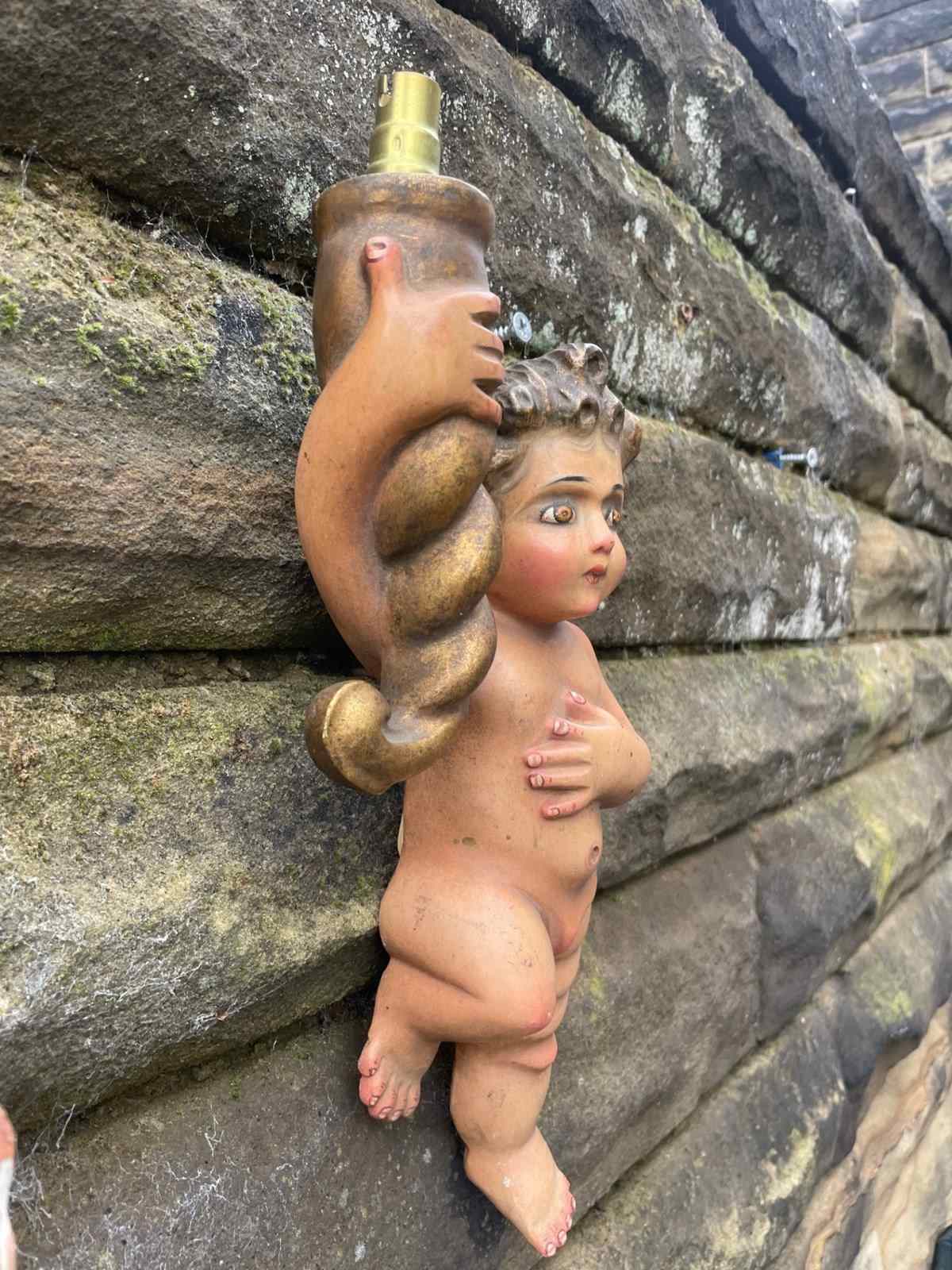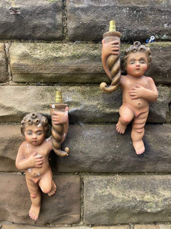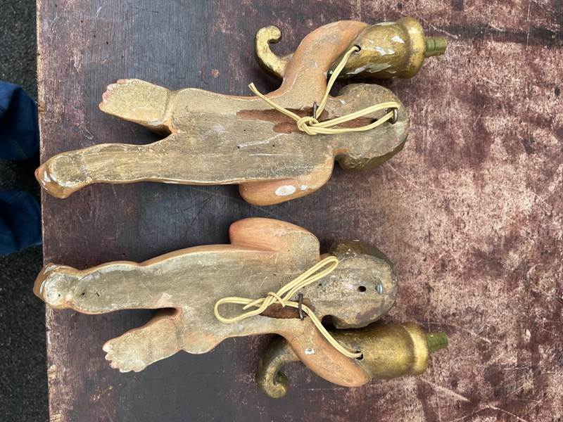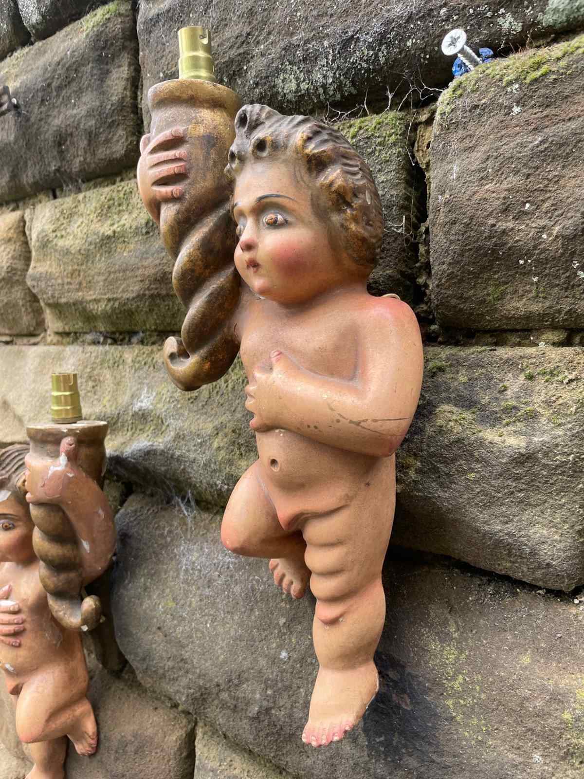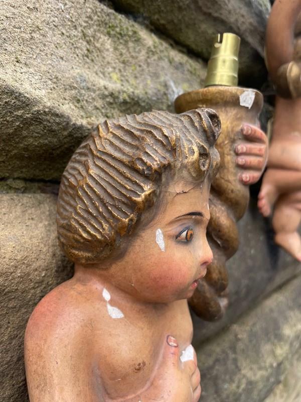 Pair Antique Carved Wood & Polychrome Painted Cherub Wall Lights