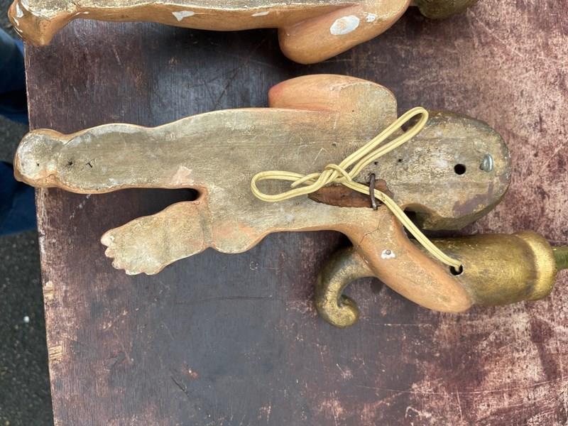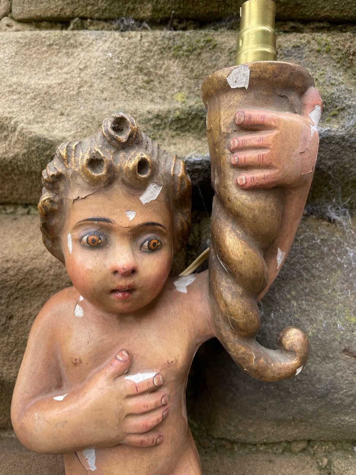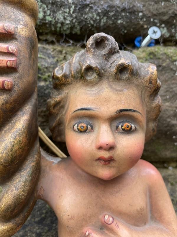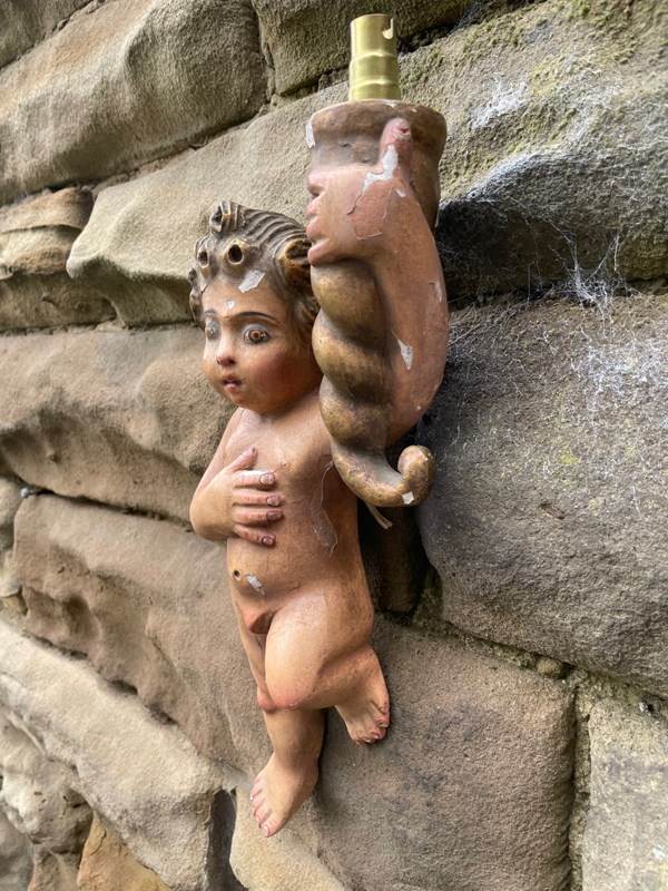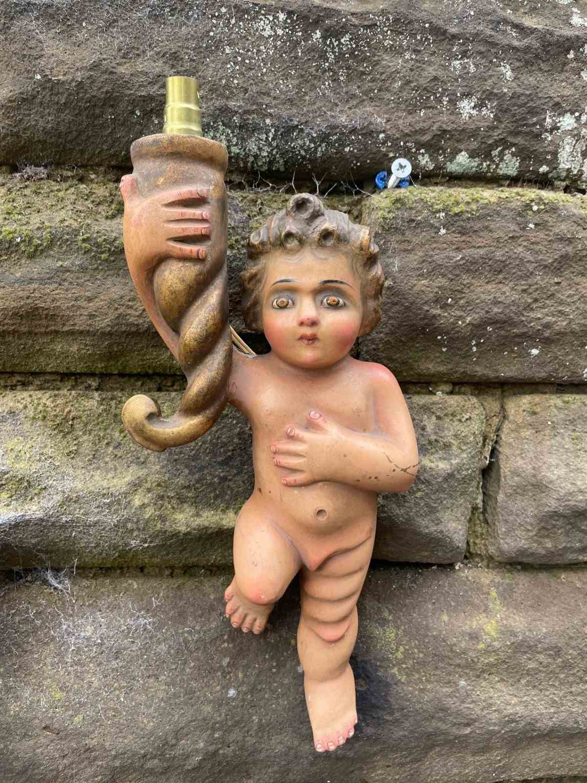 Pair Antique Carved Wood & Polychrome Painted Cherub Wall Lights