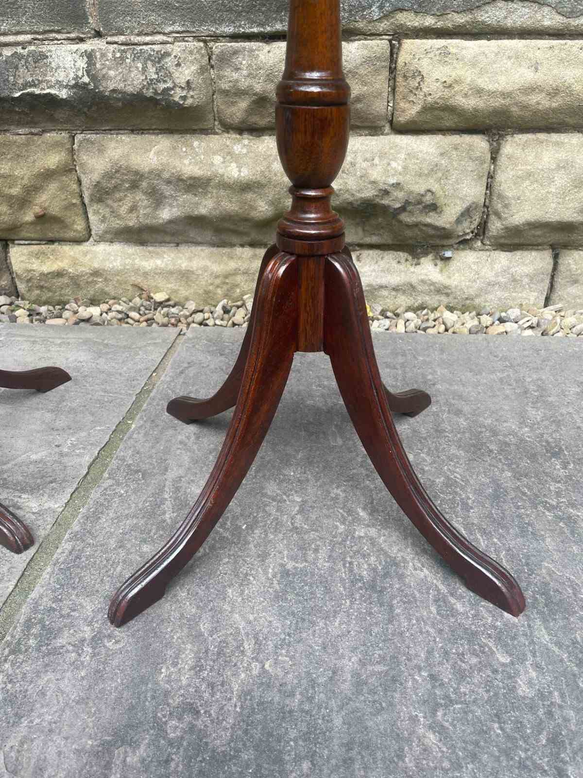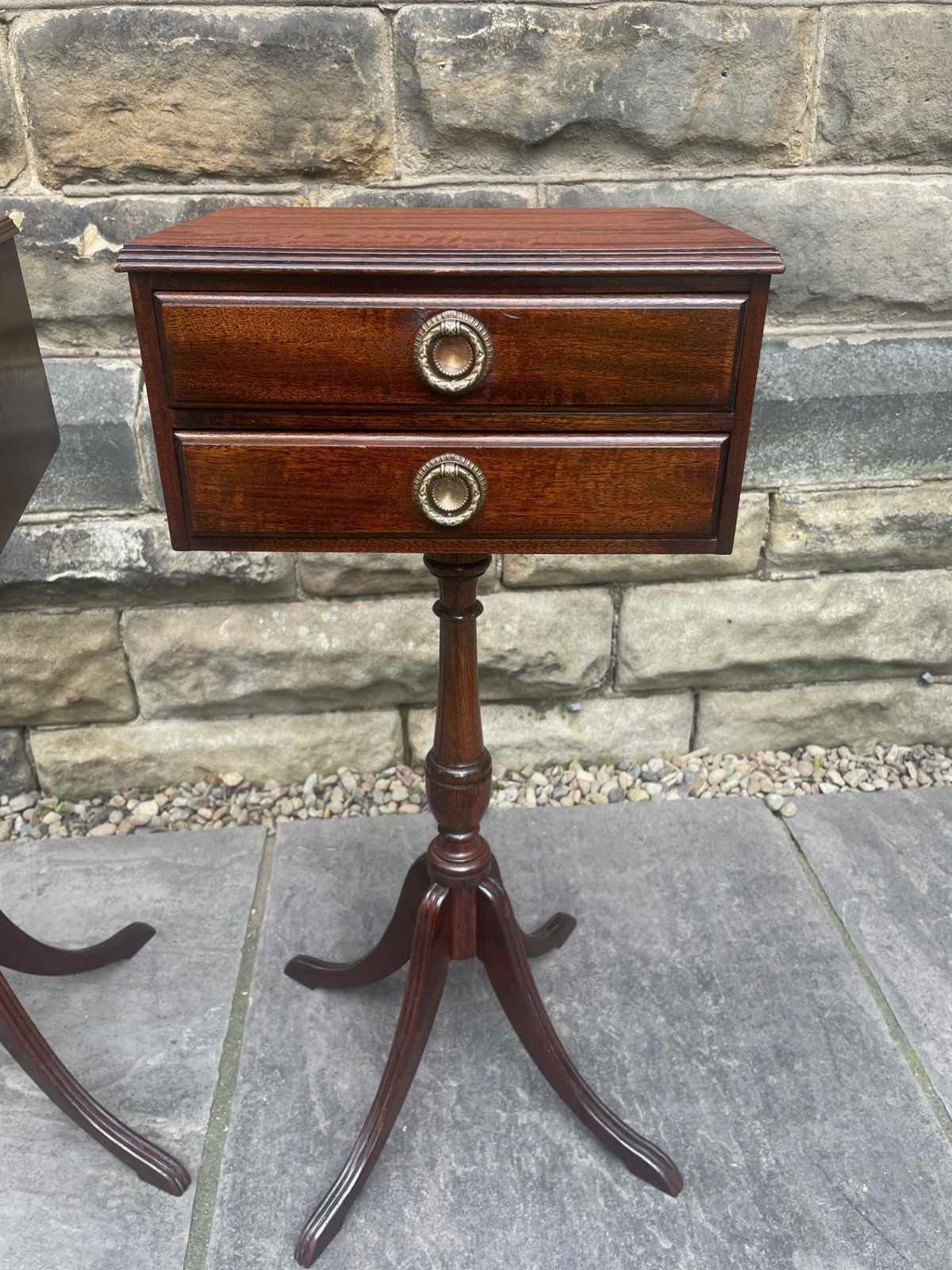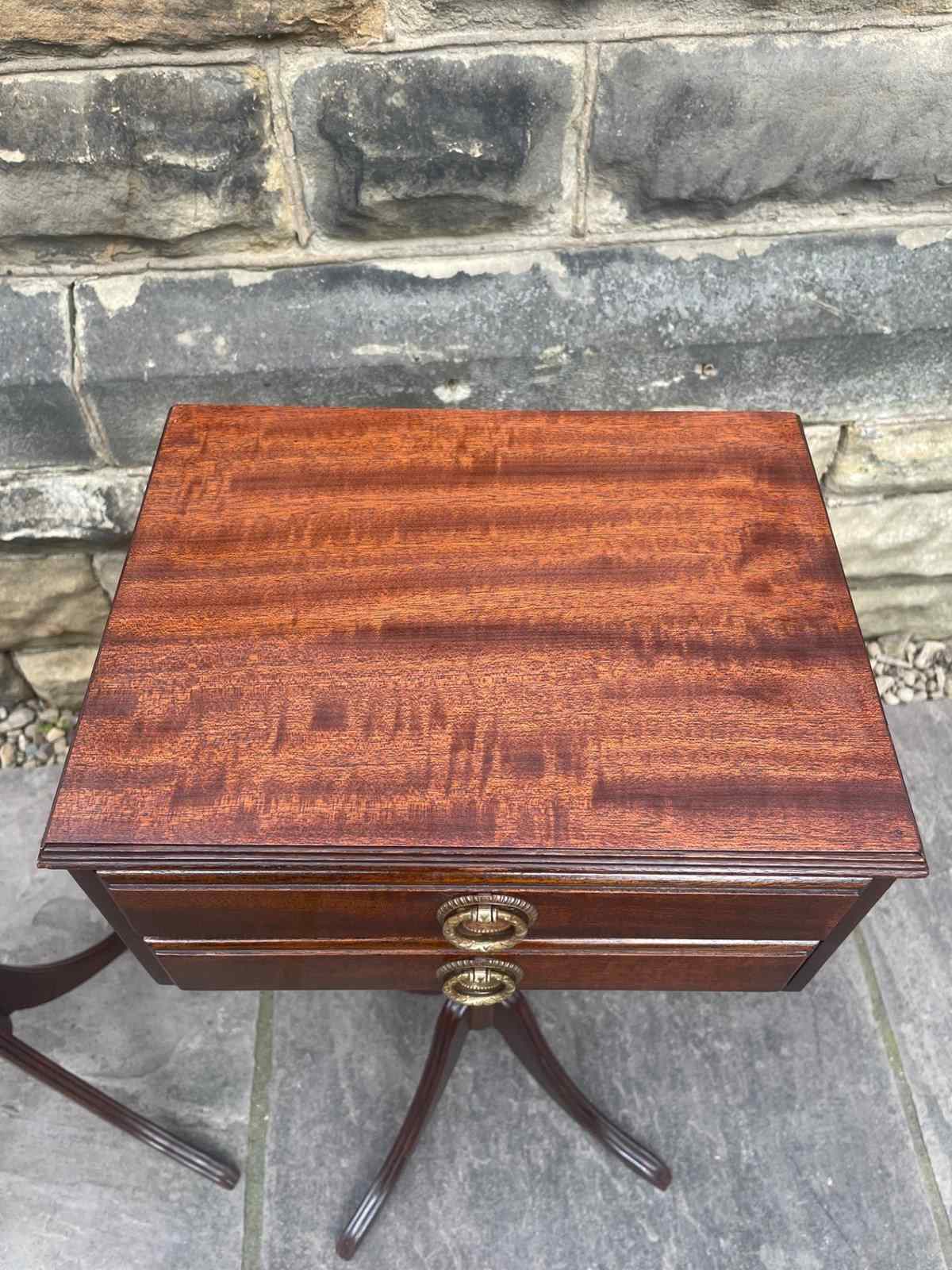 In mahogany, having 2 draws with brass ring handles , turned central column with 4 sweeping legs.