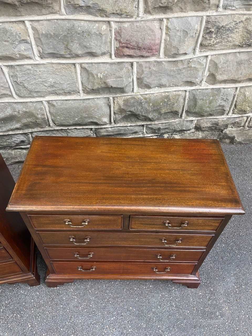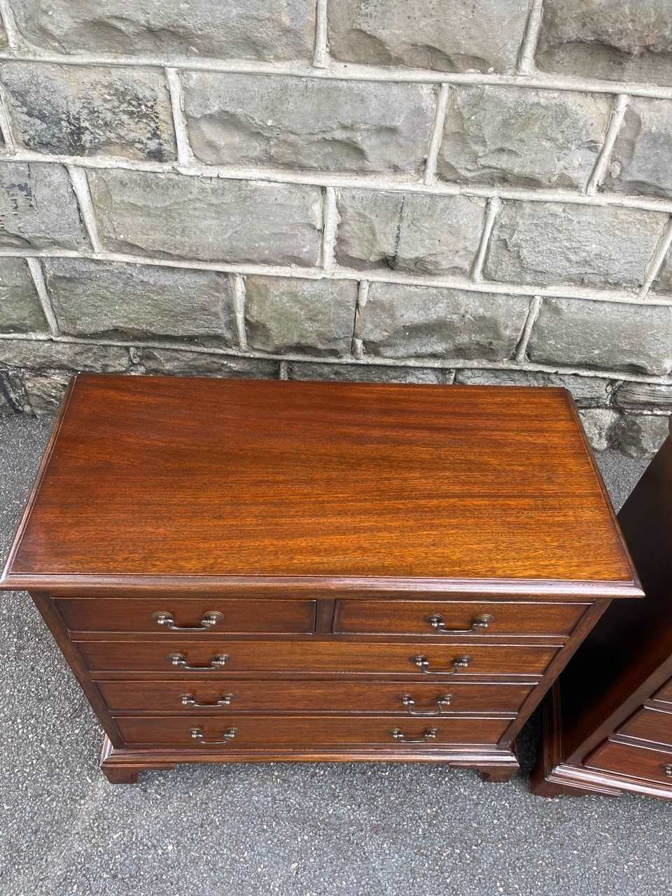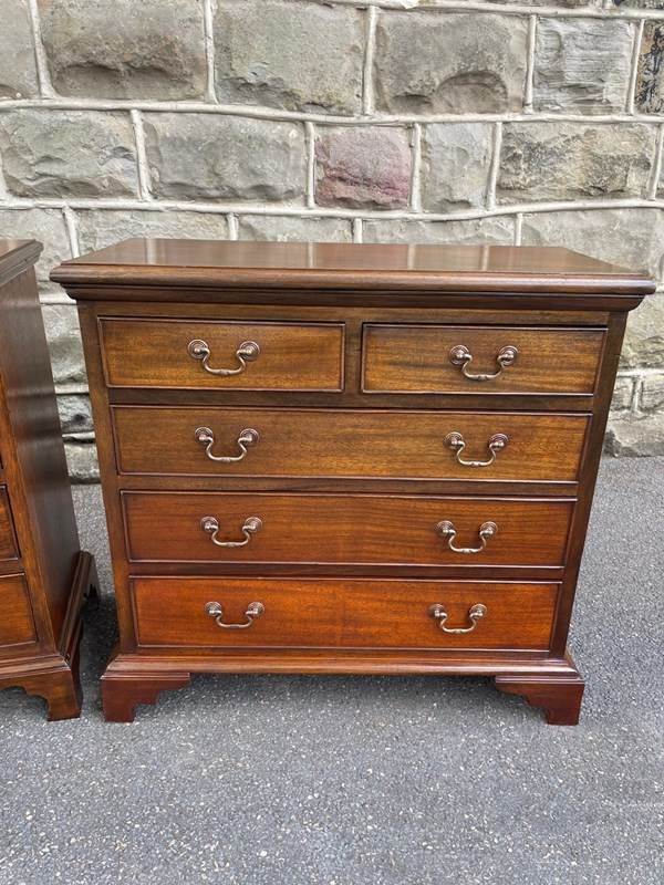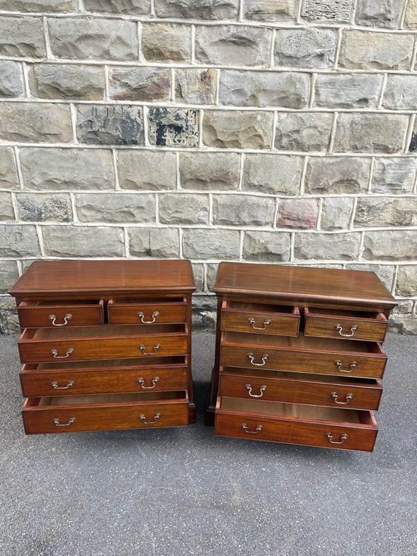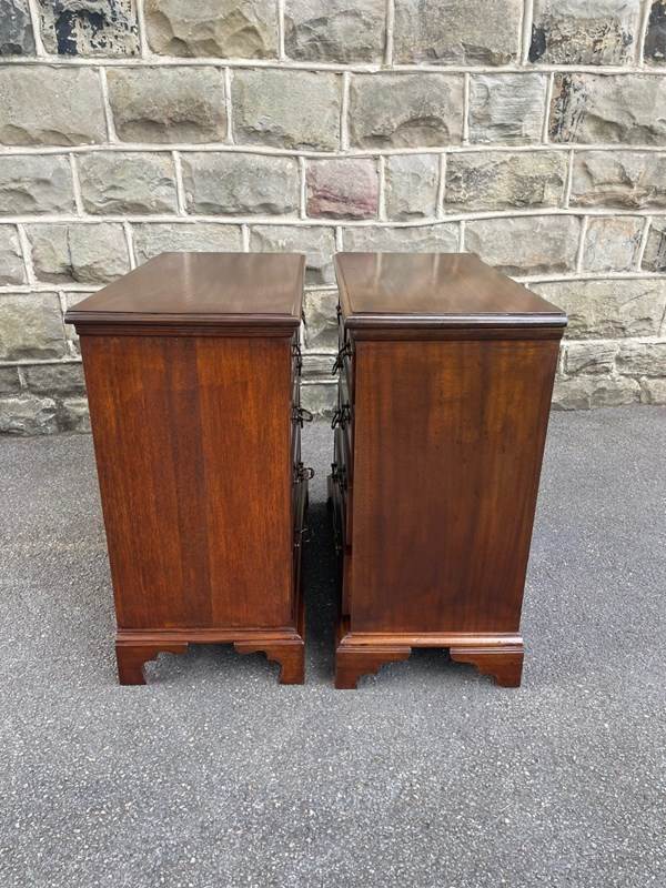 Offered for sale is this good pair of small antique mahogany bedside chests. Lovely size and proportions. In the George III style, in mahogany, 2 smaller over 3 larger drawers. All the drawers have brass swan neck drops handles. The drawer lining are mahogany with dovetailed joints. Polished mahogany sides standing on bracket feet.