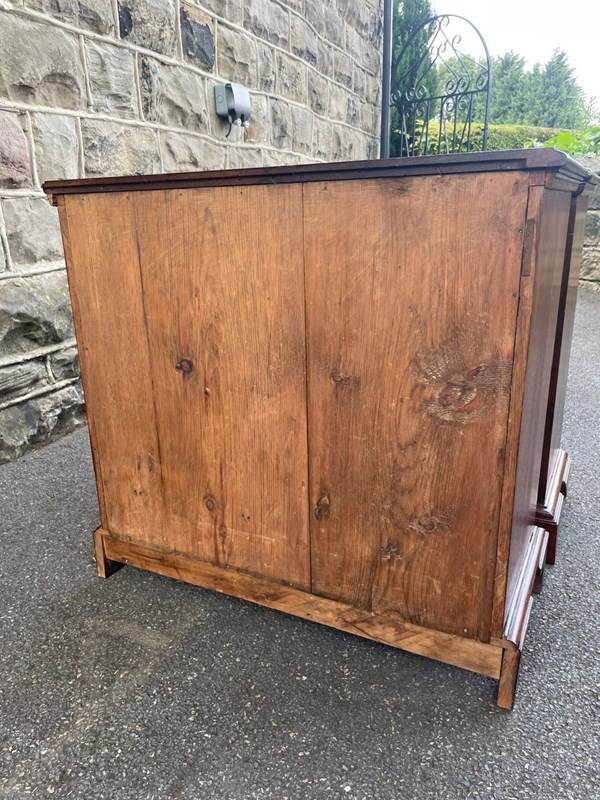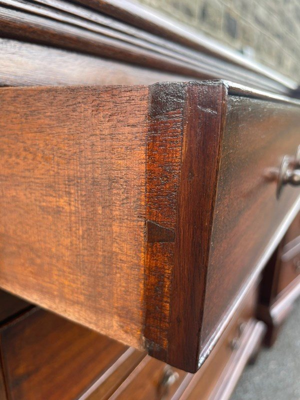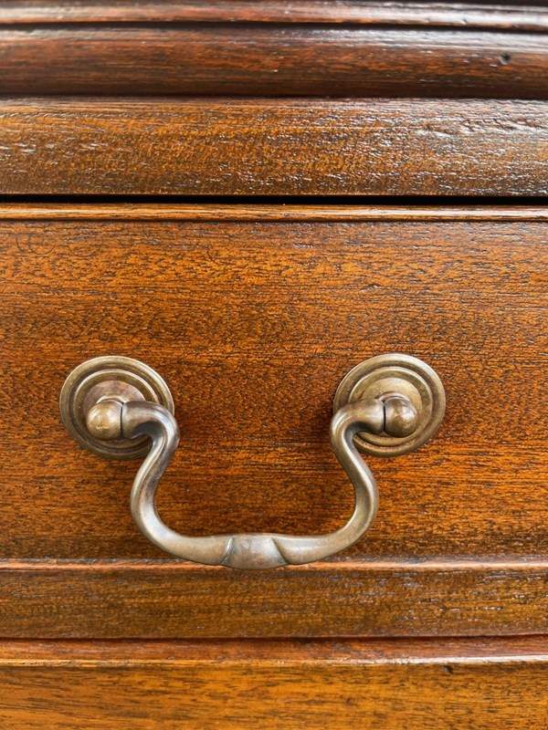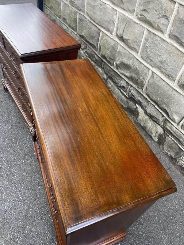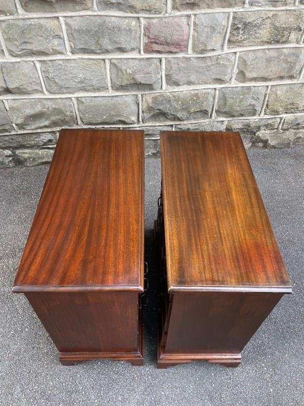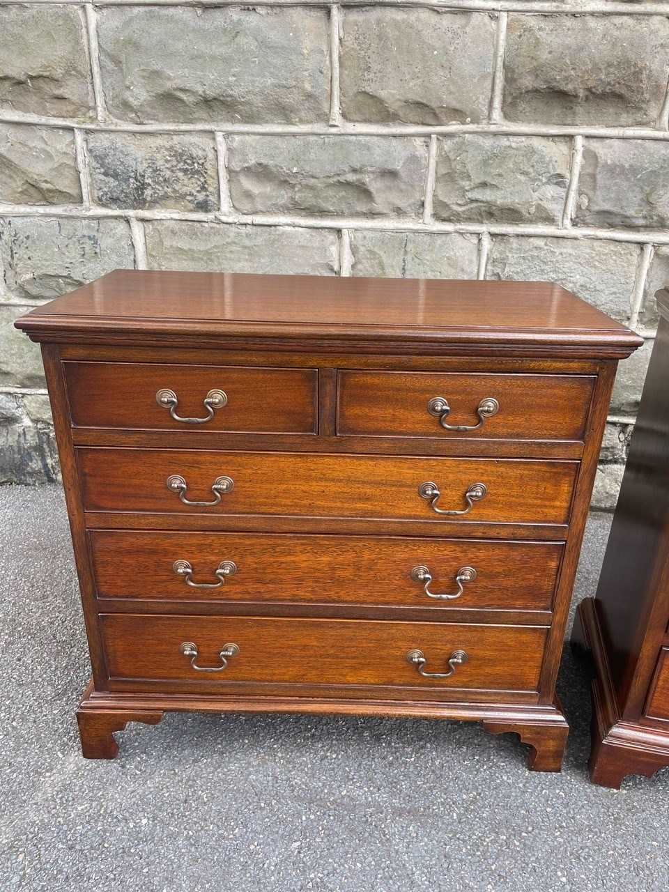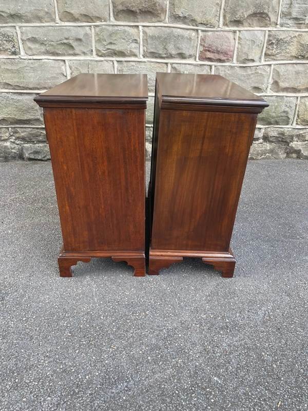 Offered for sale is this good pair of small antique mahogany bedside chests. Lovely size and proportions. In the George III style, in mahogany, 2 smaller over 3 larger drawers. All the drawers have brass swan neck drops handles. The drawer lining are mahogany with dovetailed joints. Polished mahogany sides standing on bracket feet.