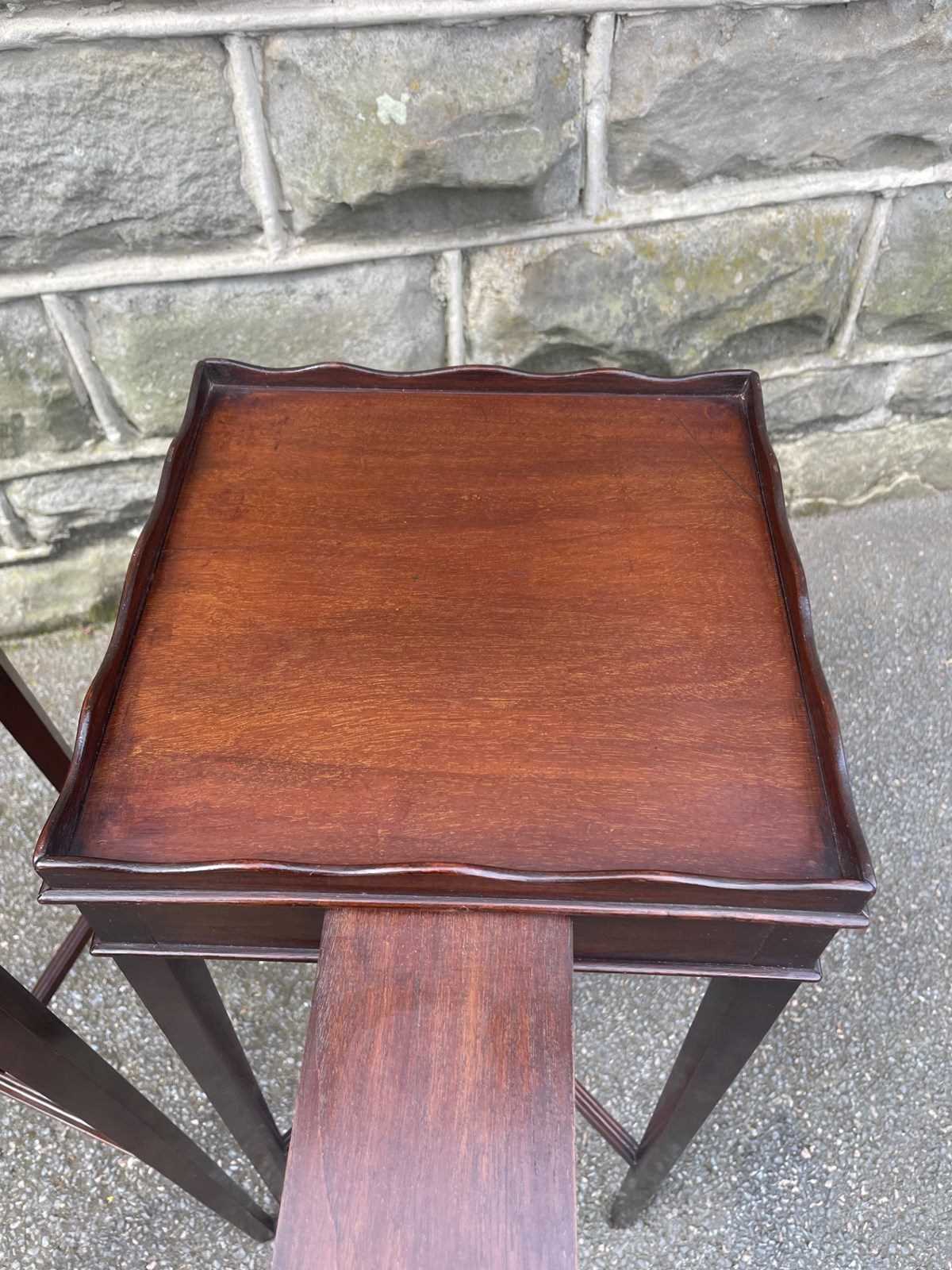 In mahogany having shaped gallery tops, pull out slides, standing on slender square tapering legs with a cross stretcher