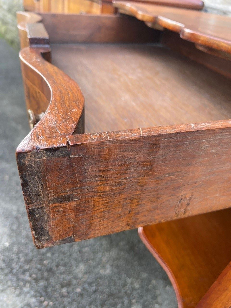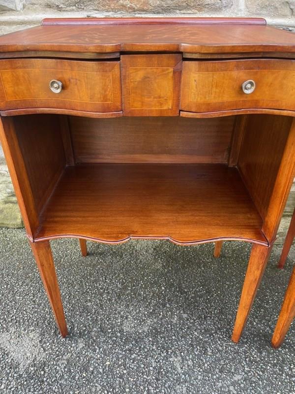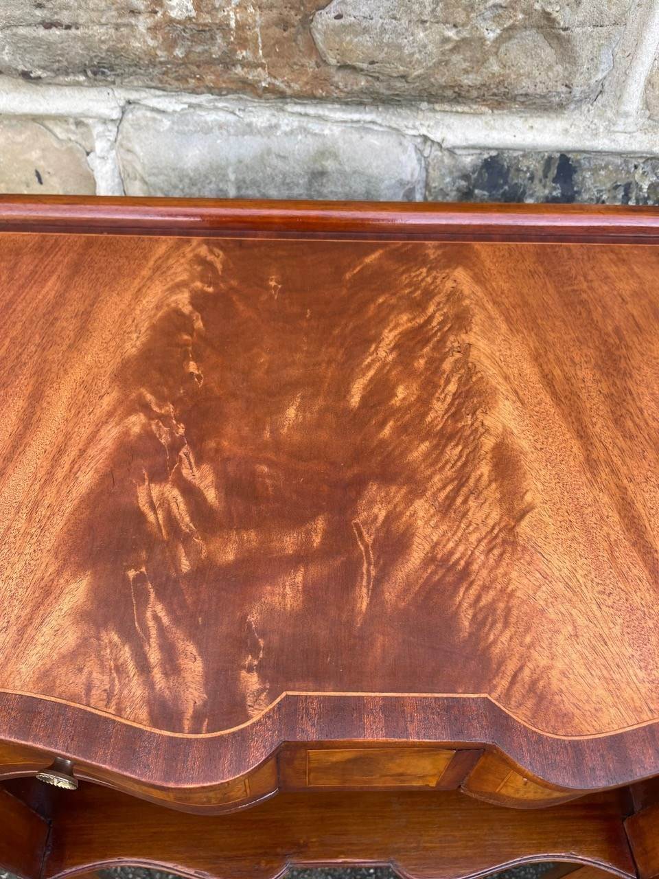 In mahogany, inverted serpentine fronts, raised gallery back, single inlaid draw with brass knobs, open storage area, standing on slender tapering mahogany legs. Polished mahogany sides & solid back.