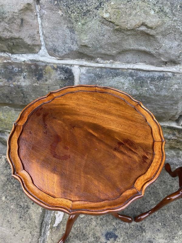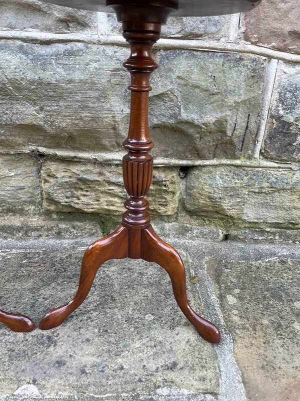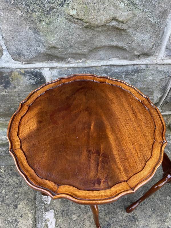 Round flamed mahogany top with a pie crust edge, upon a turned column with 3 shaped legs.