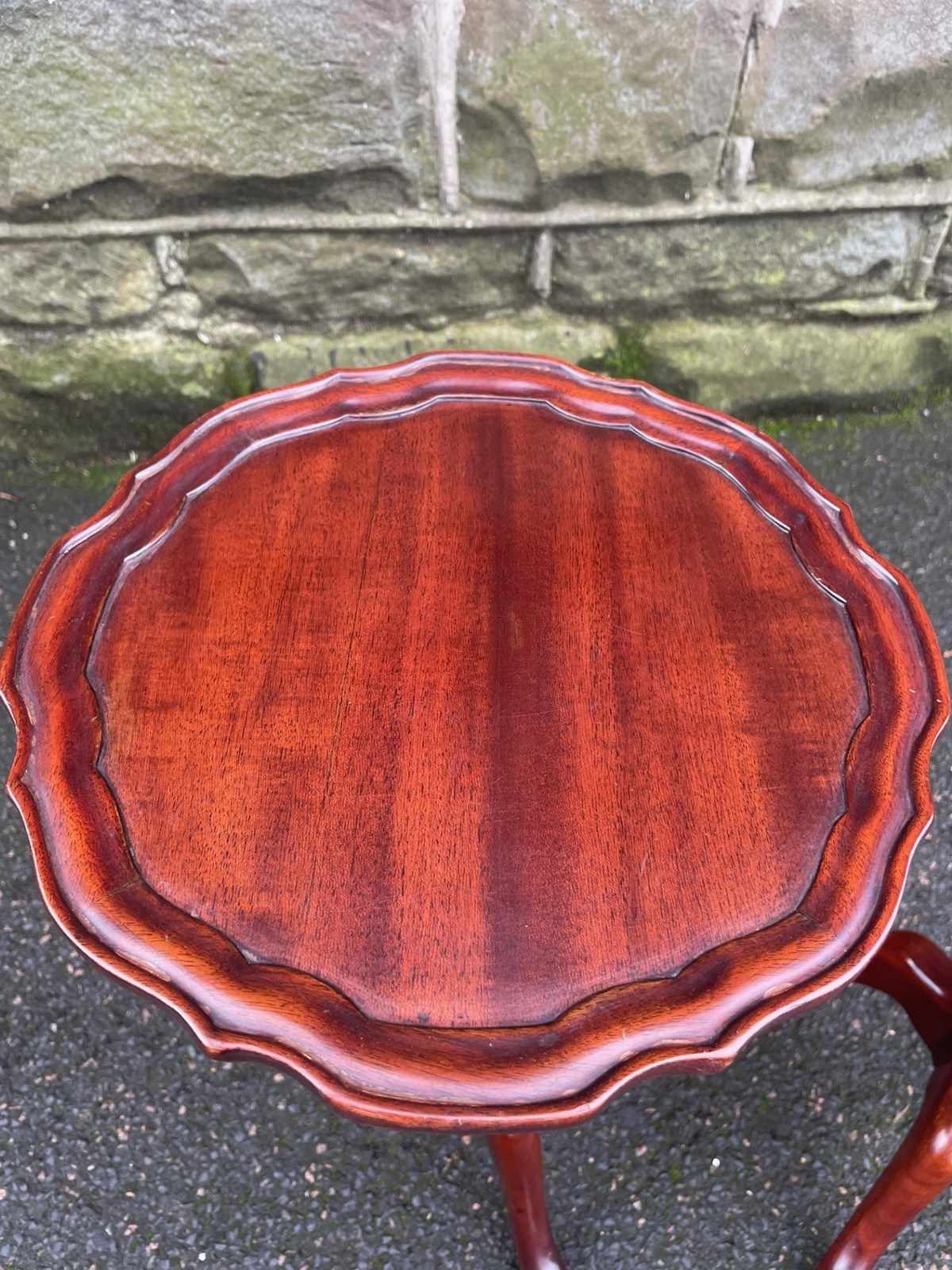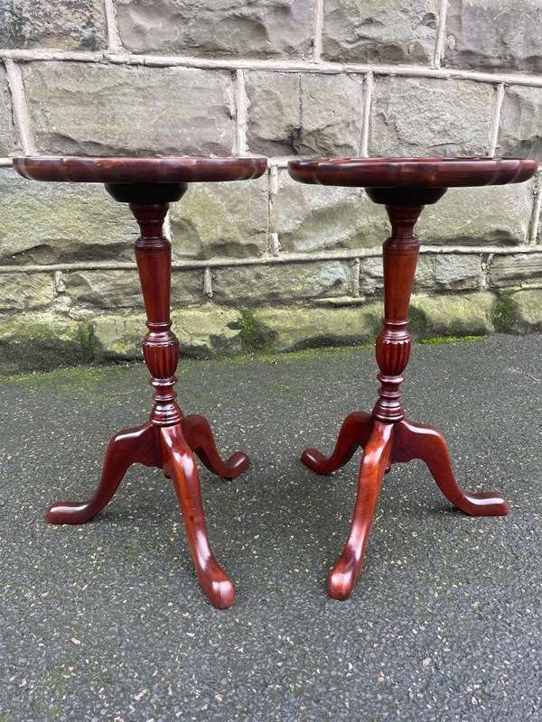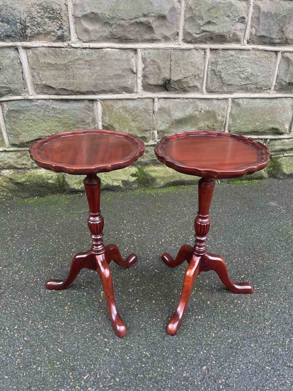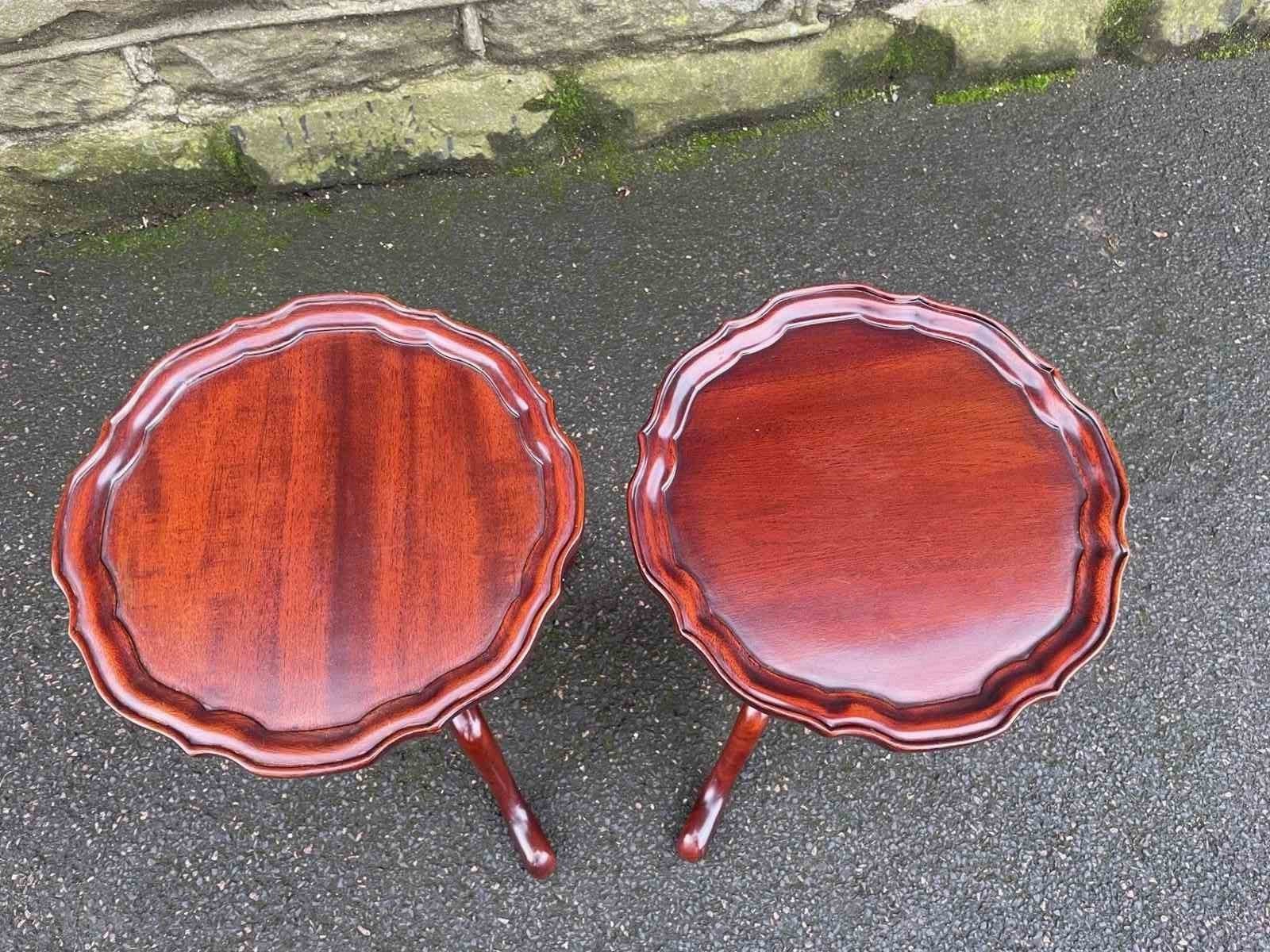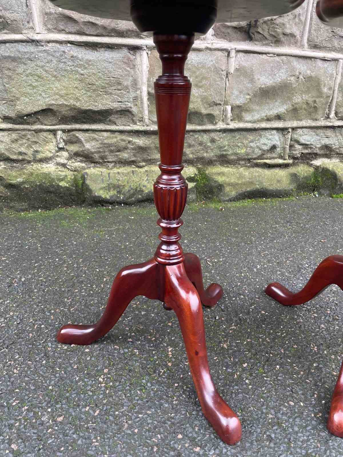 Round mahogany tops with a pie crust edge, upon a turned column with 3 shaped legs.