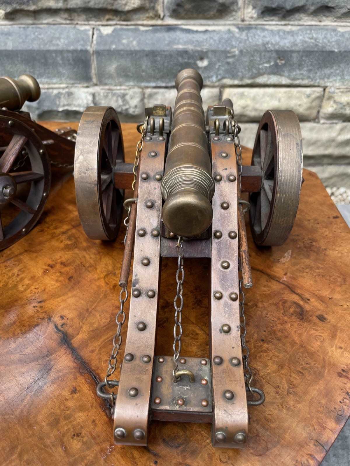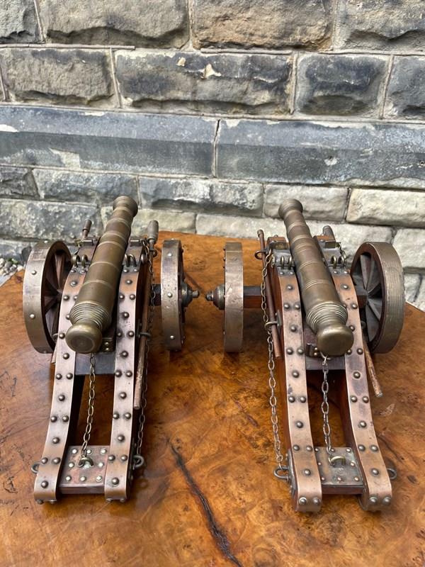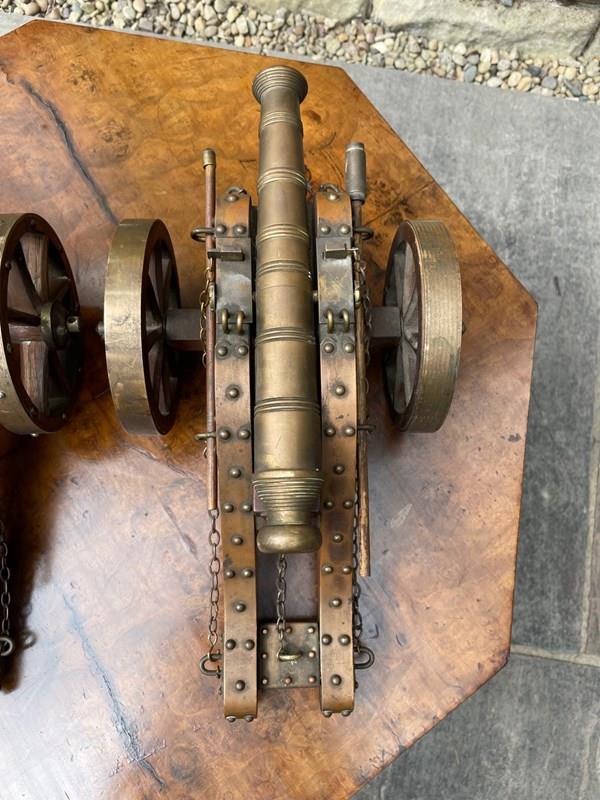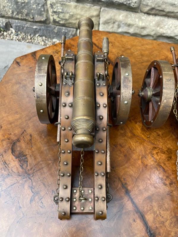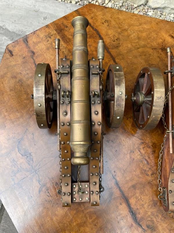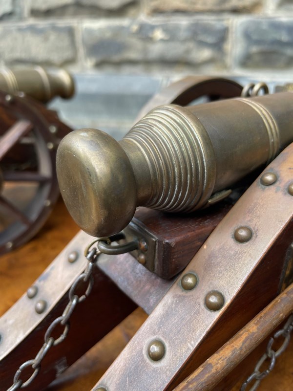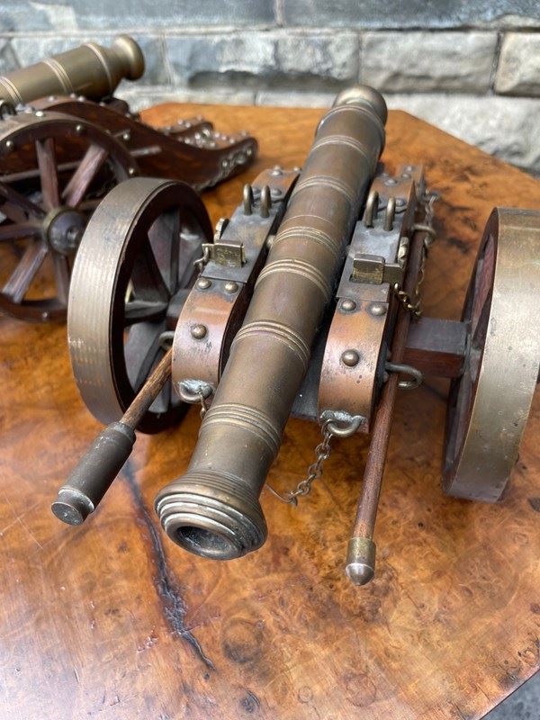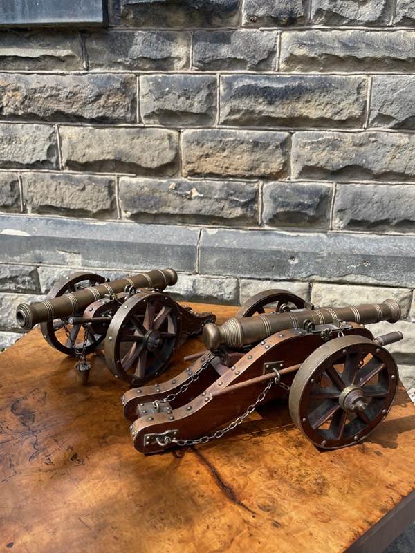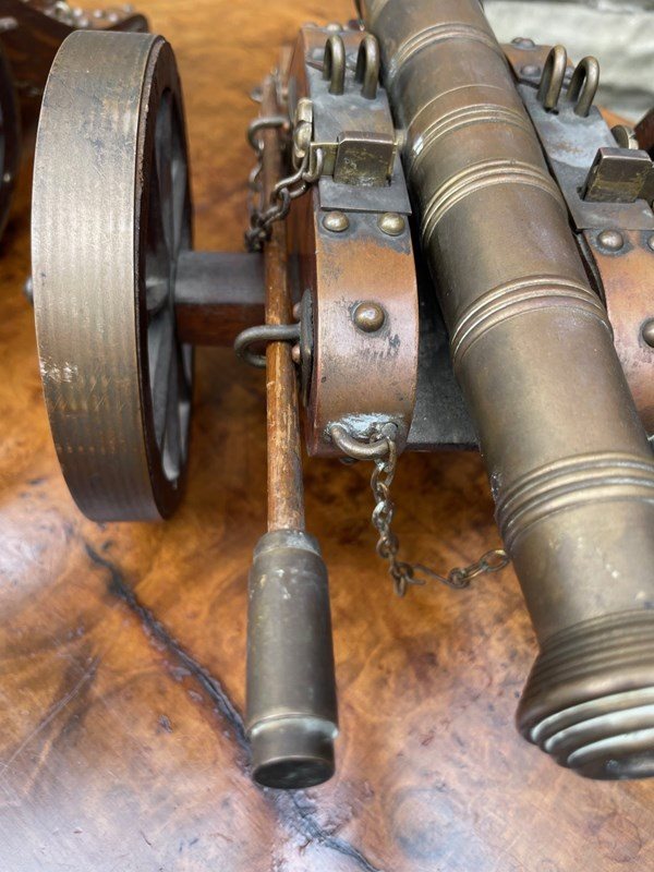 Scratch built to a high standard quality. The oak trucks with brass embellishments, oak wheels with brass rims, the barrels look to be bronze. They have removeable ram rods to each side