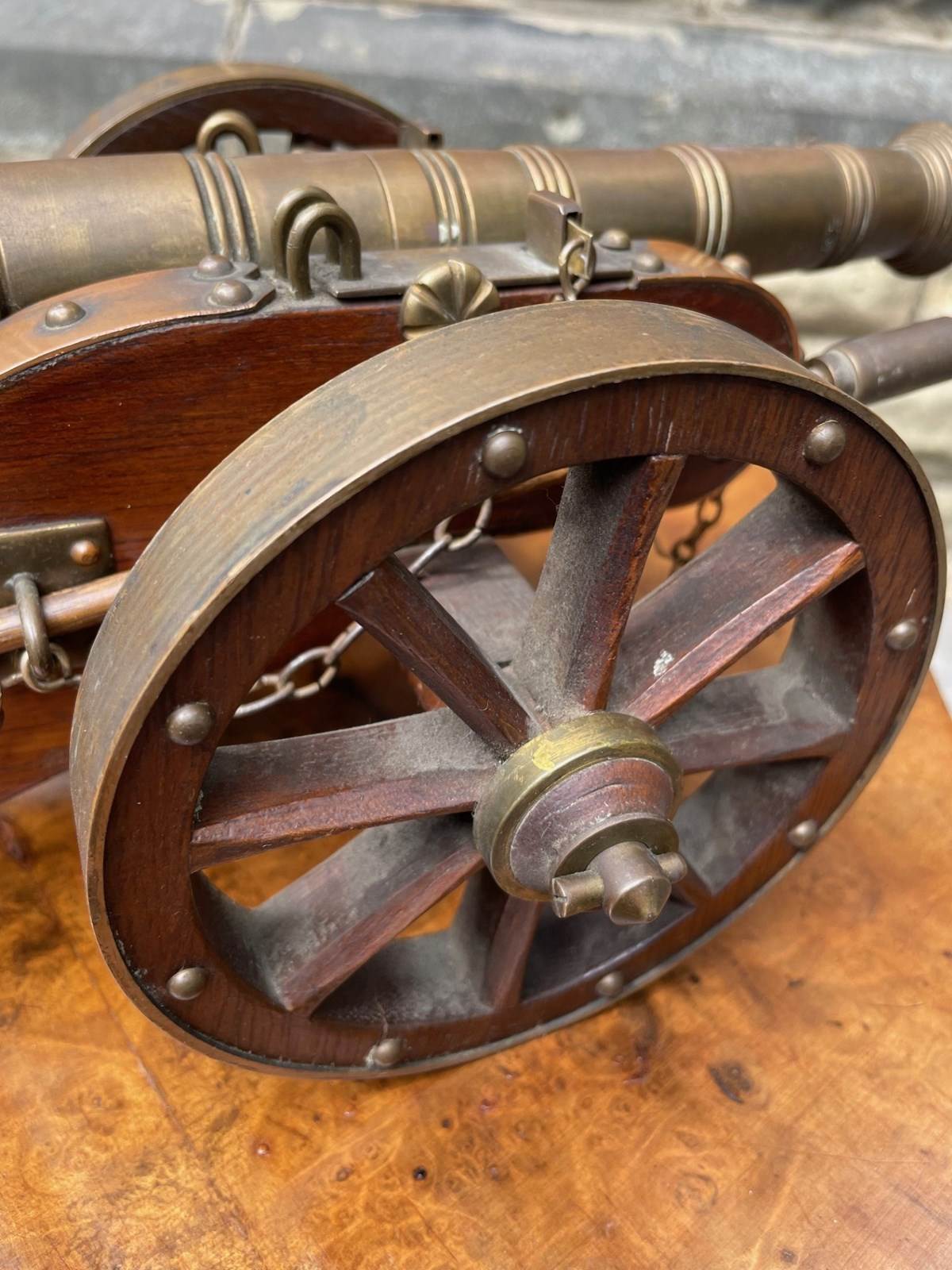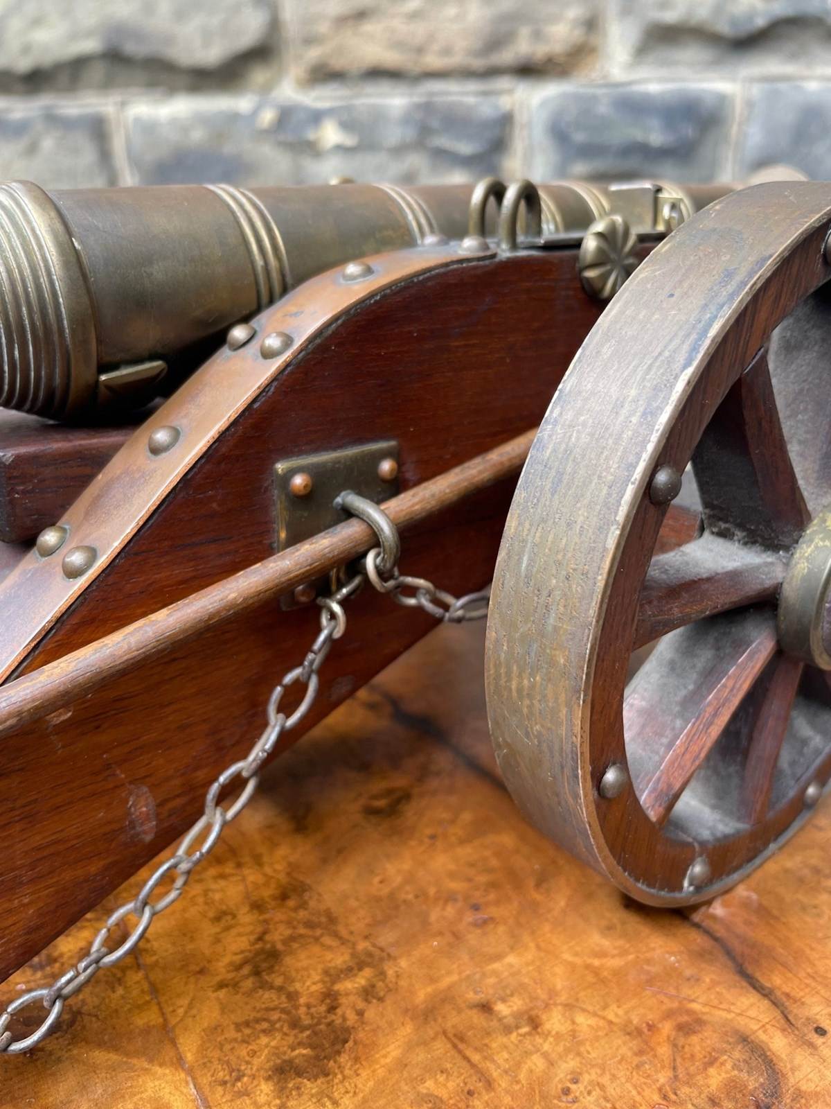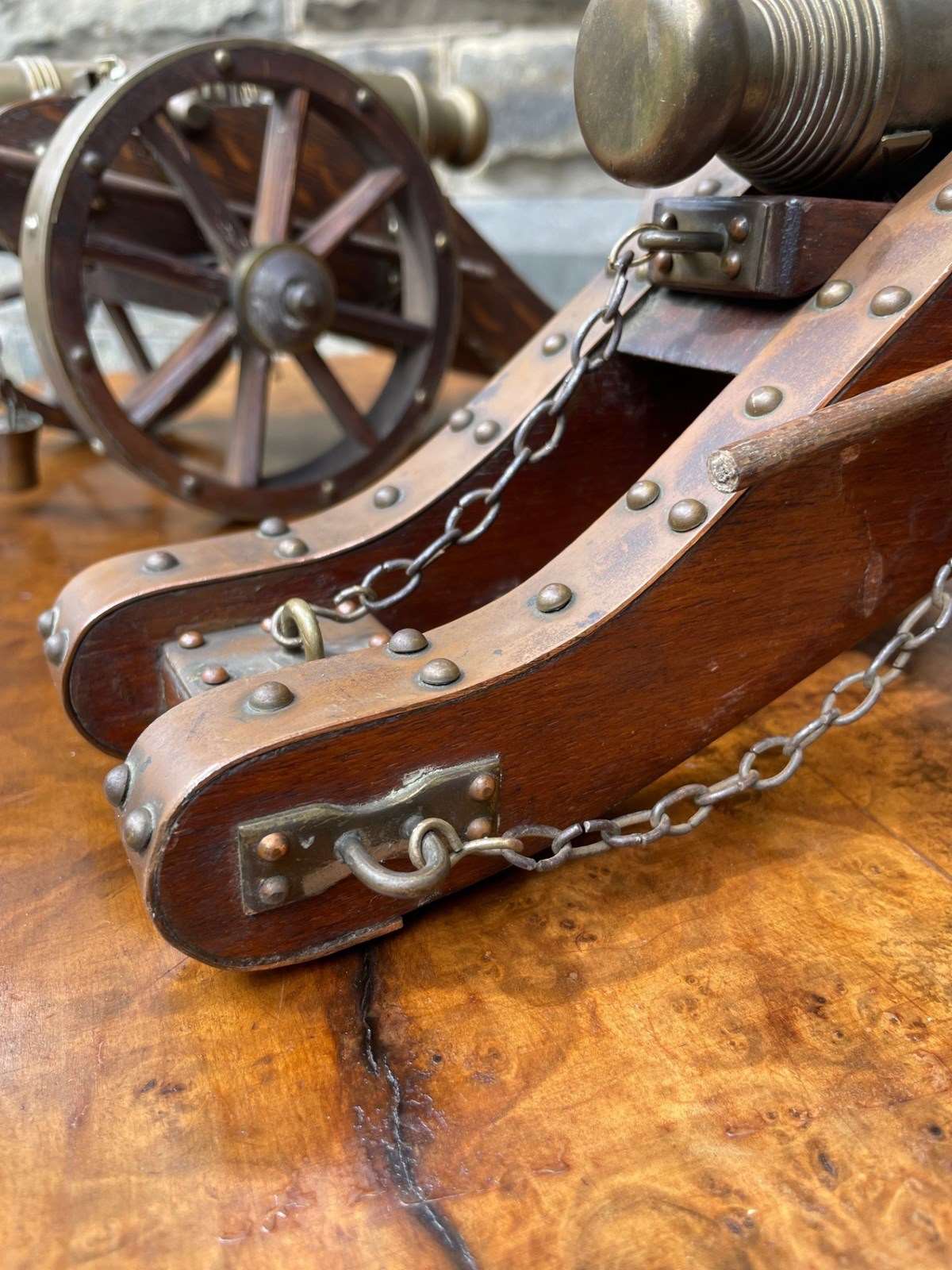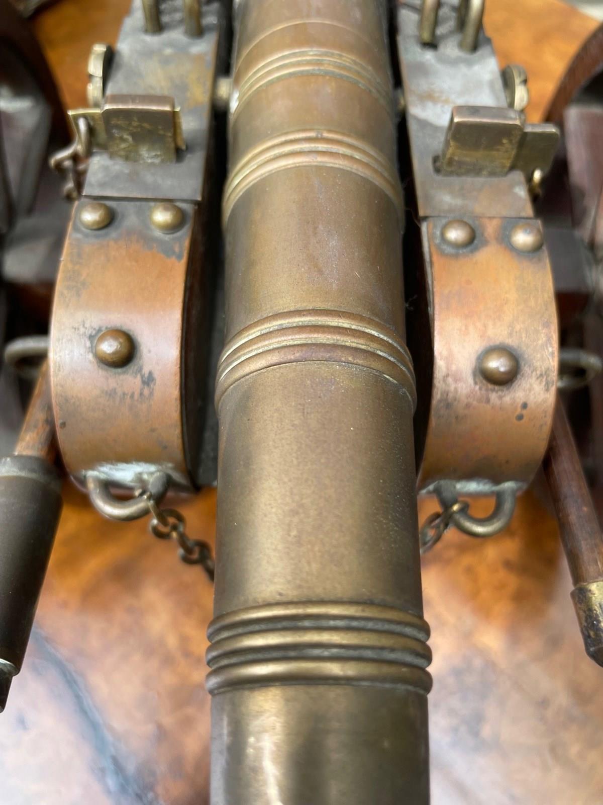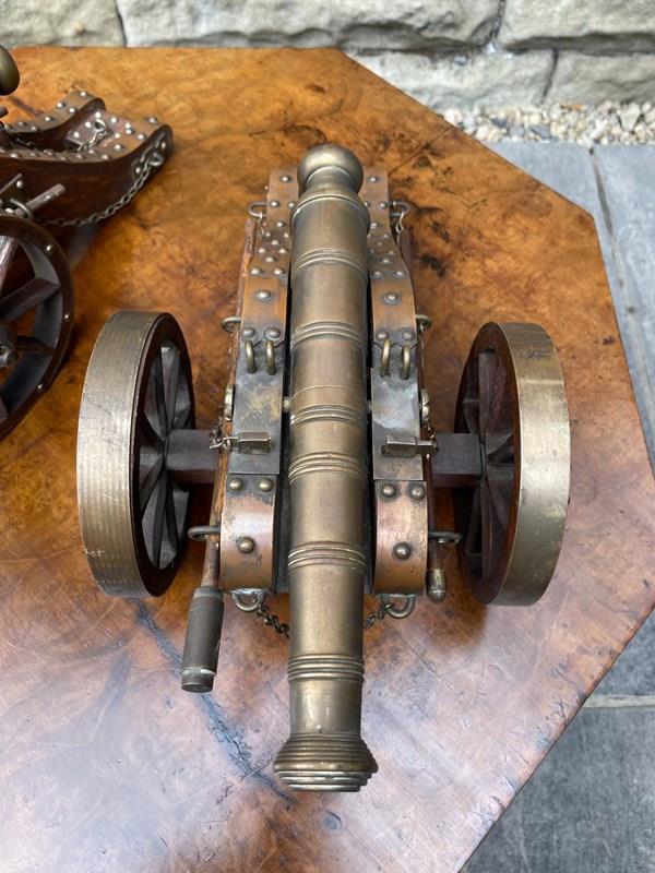 Scratch built to a high standard quality. The oak trucks with brass embellishments, oak wheels with brass rims, the barrels look to be bronze. They have removeable ram rods to each side