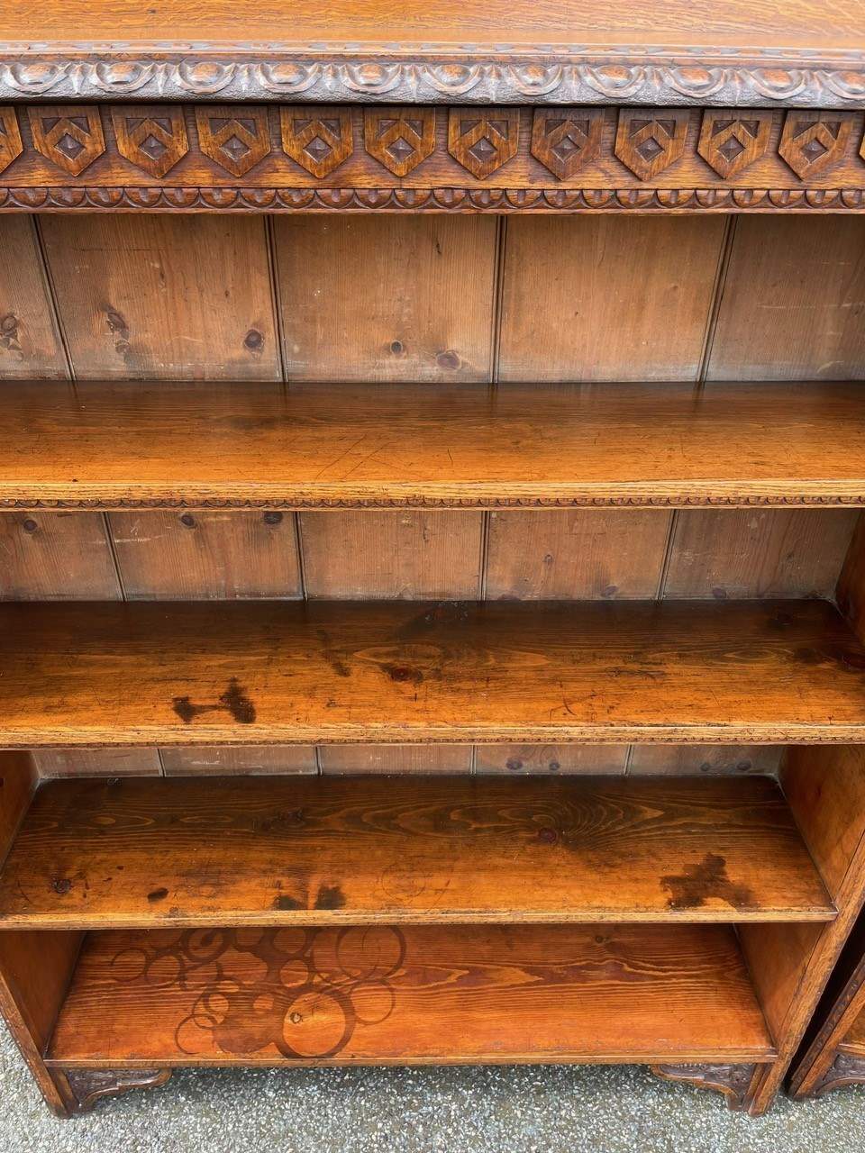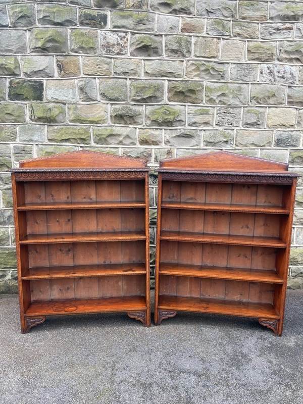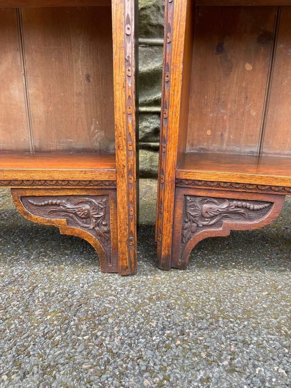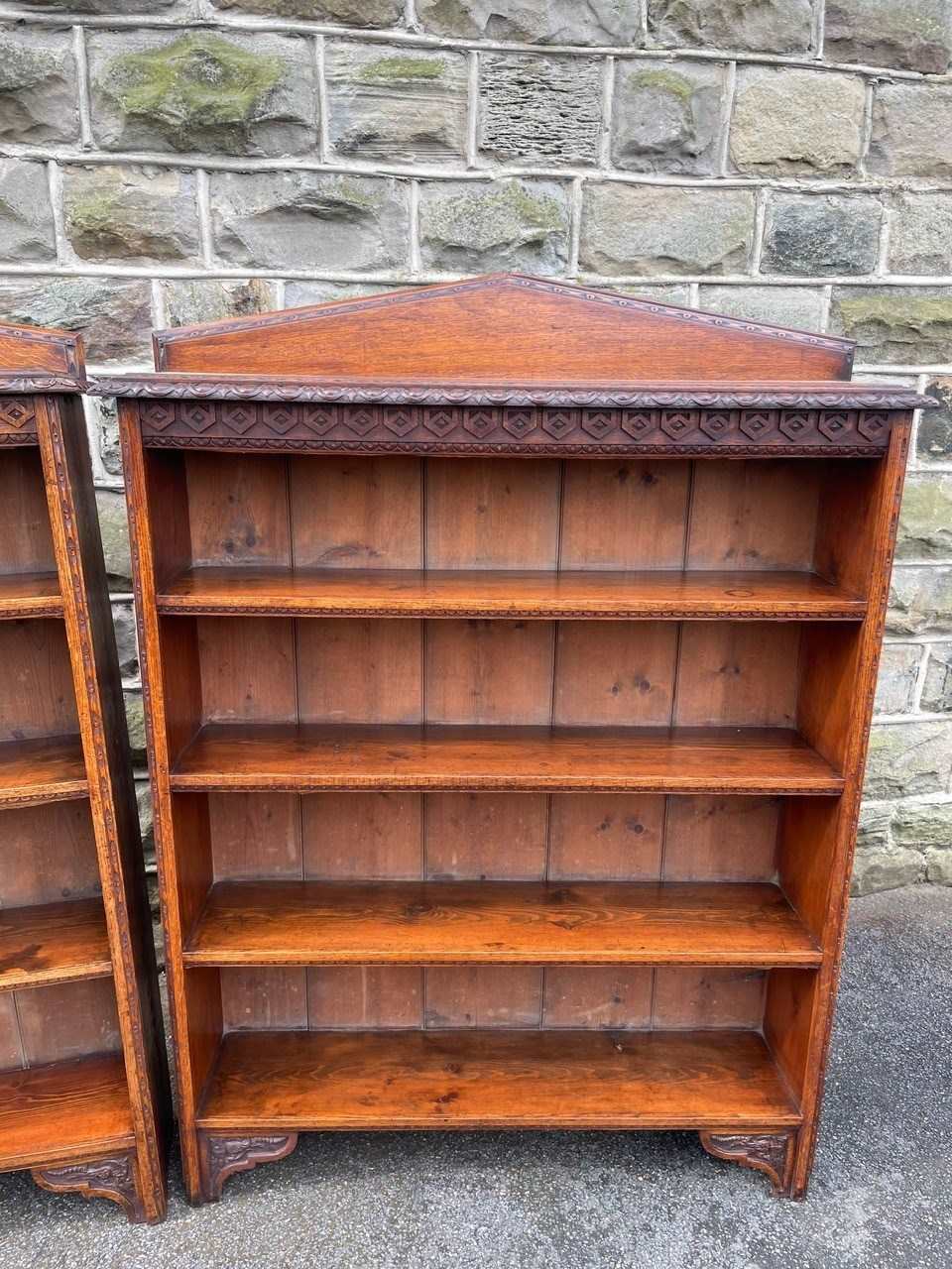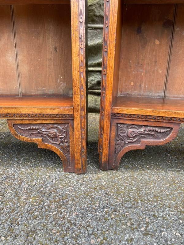 Very good size & scale, in oak have raised gallery backs, carved decoration to the edge around the top and across the frieze. Solid fixed height shelves with carved detail Polished sides and solid backs. Nice carved decoration to the feet. Great colour and shine.