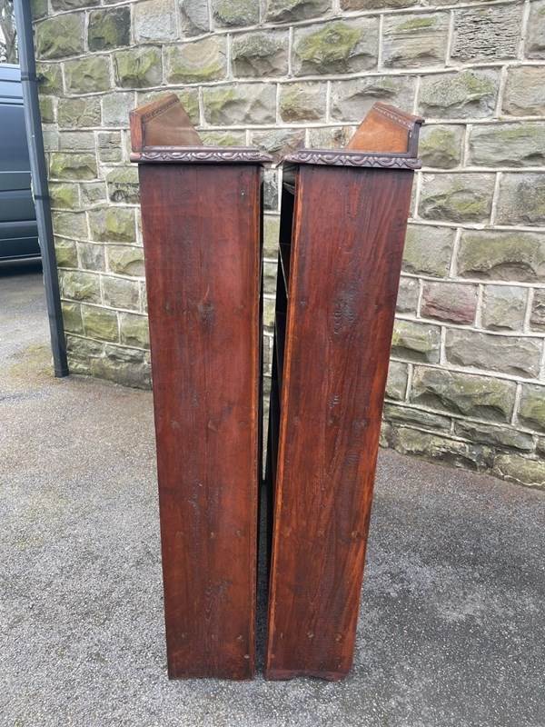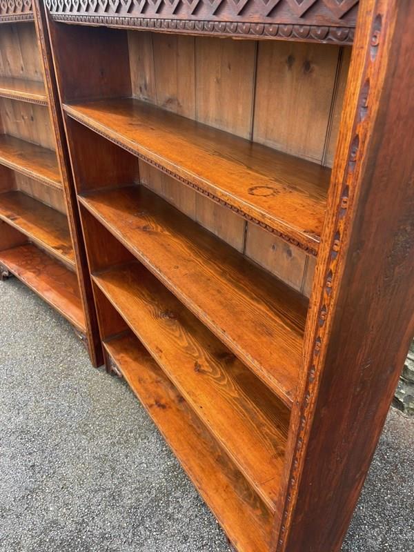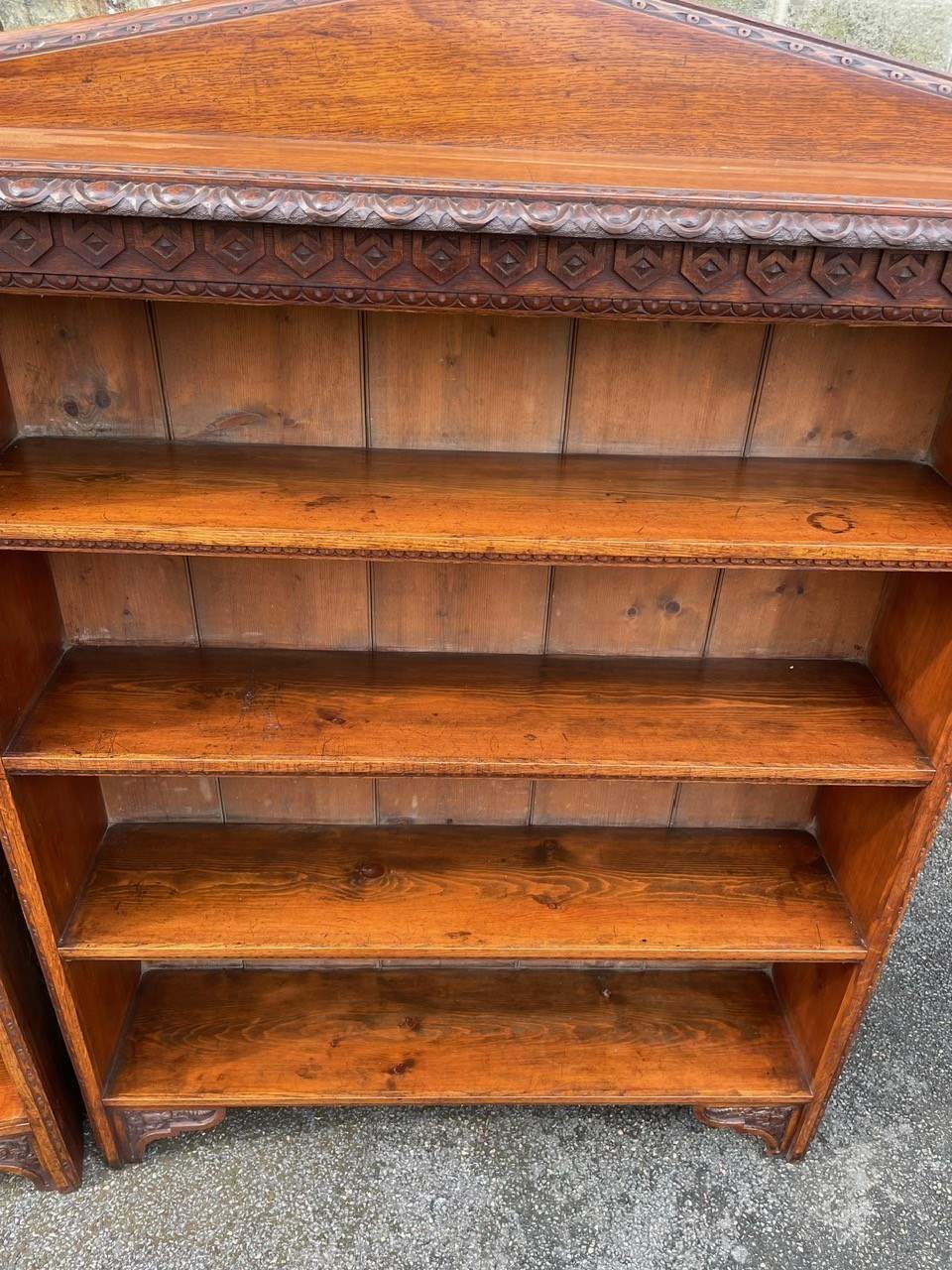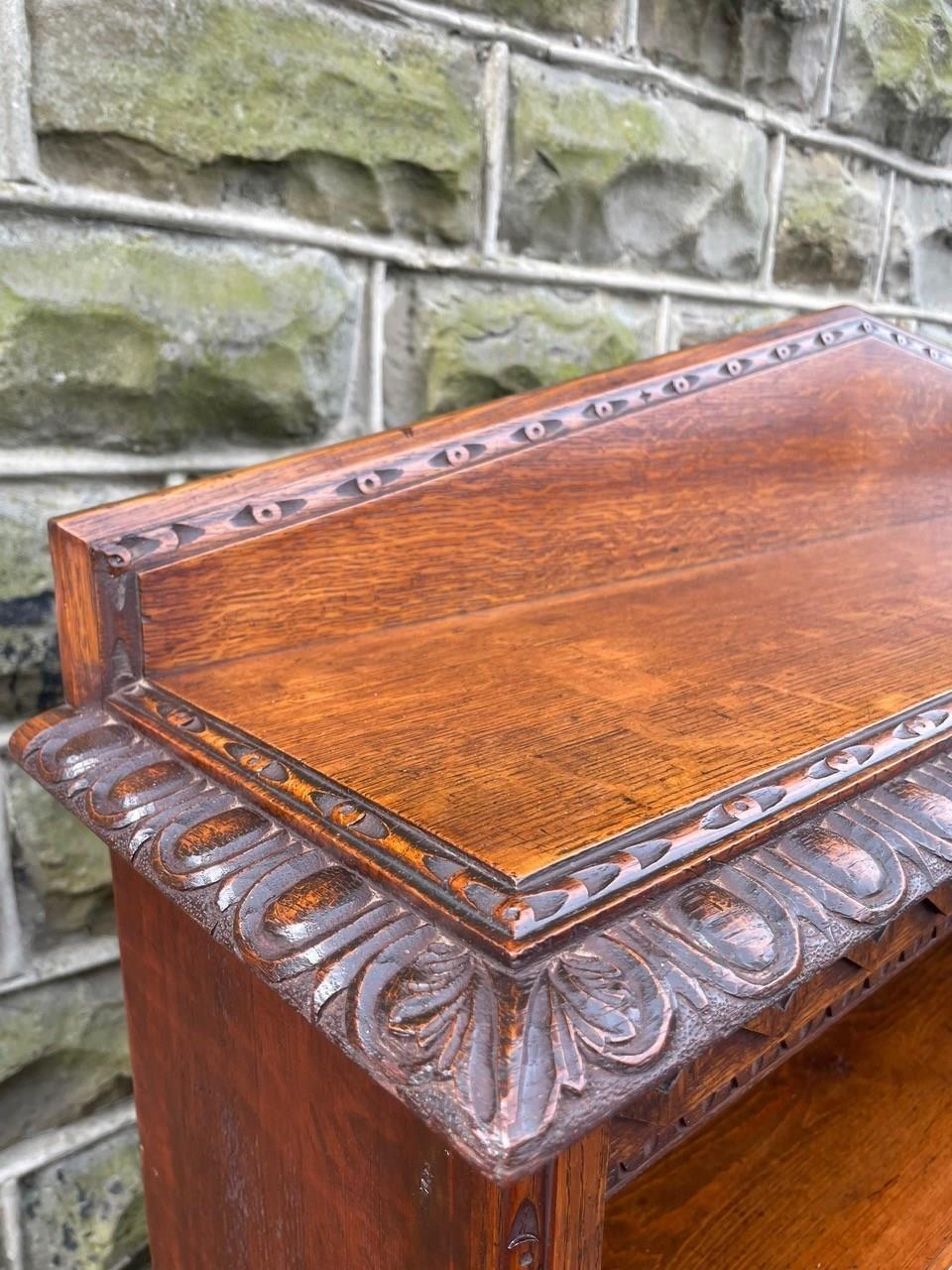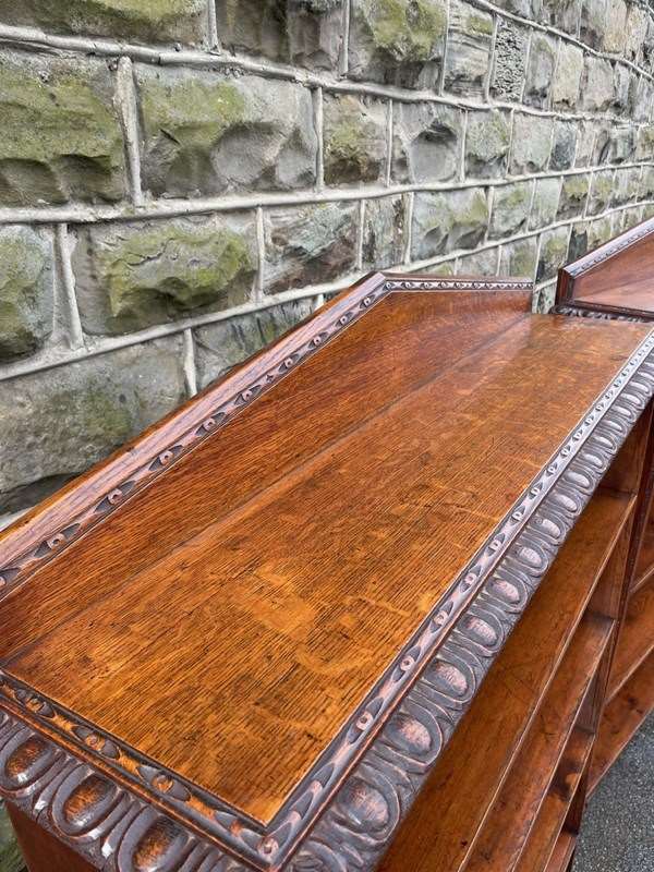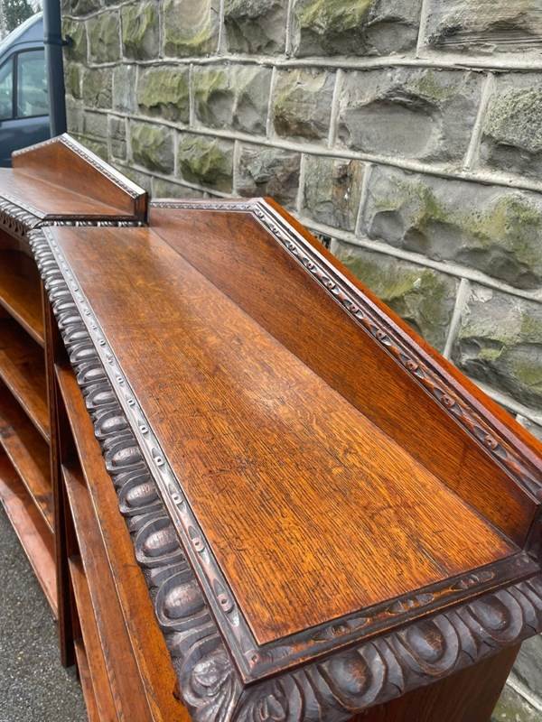 Very good size & scale, in oak have raised gallery backs, carved decoration to the edge around the top and across the frieze. Solid fixed height shelves with carved detail Polished sides and solid backs. Nice carved decoration to the feet. Great colour and shine.