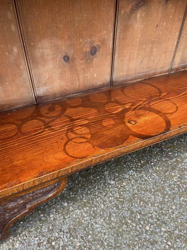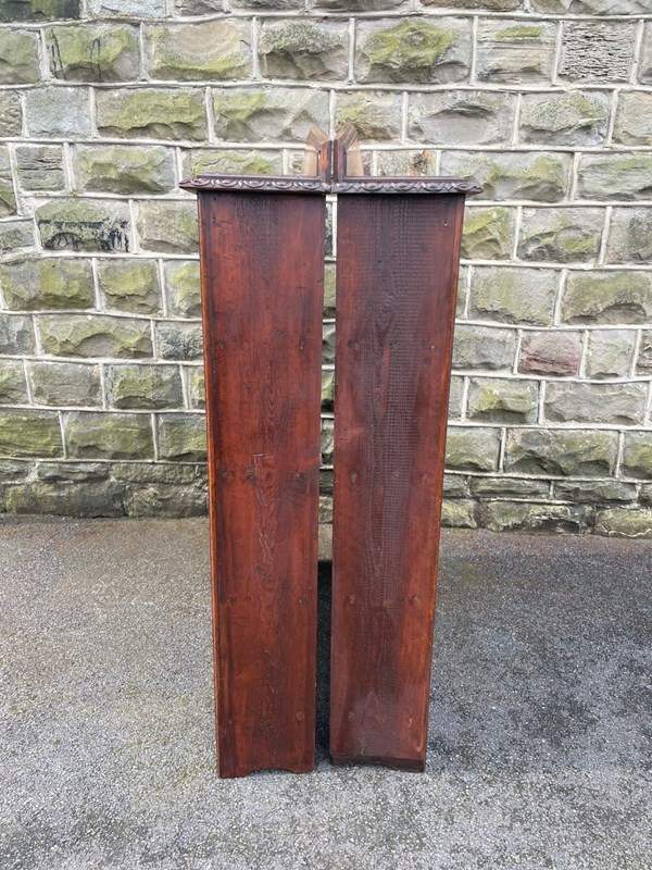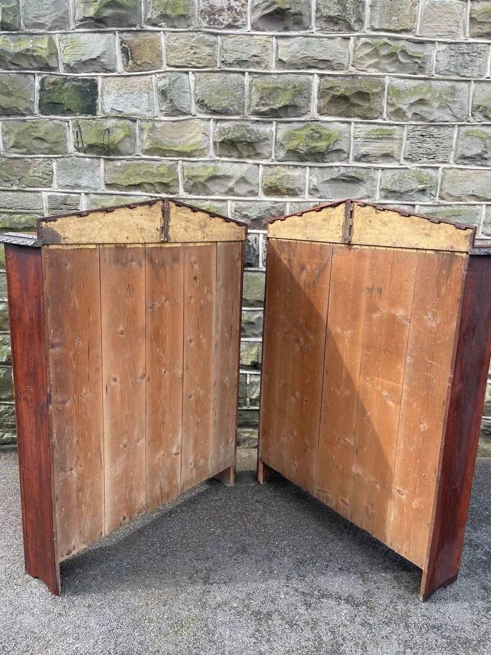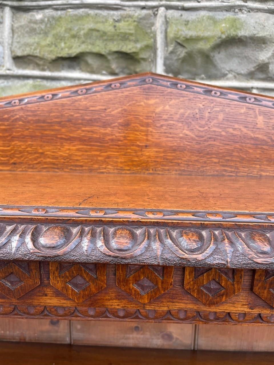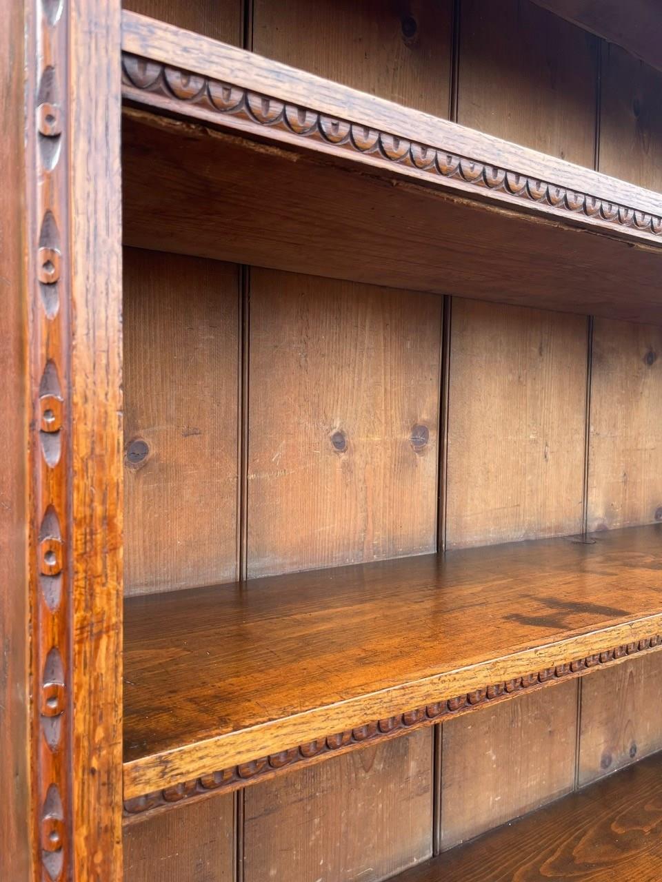 Very good size & scale, in oak have raised gallery backs, carved decoration to the edge around the top and across the frieze. Solid fixed height shelves with carved detail Polished sides and solid backs. Nice carved decoration to the feet. Great colour and shine.