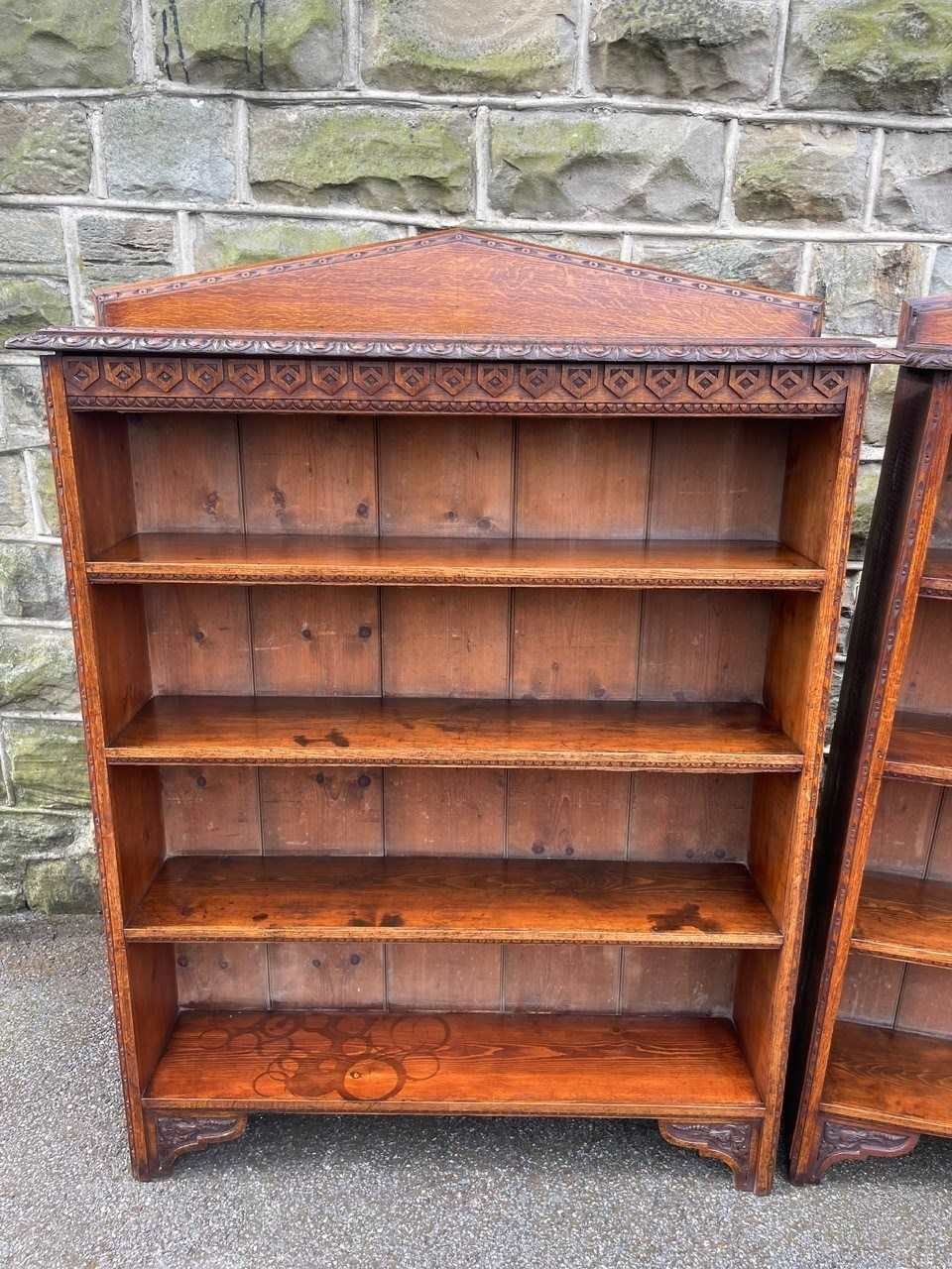 Offered for sale is this good pair of antique carved oak open library bookcase