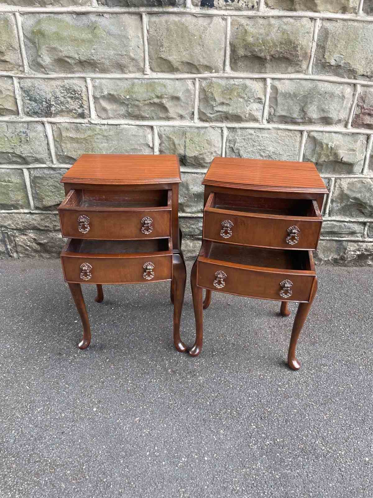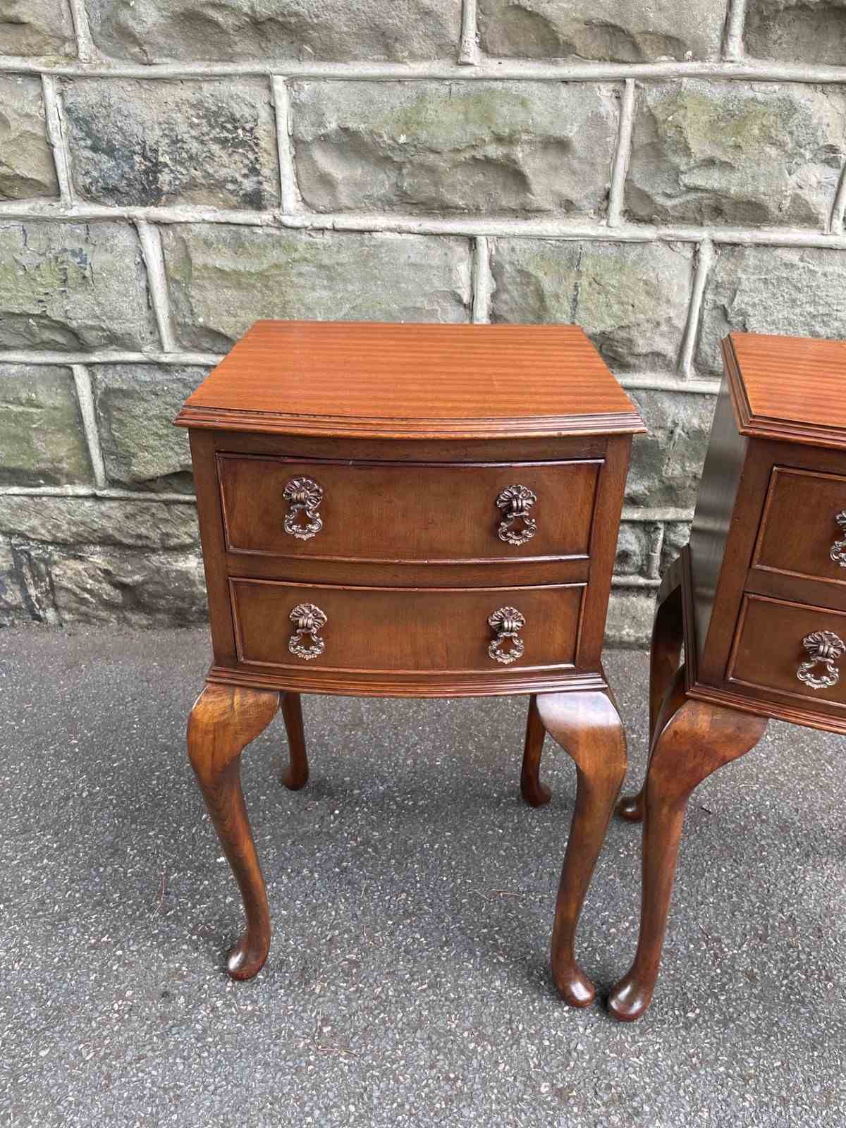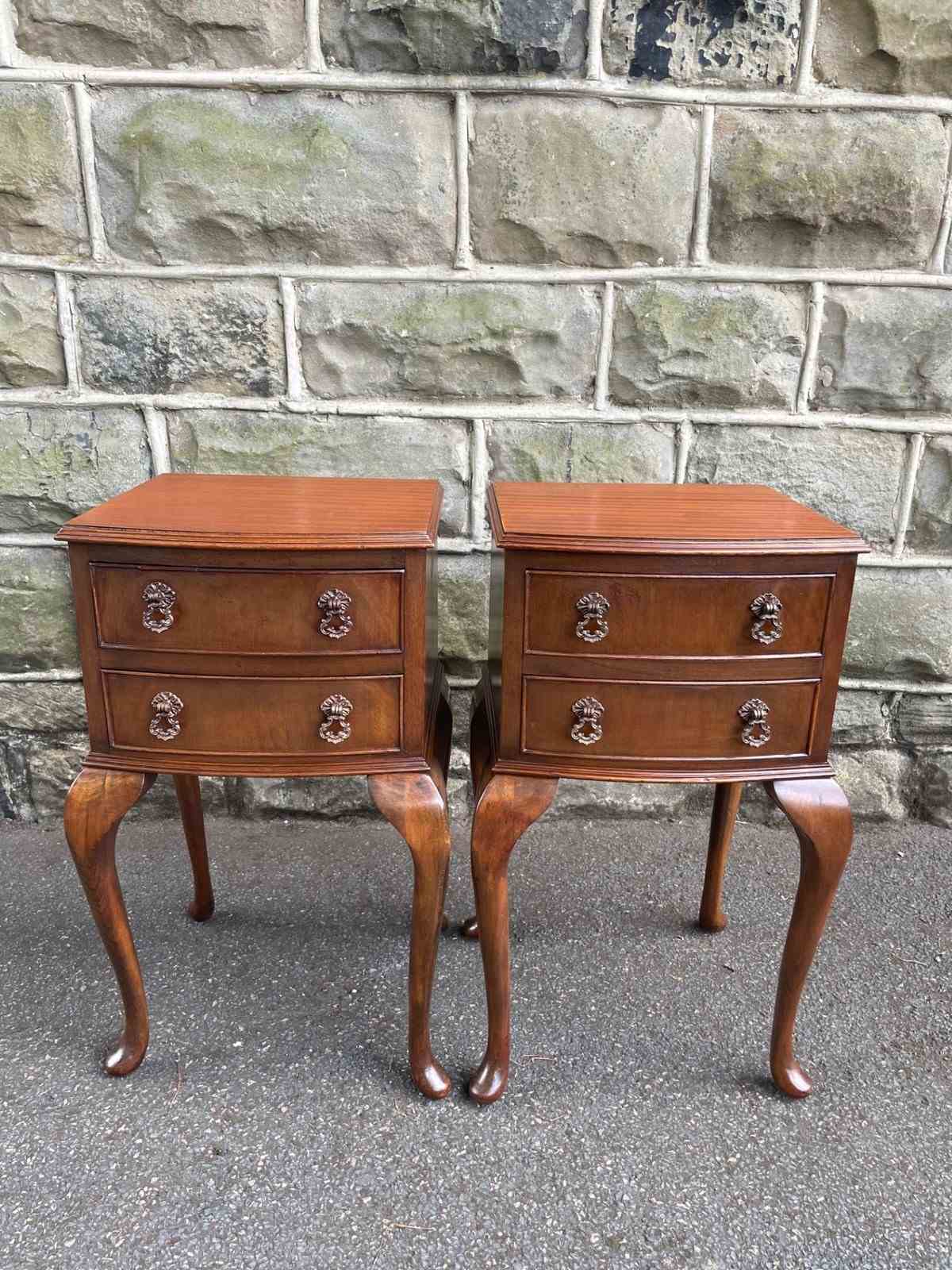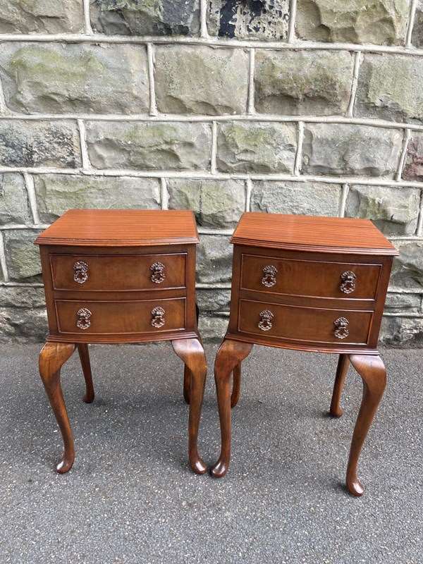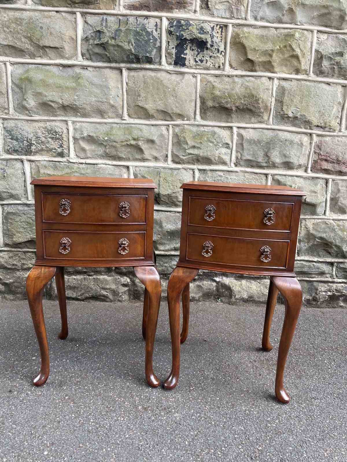 In walnut having bow fronts, 2 draws with ornate brass drops handles, polished walnut sides, solid backs standing on walnut cabriole legs