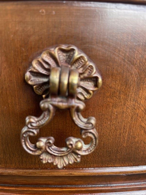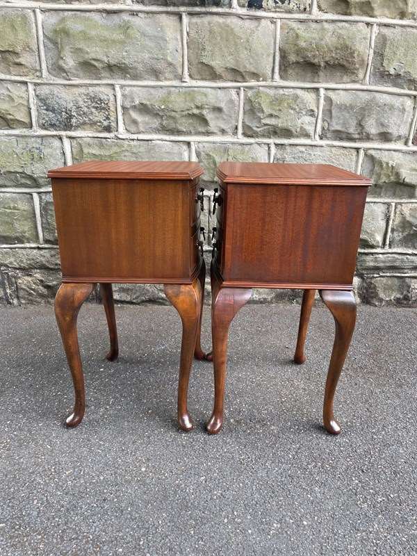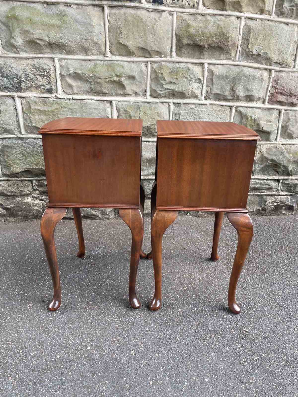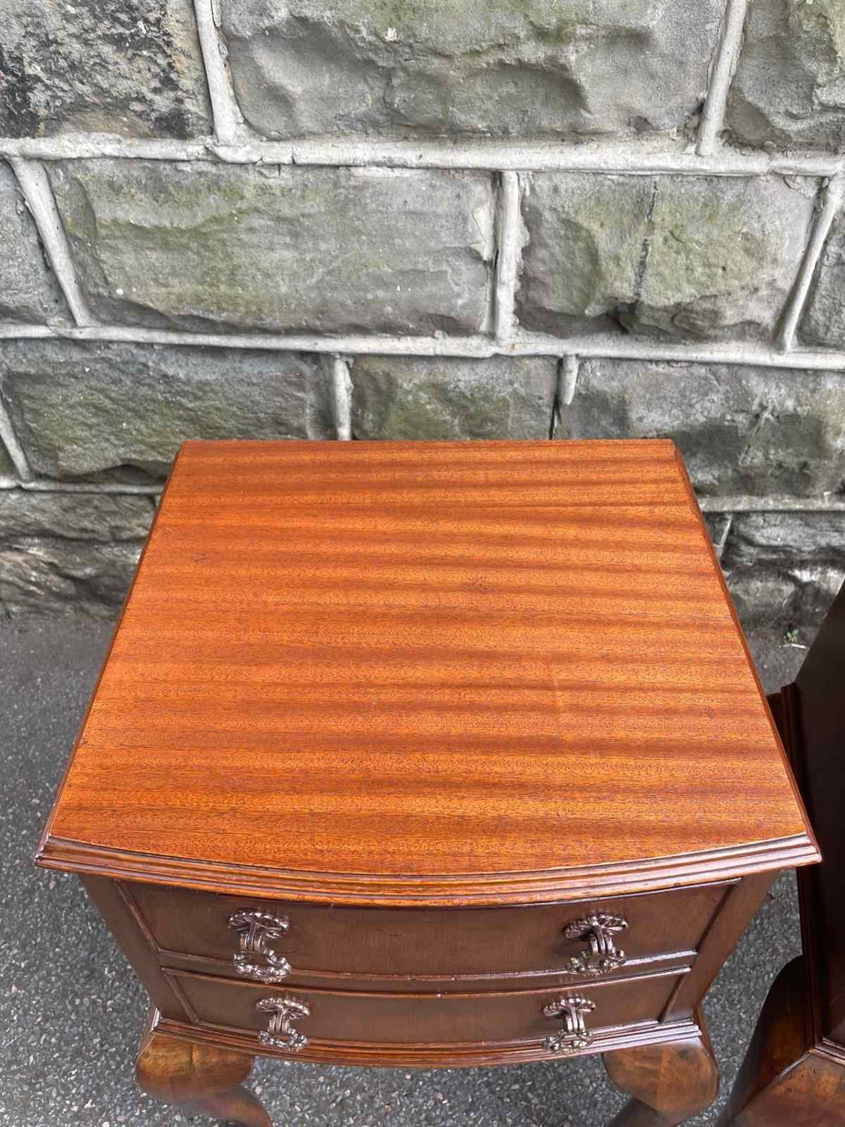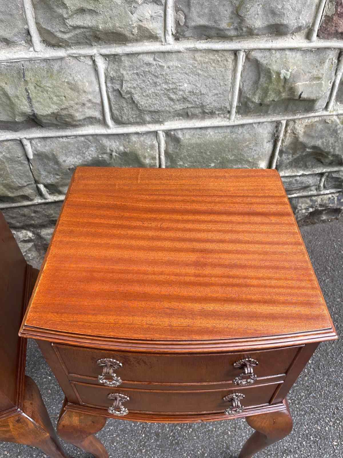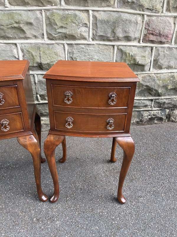 In walnut having bow fronts, 2 draws with ornate brass drops handles, polished walnut sides, solid backs standing on walnut cabriole legs