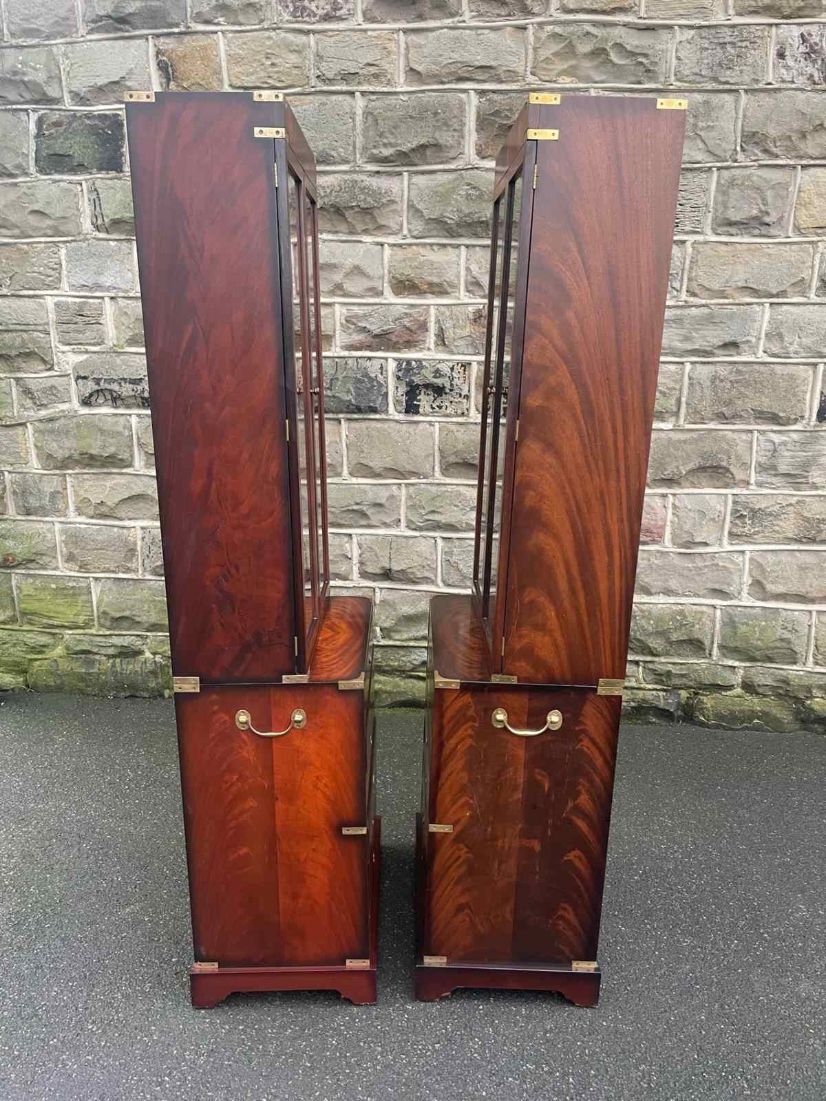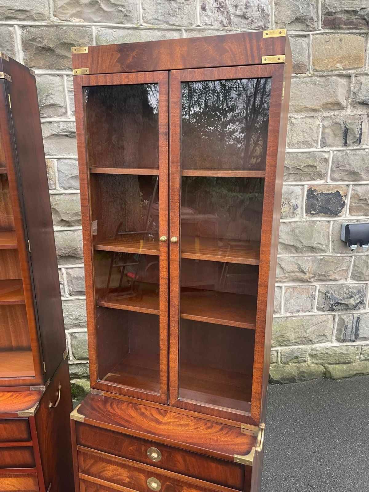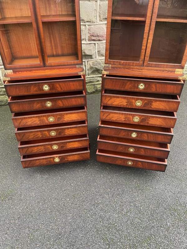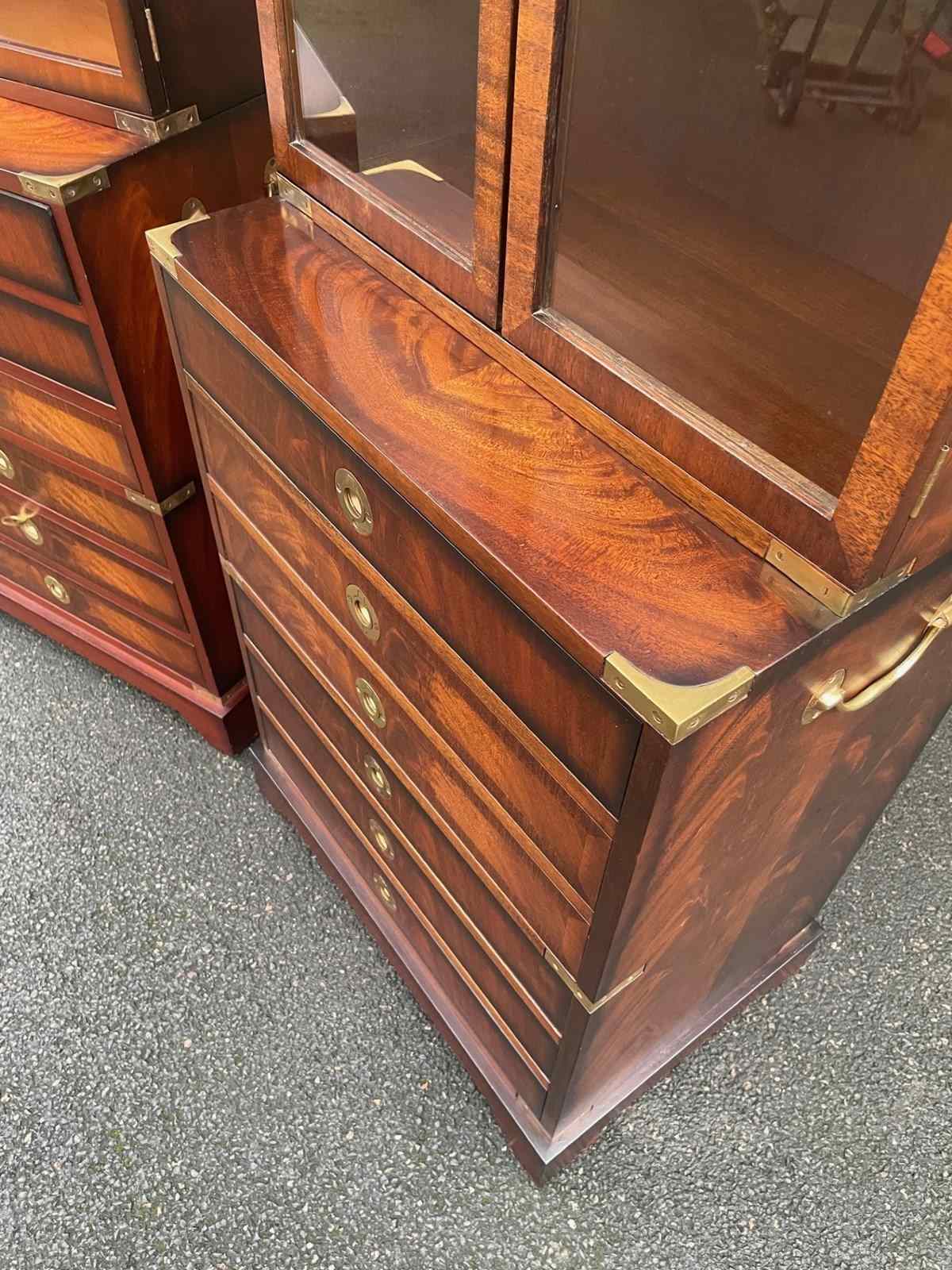 In the military campaign style, mahogany with brass bound corner mounts. Bookcase top with glazed doors, 3 internal shelves. The chests having 6 draws with brass recessed ring handles. Polished mahogany sides with brass side carrying handles. Standing on bracket feet. (2 draws are mixed up on the chests in the images top 2 on the right chest should go in the left chest and the 2nd & 3rd draws on the left chest vice versa)