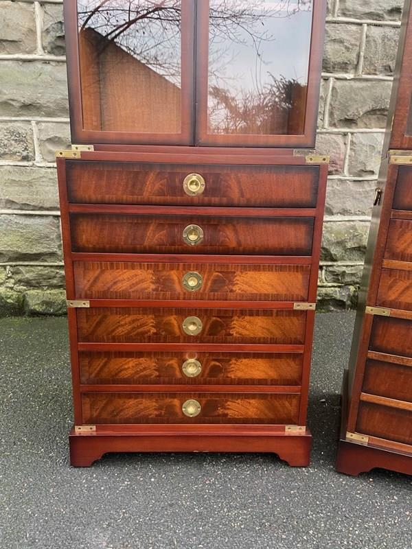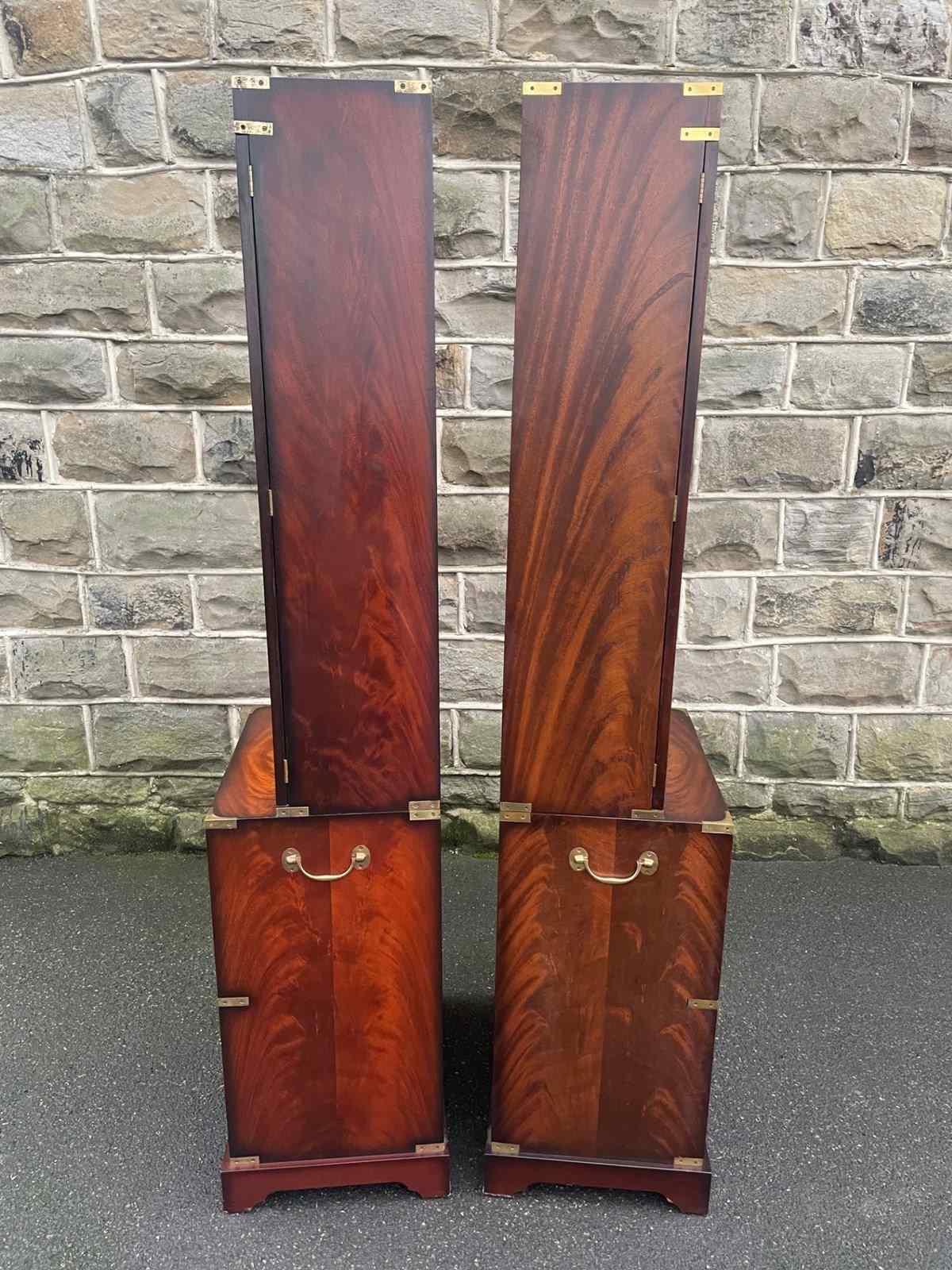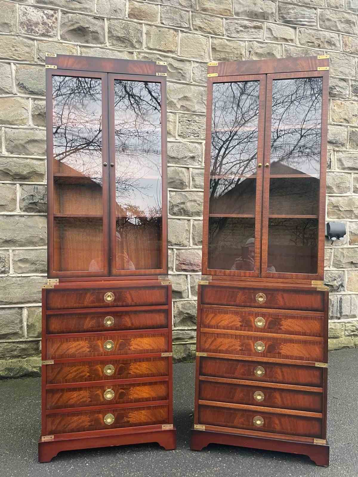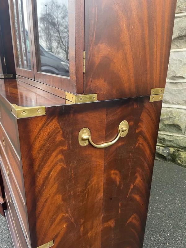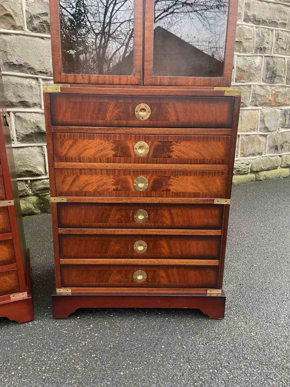 In the military campaign style, mahogany with brass bound corner mounts. Bookcase top with glazed doors, 3 internal shelves. The chests having 6 draws with brass recessed ring handles. Polished mahogany sides with brass side carrying handles. Standing on bracket feet. (2 draws are mixed up on the chests in the images top 2 on the right chest should go in the left chest and the 2nd & 3rd draws on the left chest vice versa)