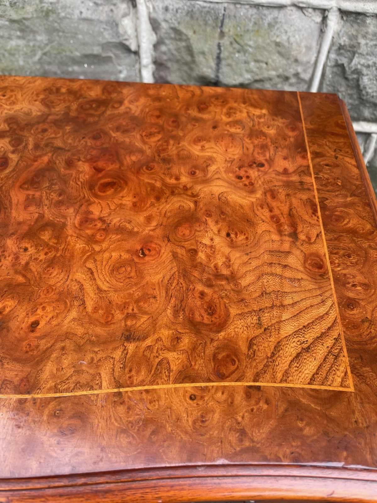 In burr walnut, serpentine fronts with 4 draws, ornate brass drop handles, polished walnut side standing on bracket feet