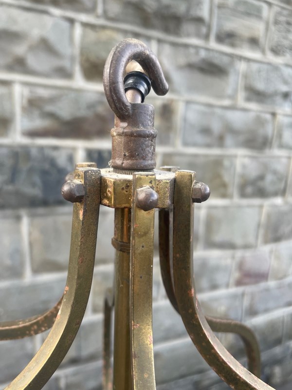 Nice large size. Each has rose, 6 scrolling arms with central brass rod which supports the 3 branch light. Glass individual panels, turned brass ball feet. Brass hanging hook.