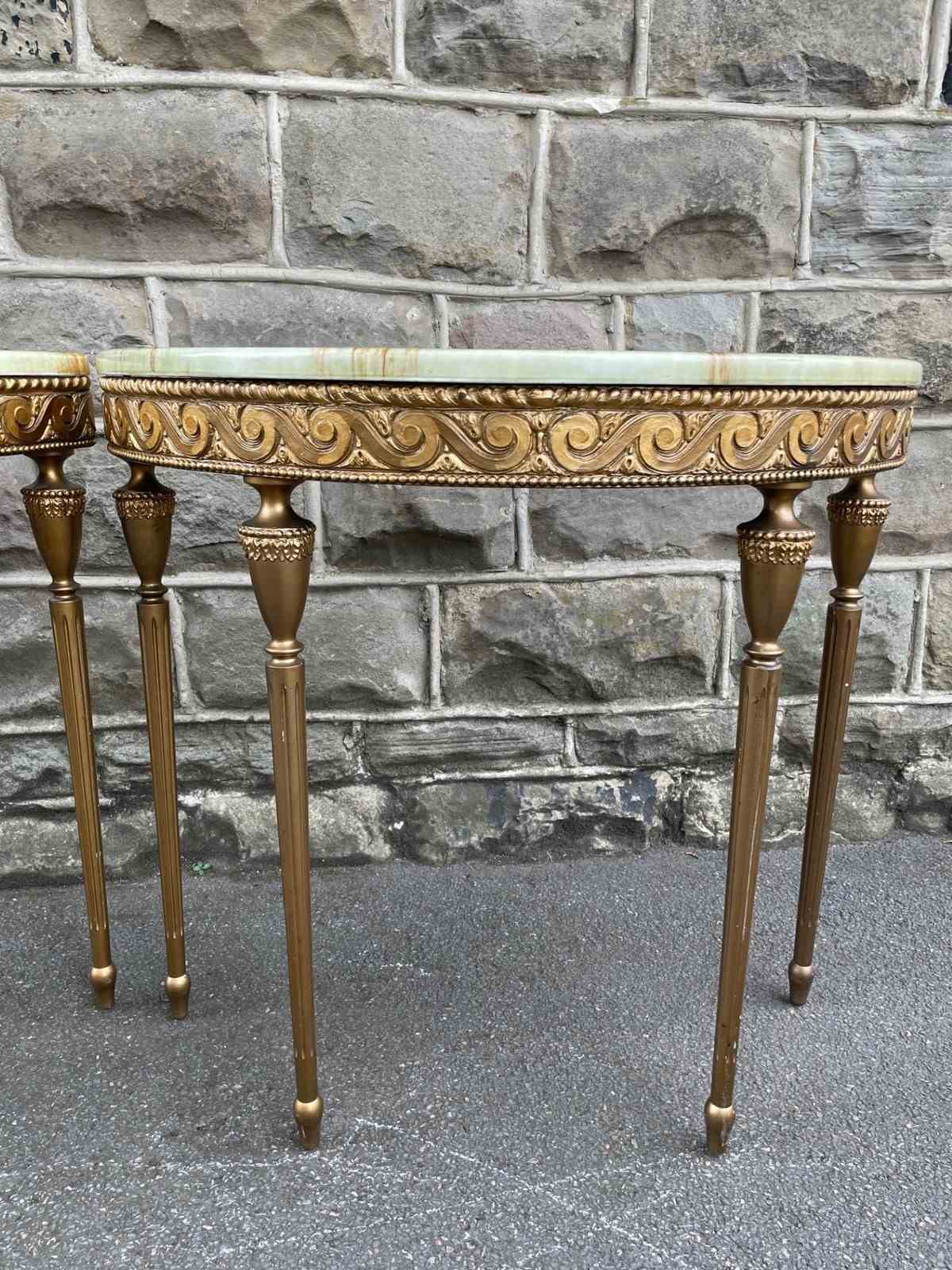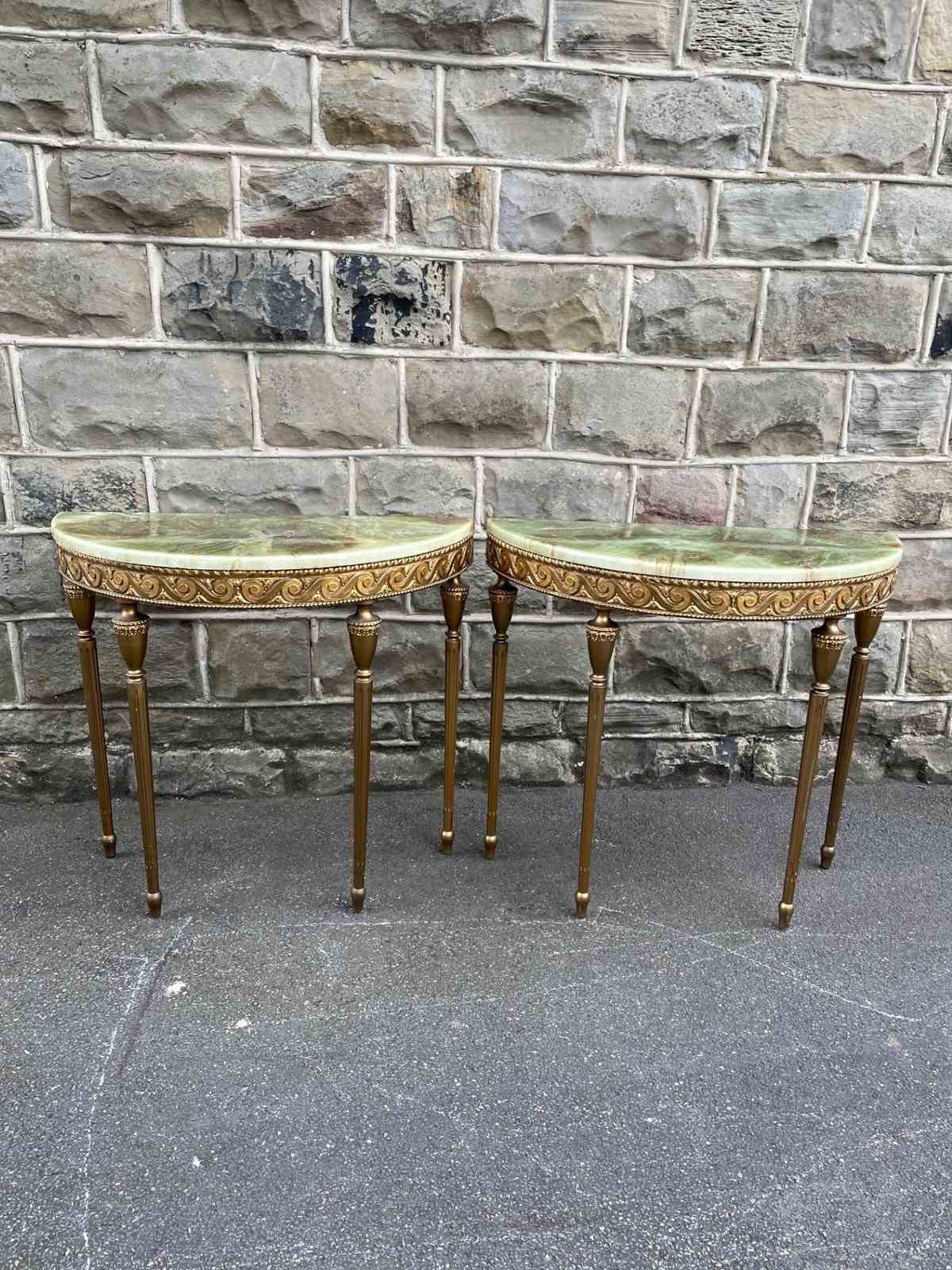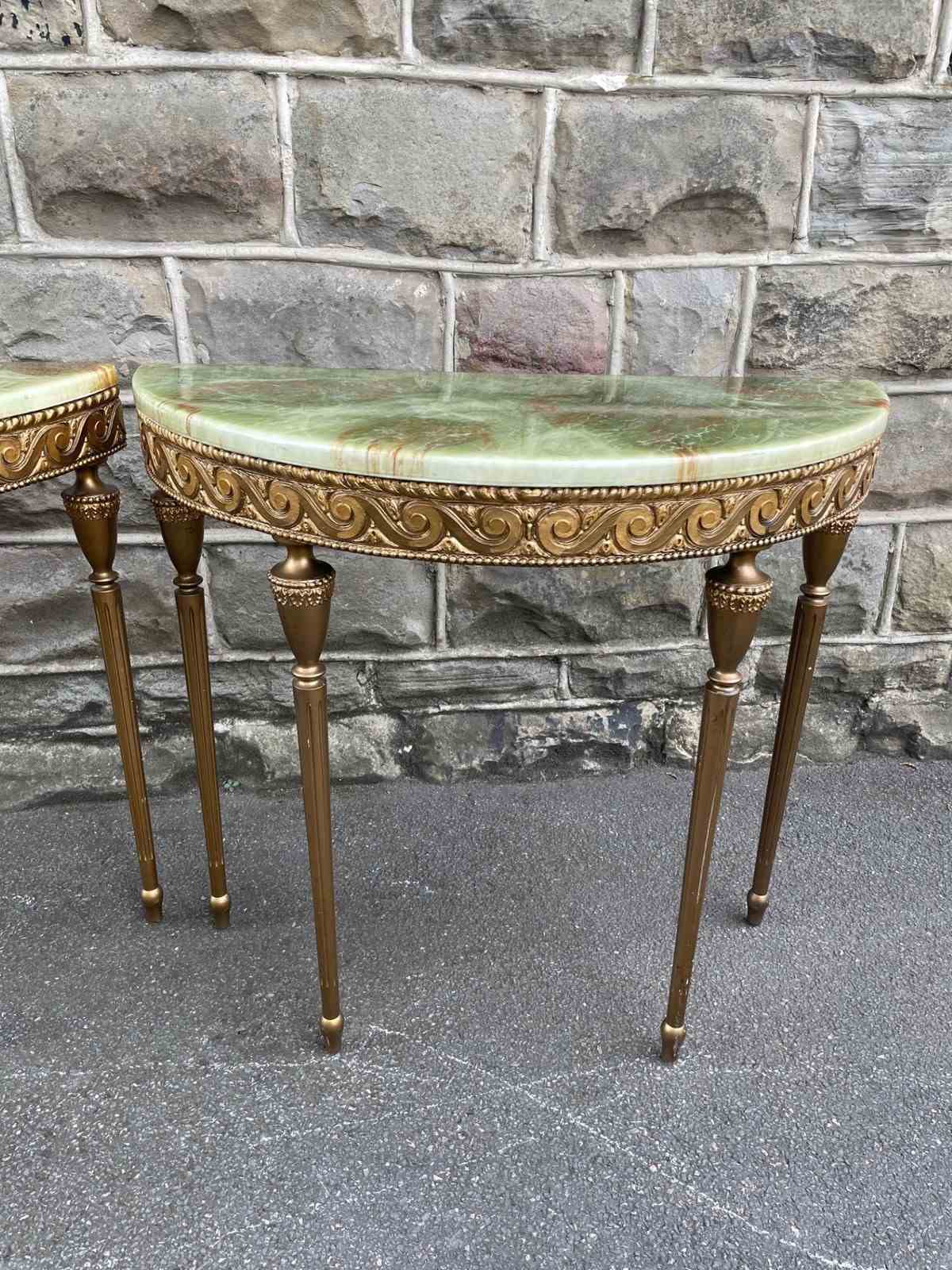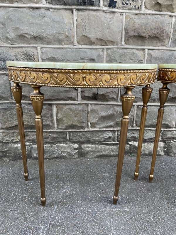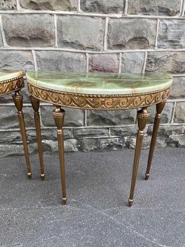 In the Adams style, demi lune shape having green onyx tops with gilt wood bases, standing on turned reeded legs