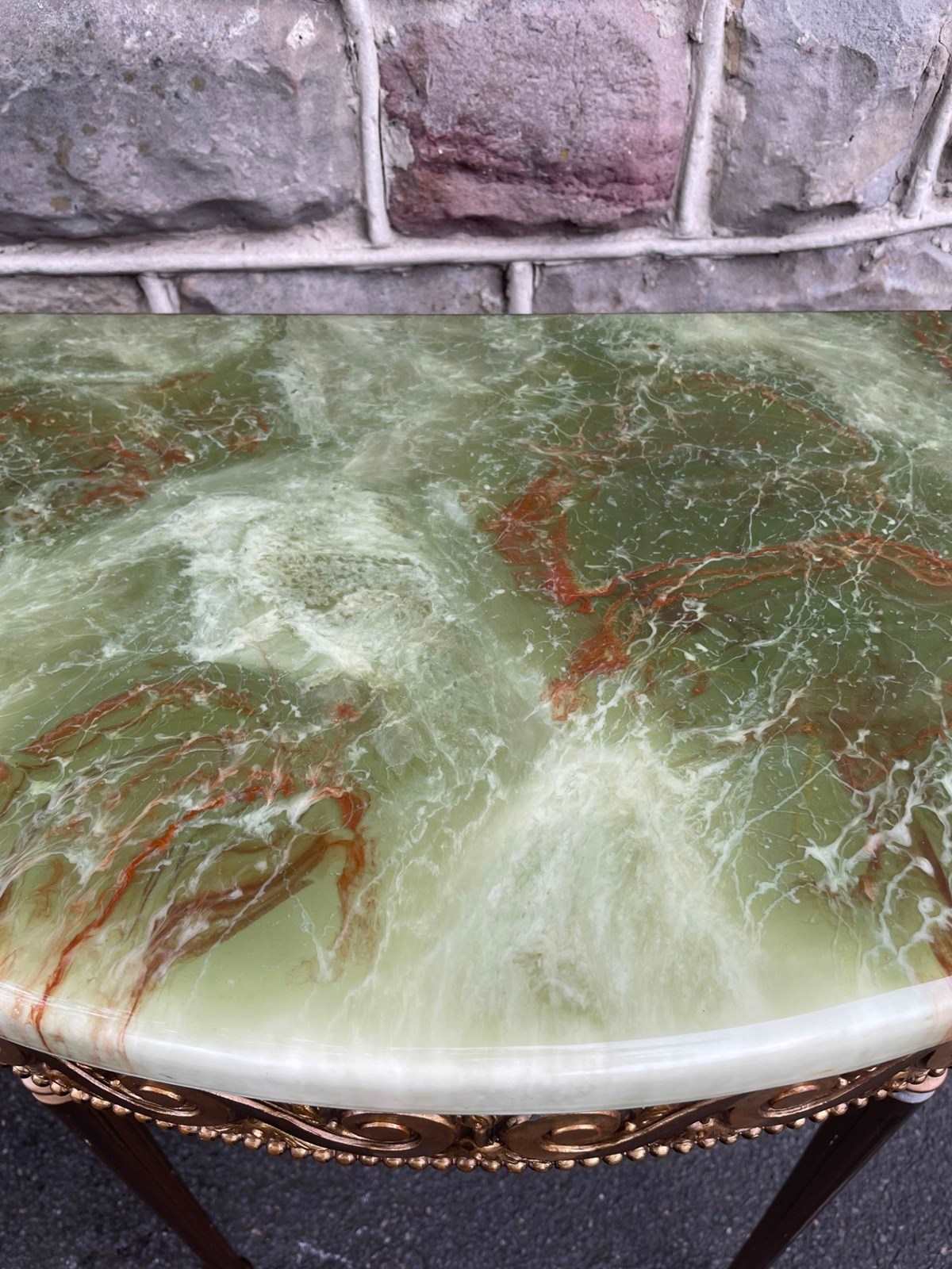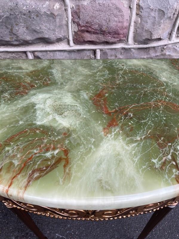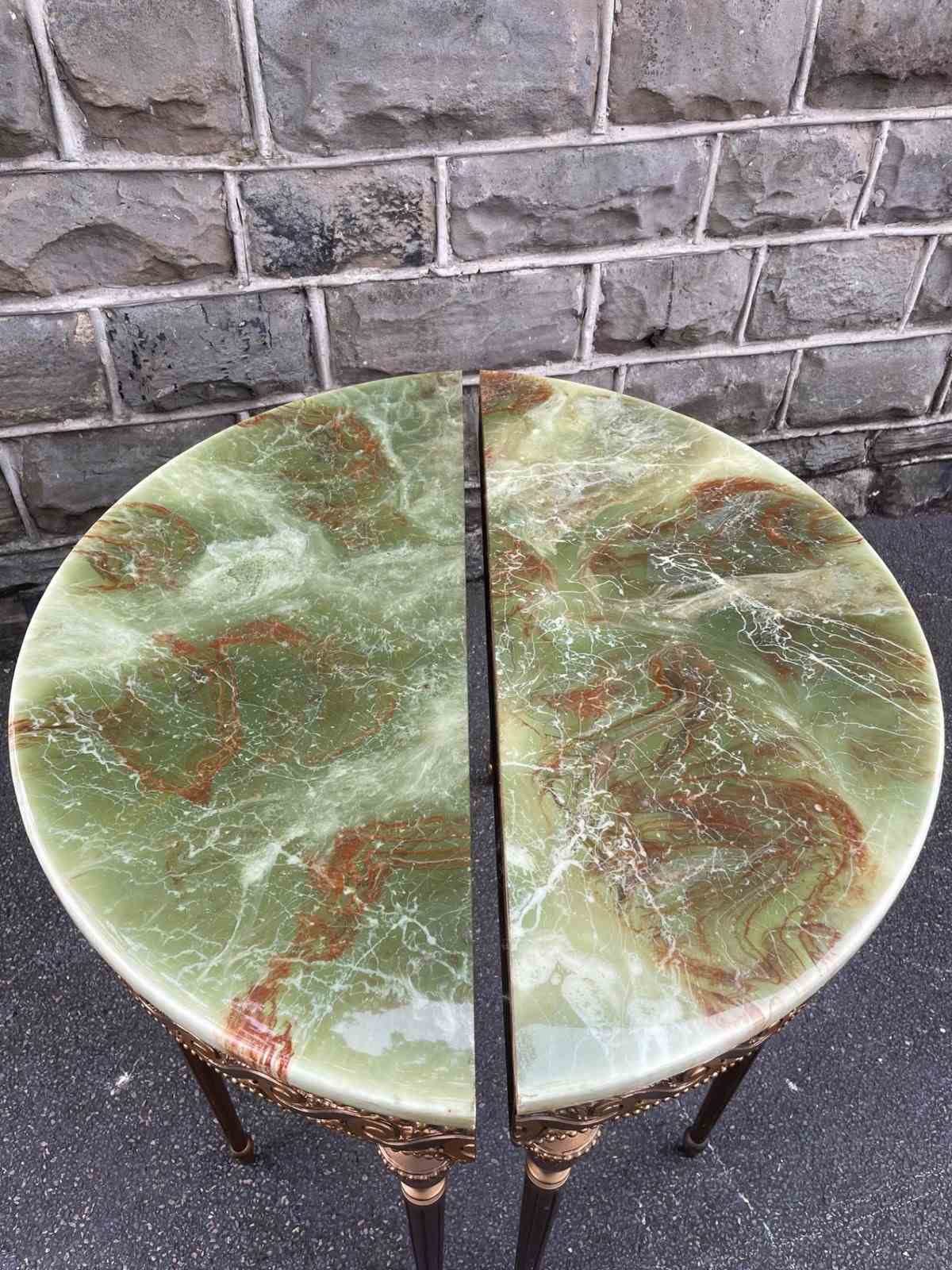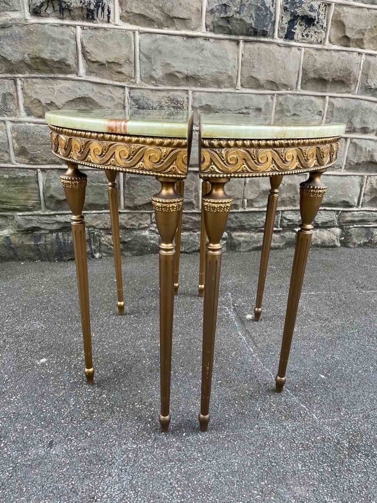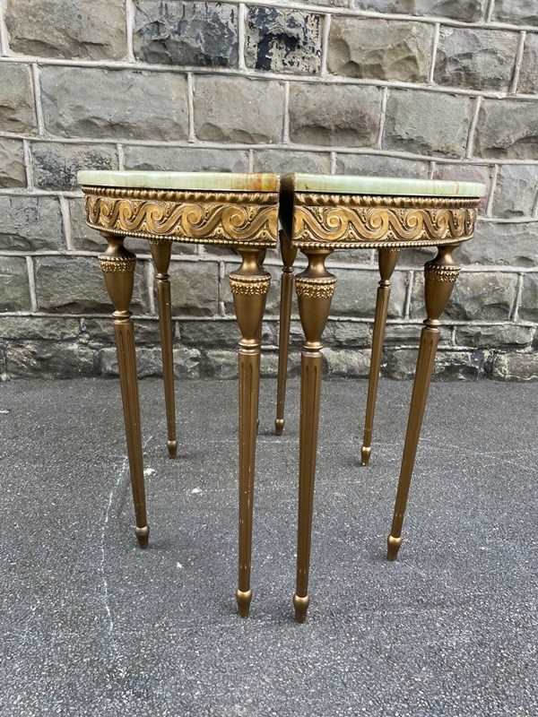 In the Adams style, demi lune shape having green onyx tops with gilt wood bases, standing on turned reeded legs