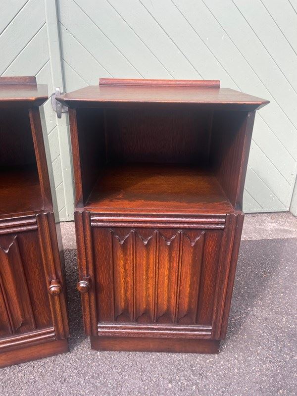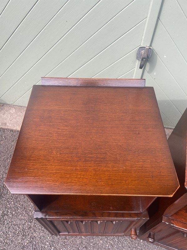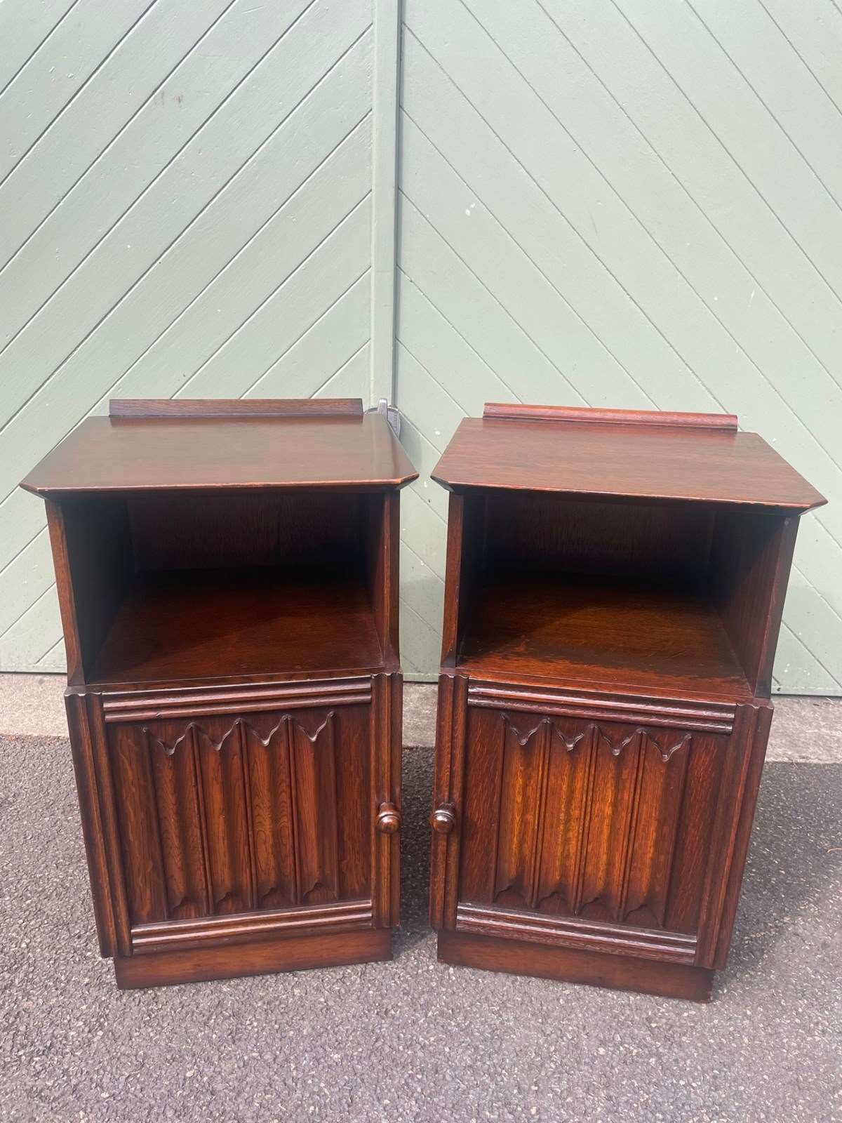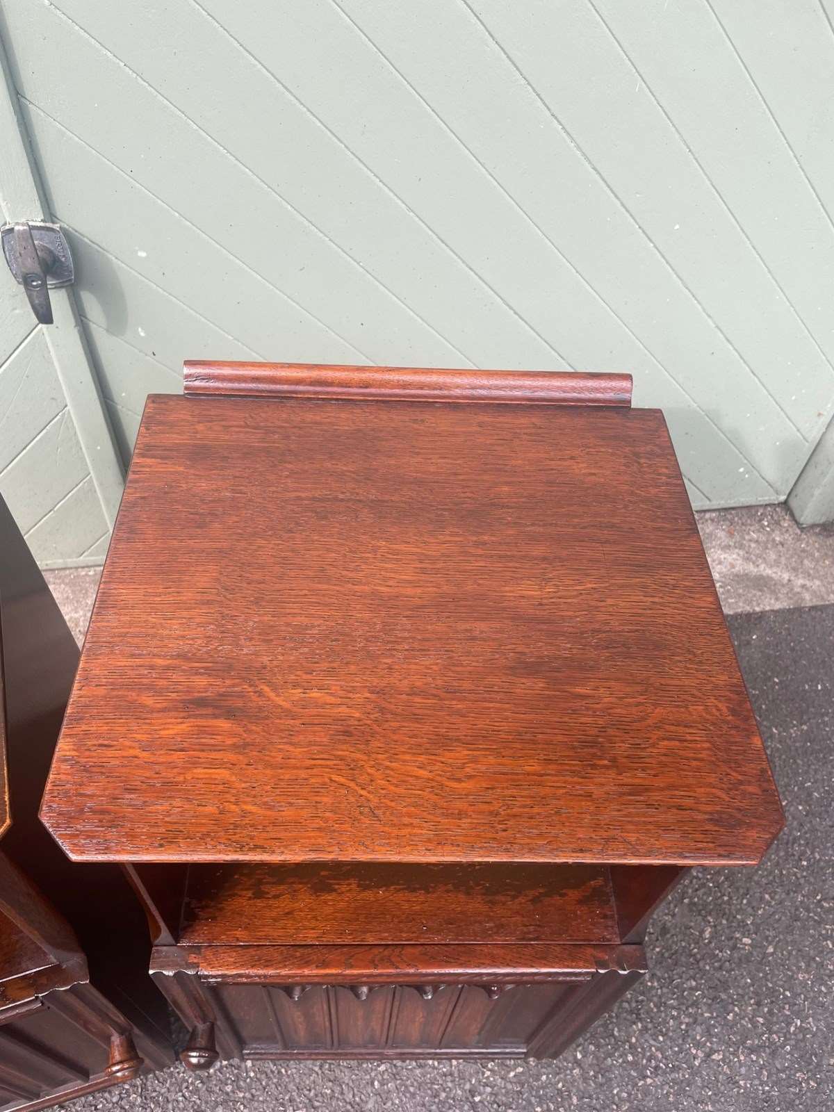Each is in oak having a small raised gallery back, open storage area, cupboard door with linen fold carved decoration with wooden knob. Polished oak sides, solid backs standing on a plinth base