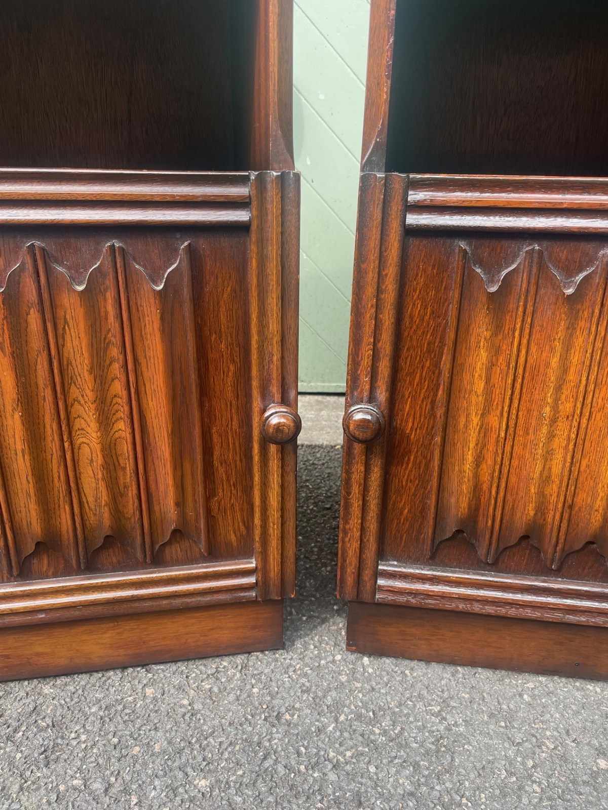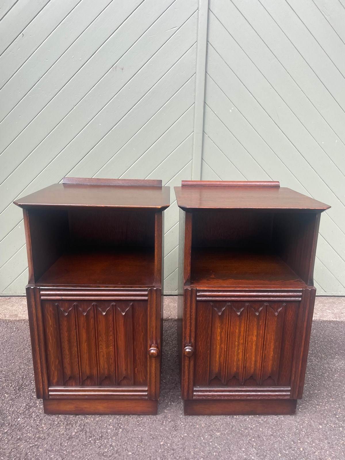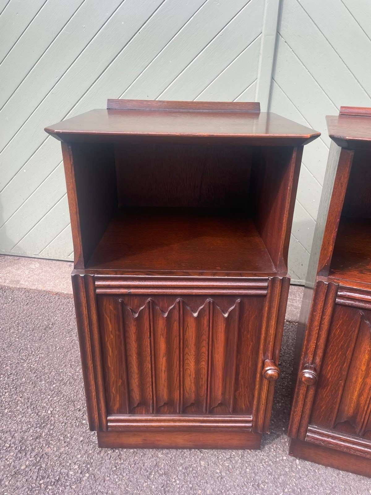 Each is in oak having a small raised gallery back, open storage area, cupboard door with linen fold carved decoration with wooden knob. Polished oak sides, solid backs standing on a plinth base