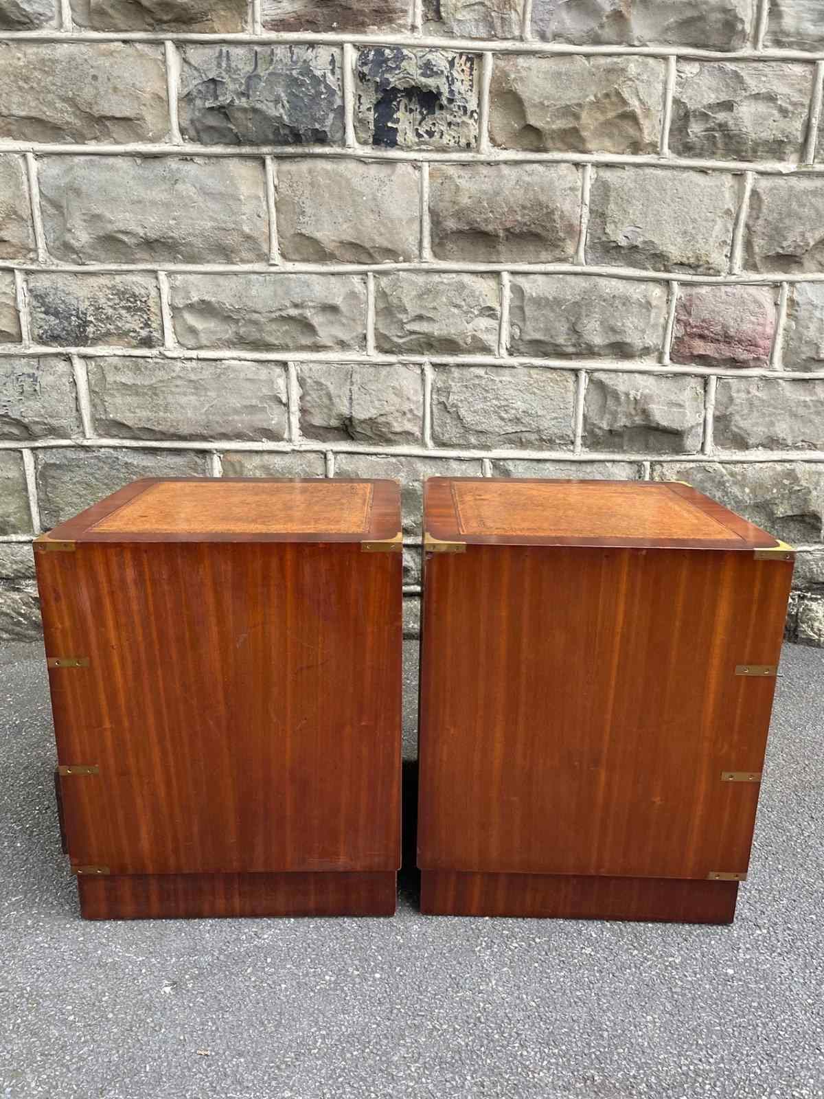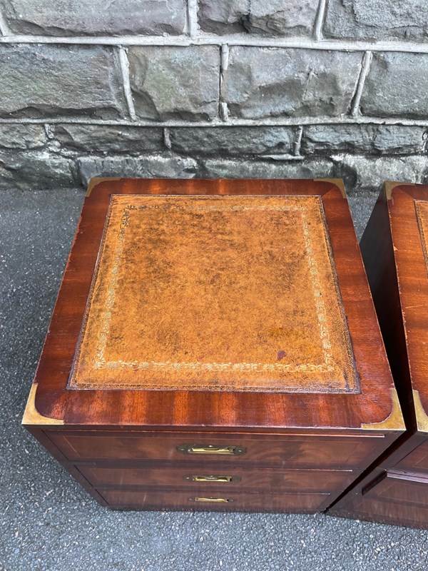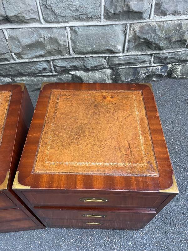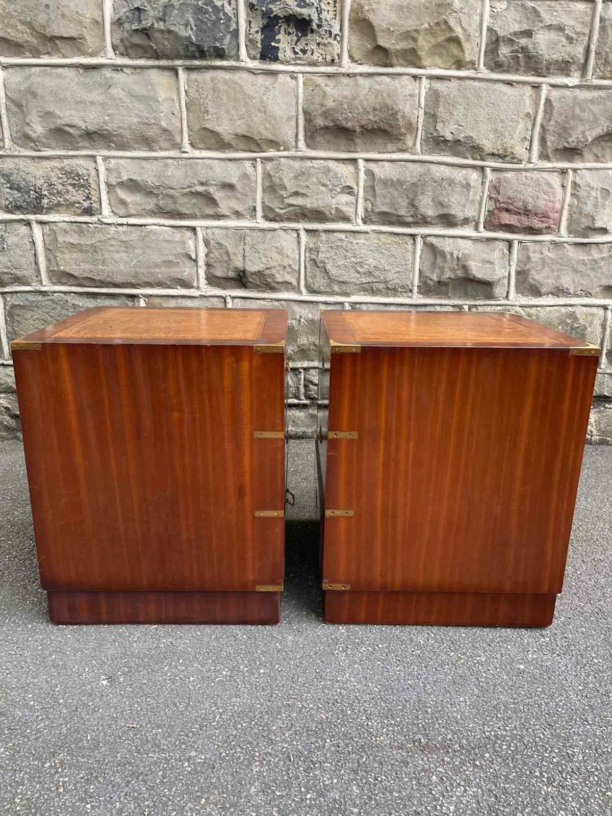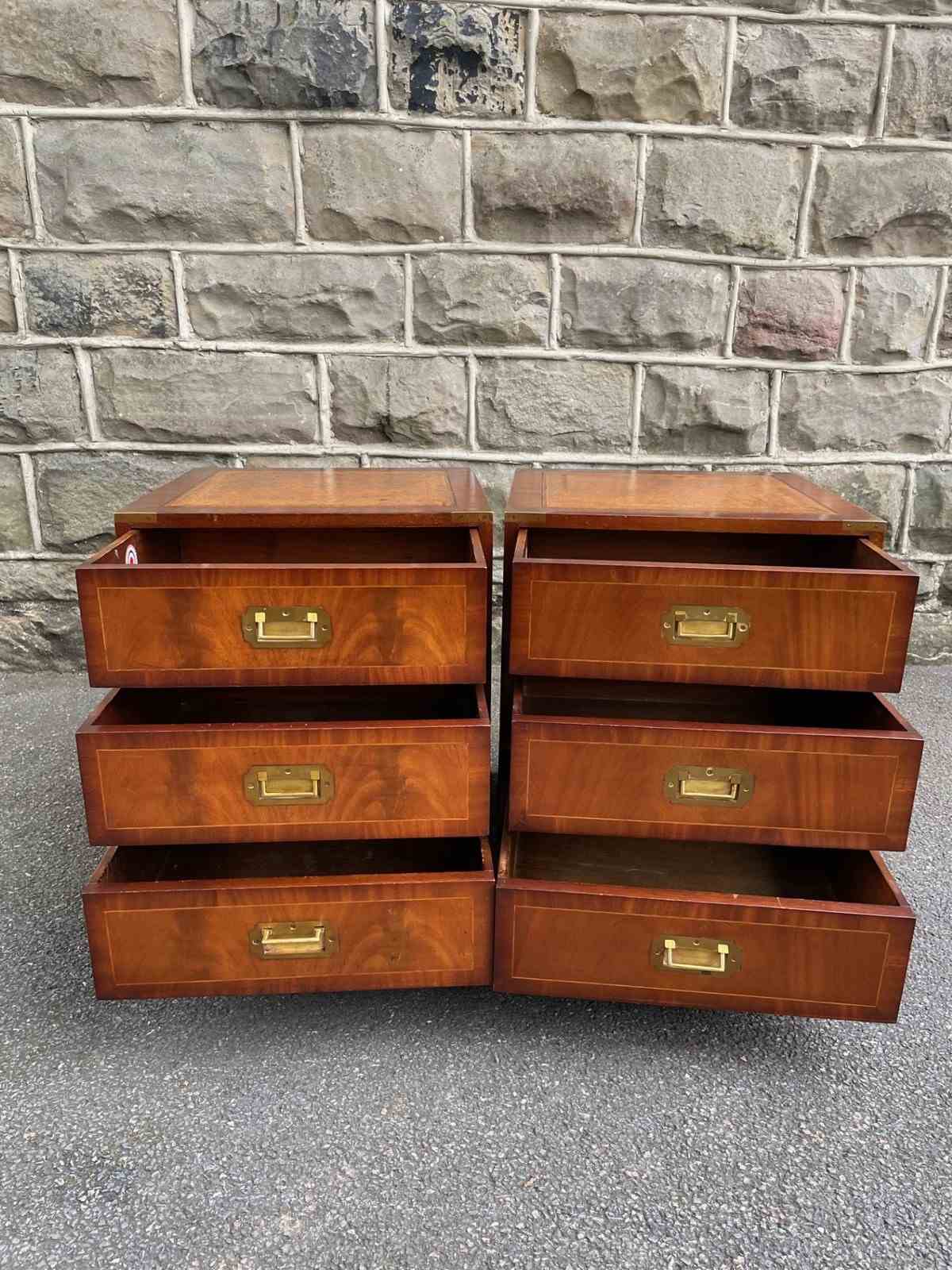 Offered for sale is this pair of brass bound mahogany campaign military chest drawer. Nice small size ideal as a bedside table. Made from mahogany, with tooled leather tops, 3 draws having brass flat flush fitting handles. Brass bound corners. Recessed plinth base, polished mahogany sides.