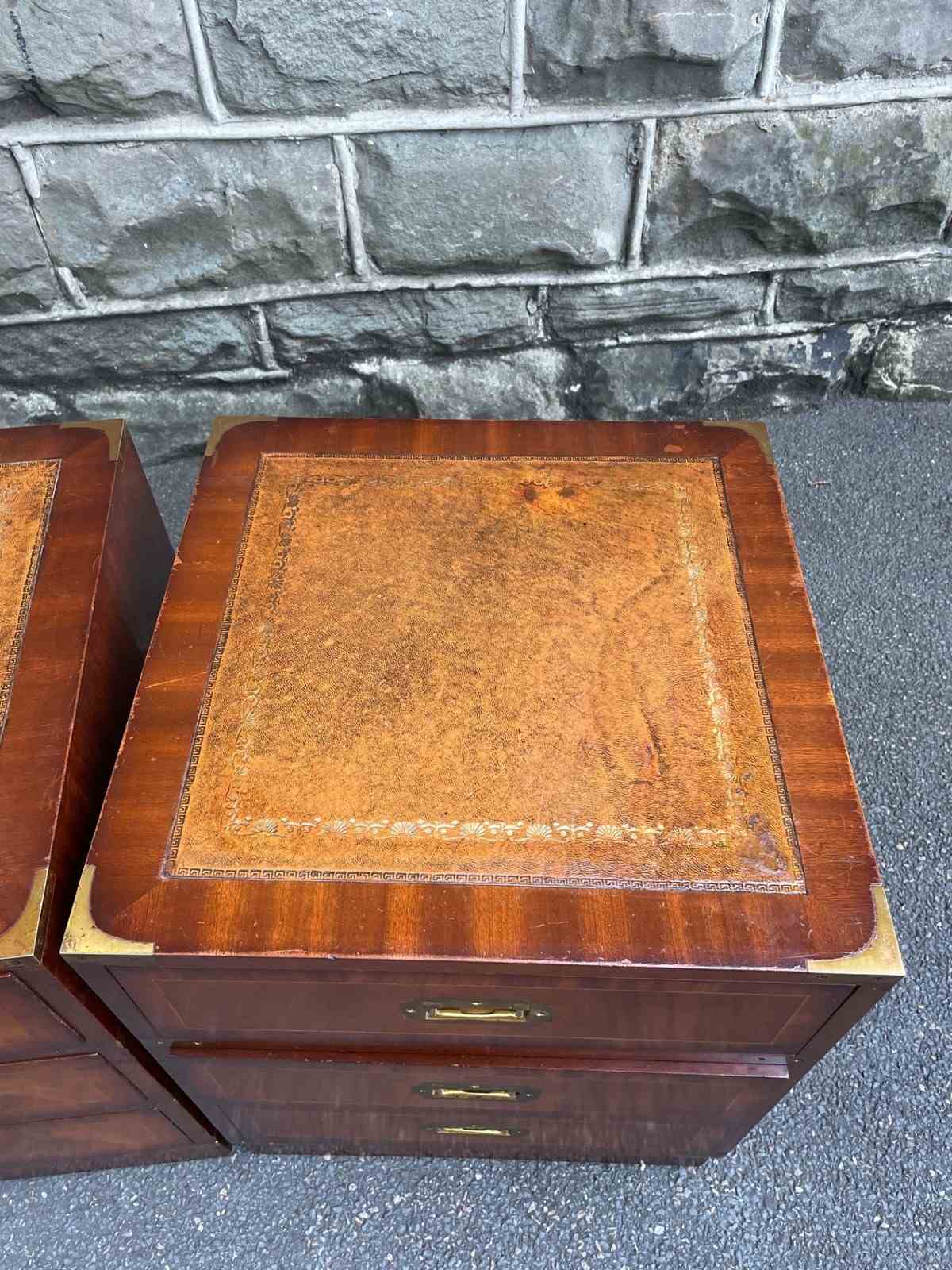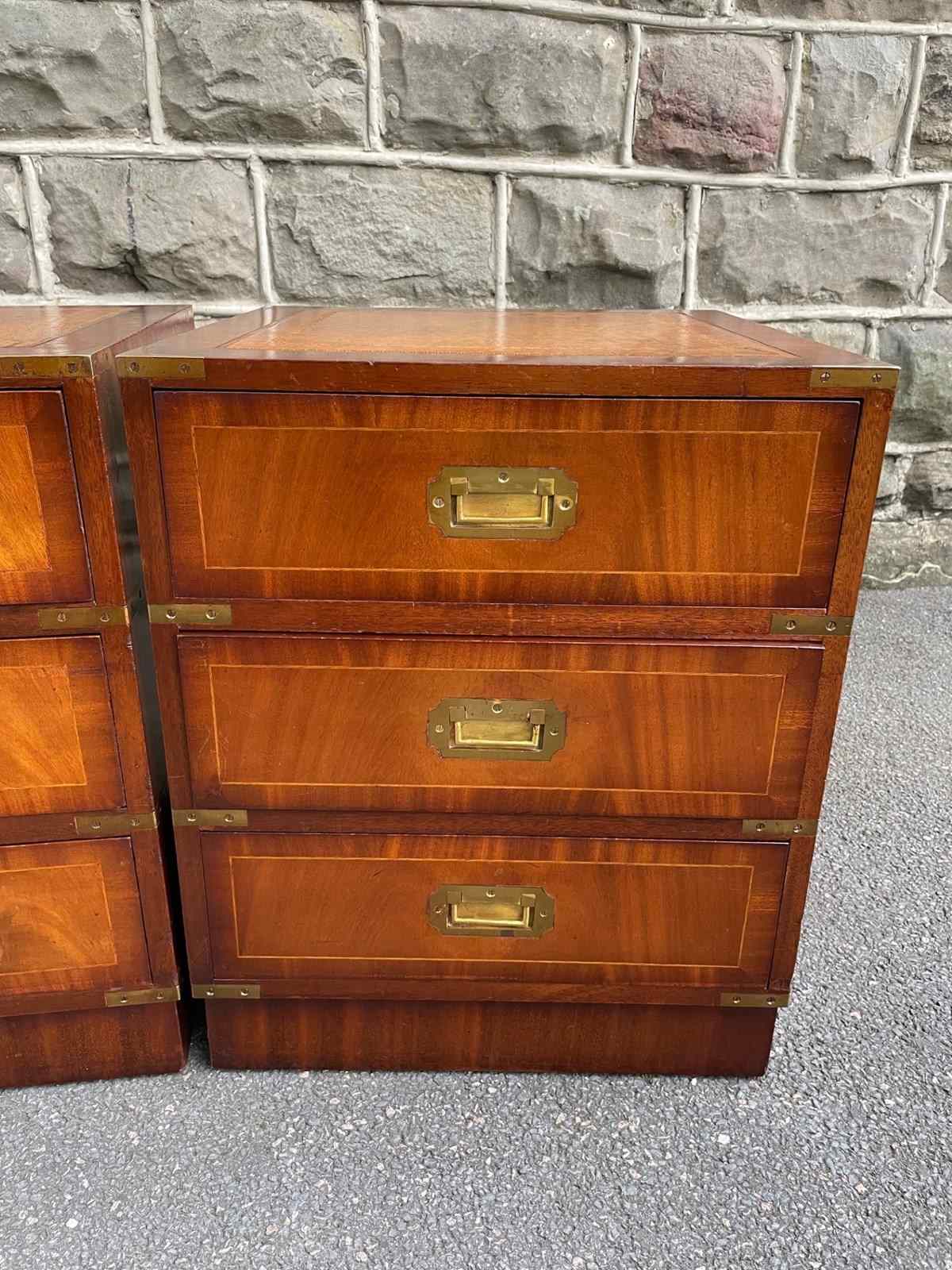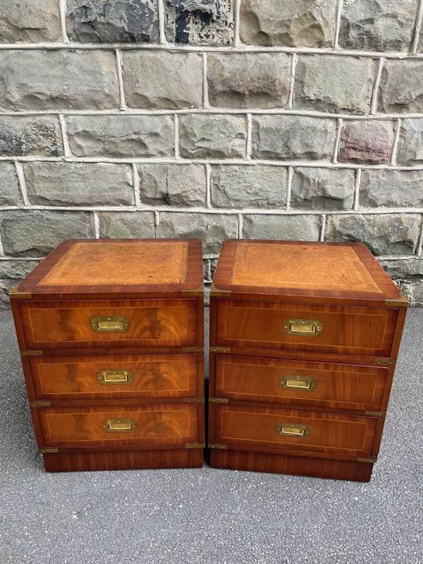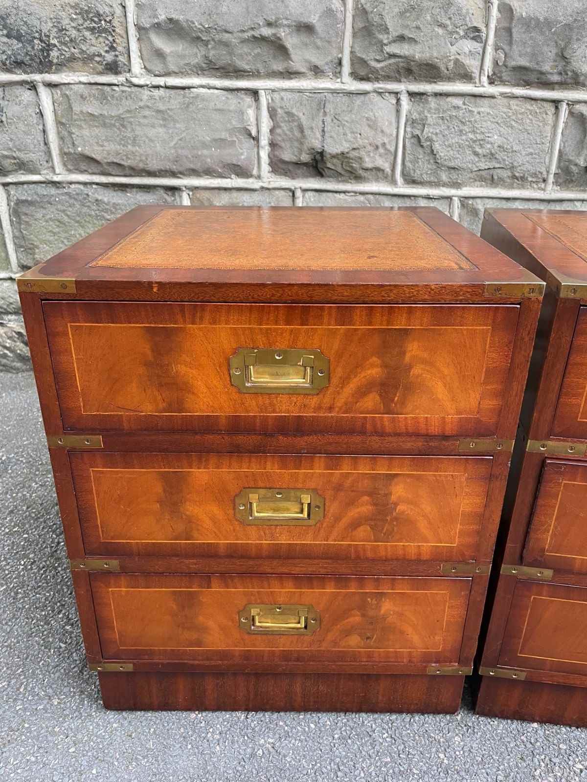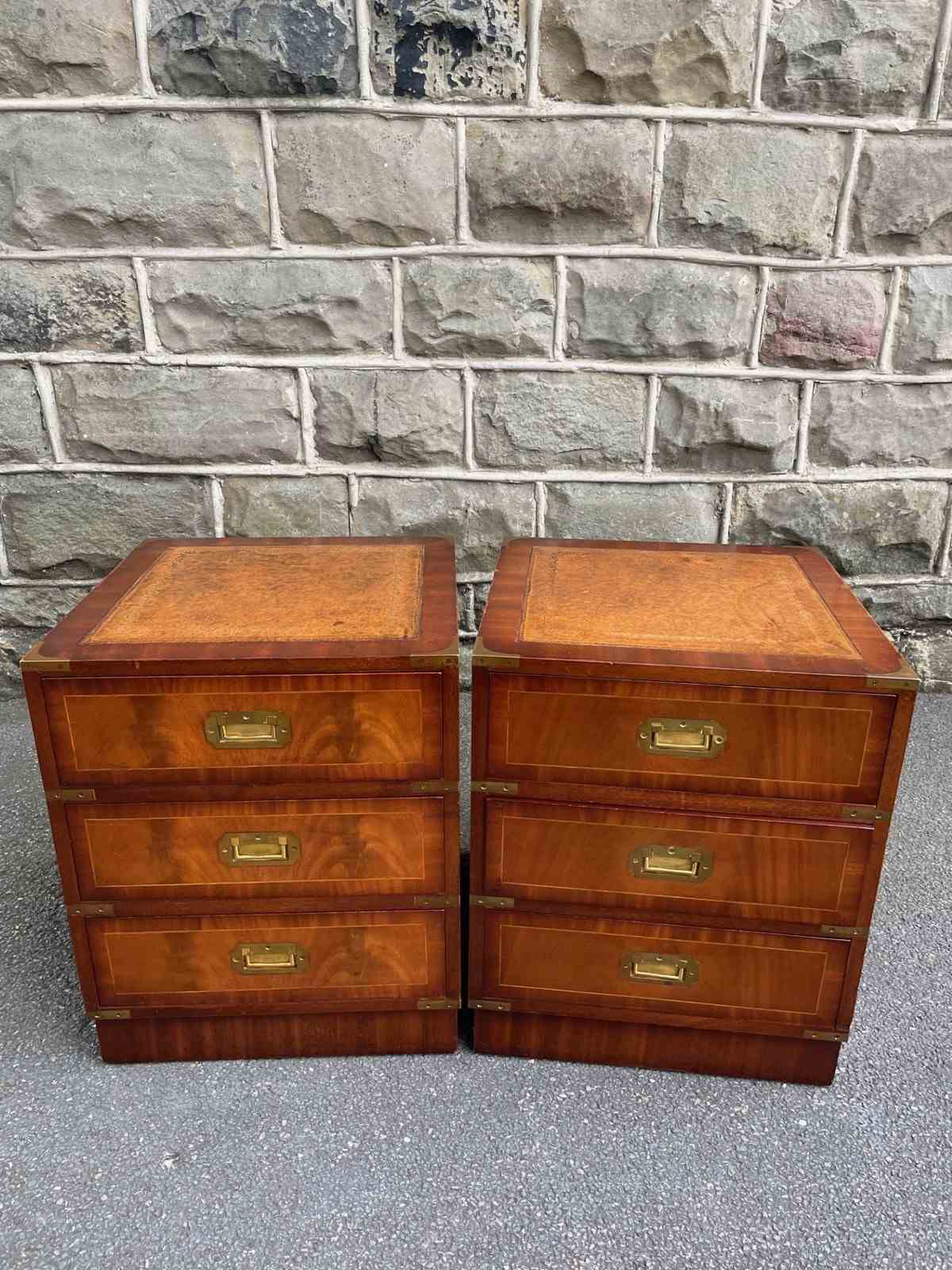 Offered for sale is this pair of brass bound mahogany campaign military chest drawer. Nice small size ideal as a bedside table. Made from mahogany, with tooled leather tops, 3 draws having brass flat flush fitting handles. Brass bound corners. Recessed plinth base, polished mahogany sides.