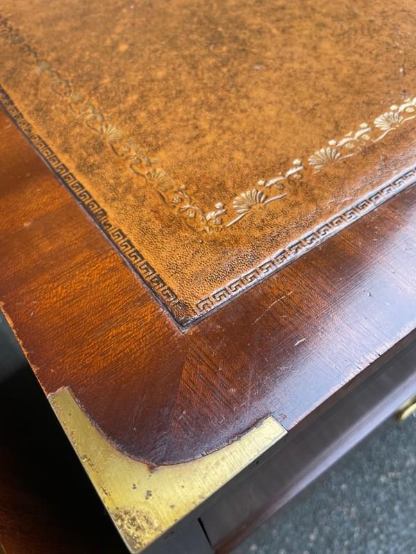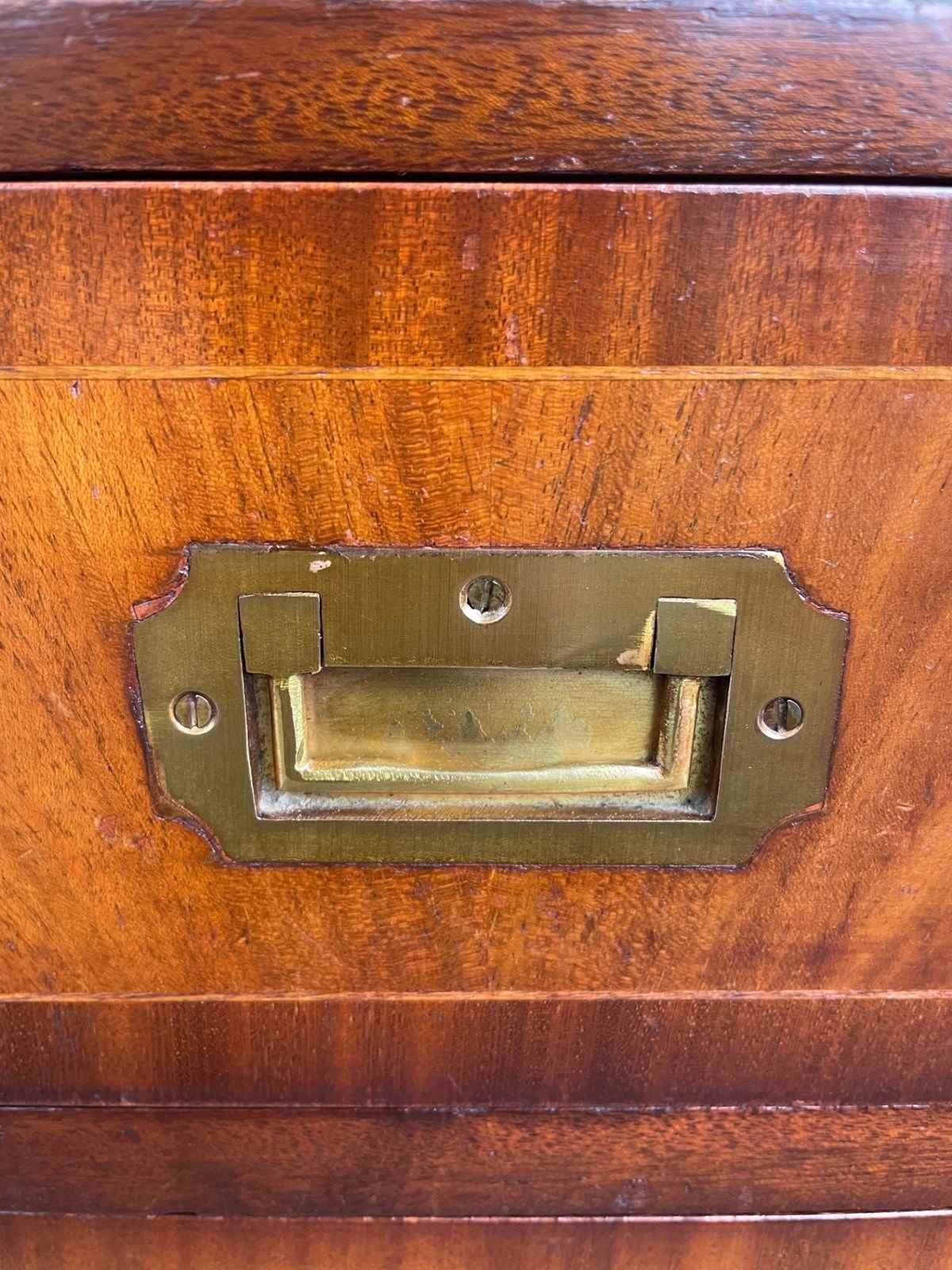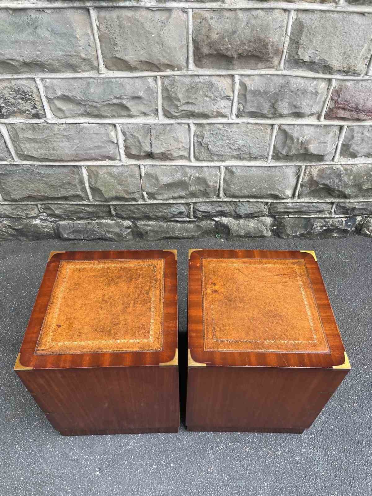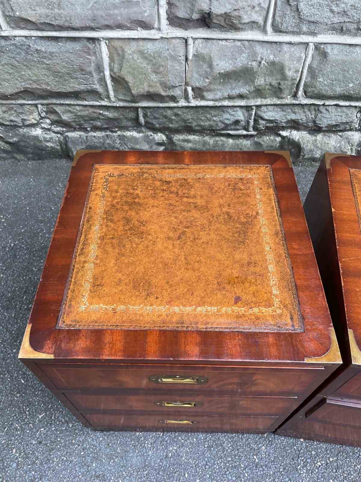 Offered for sale is this pair of brass bound mahogany campaign military chest drawer. Nice small size ideal as a bedside table. Made from mahogany, with tooled leather tops, 3 draws having brass flat flush fitting handles. Brass bound corners. Recessed plinth base, polished mahogany sides.