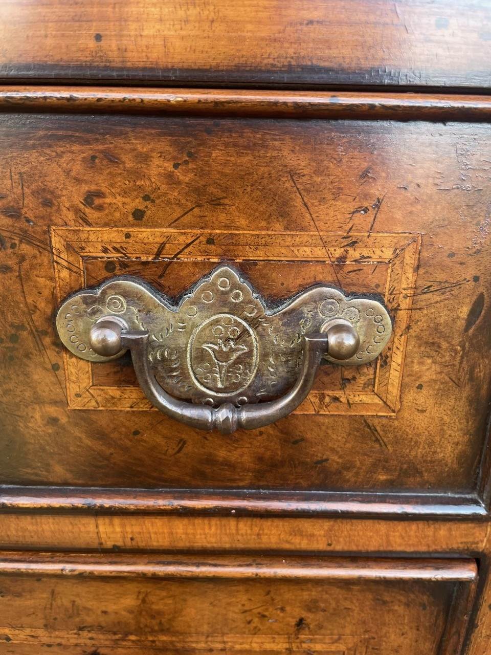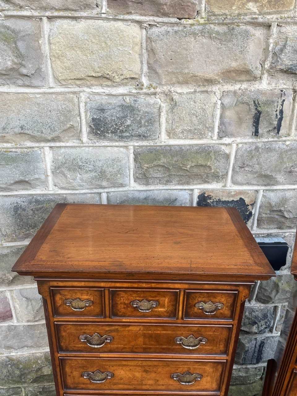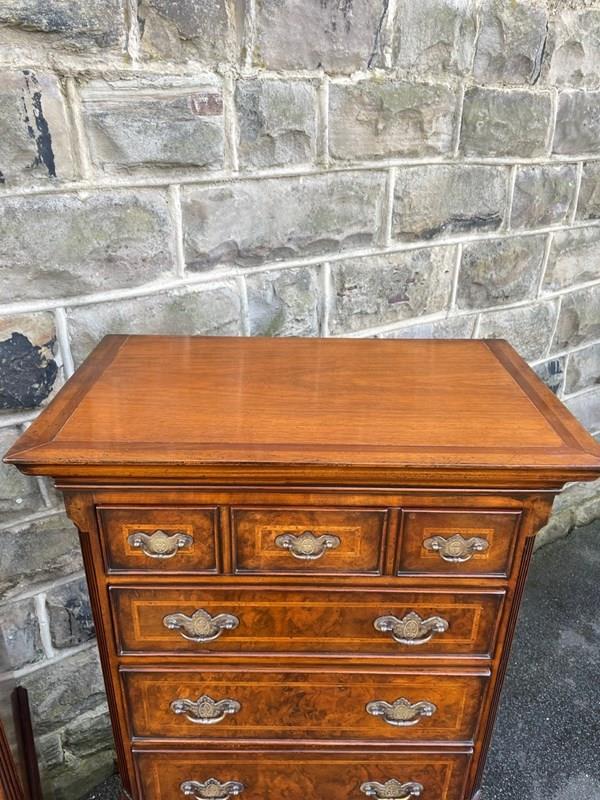 Lovely slim size & proportions. Made in 2 pieces. The top section having 4 draws (top draw being a dummy looking 3 small draws) with the bottom section having 3 draws. Burr walnut fronted draws with inlaid feather banding & ornate brass handles. Polished walnut sides standing on bracket feet