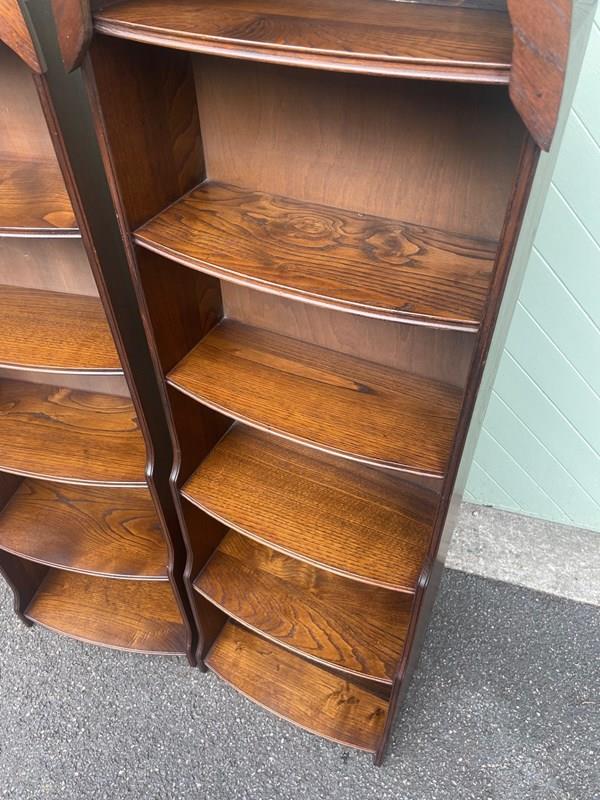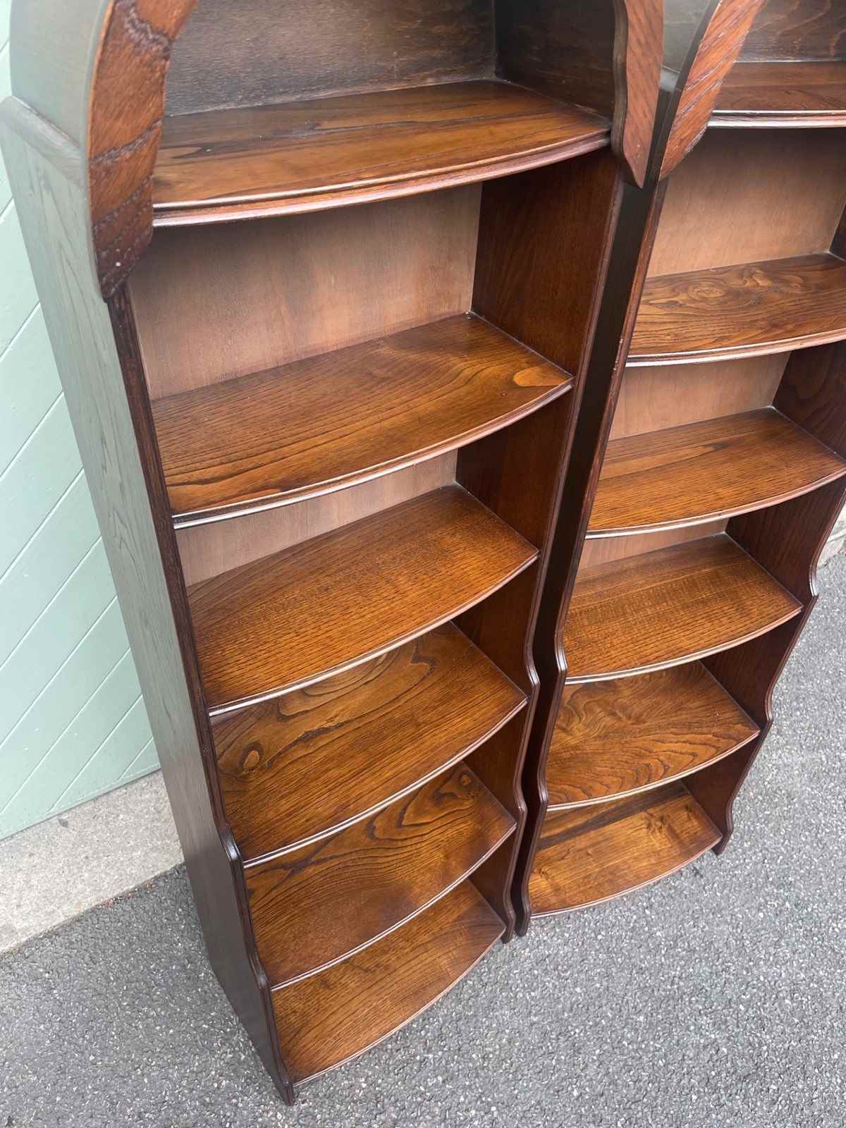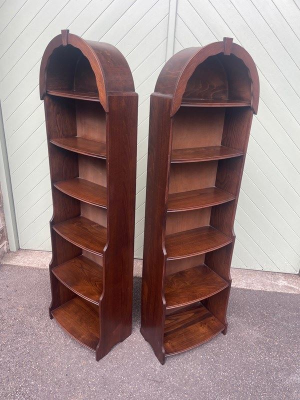 Offered for sale is this pair of slim open bookcase made from oak. Arched top with fixed shelves graduated in height.