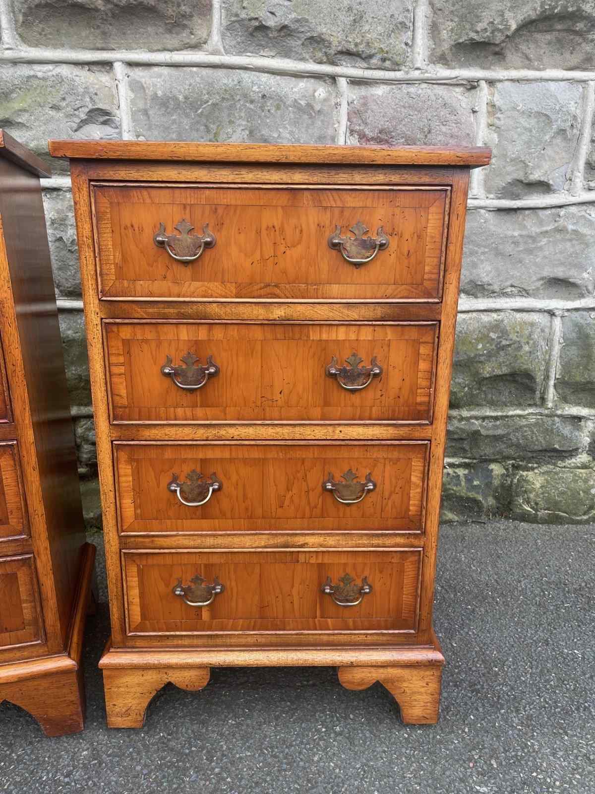 In yew wood with 4 draws, ornate brass drop handles, polished side standing on bracket feet