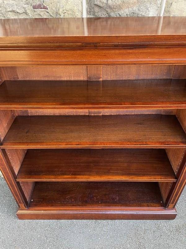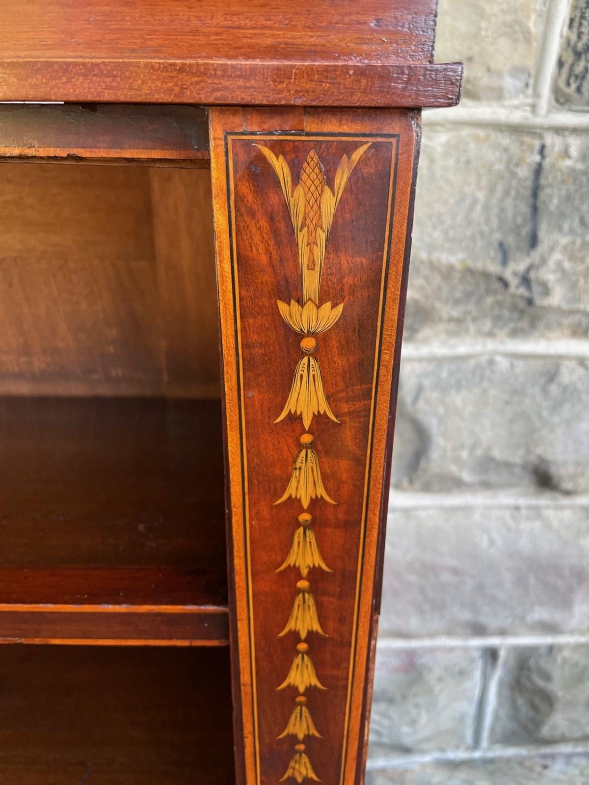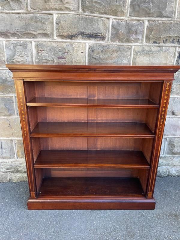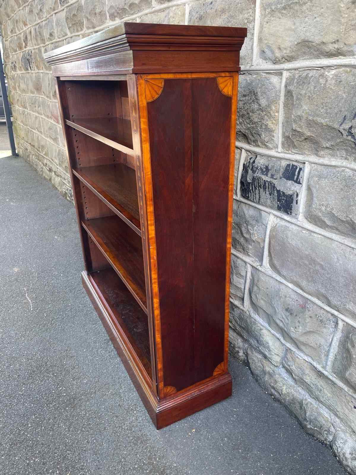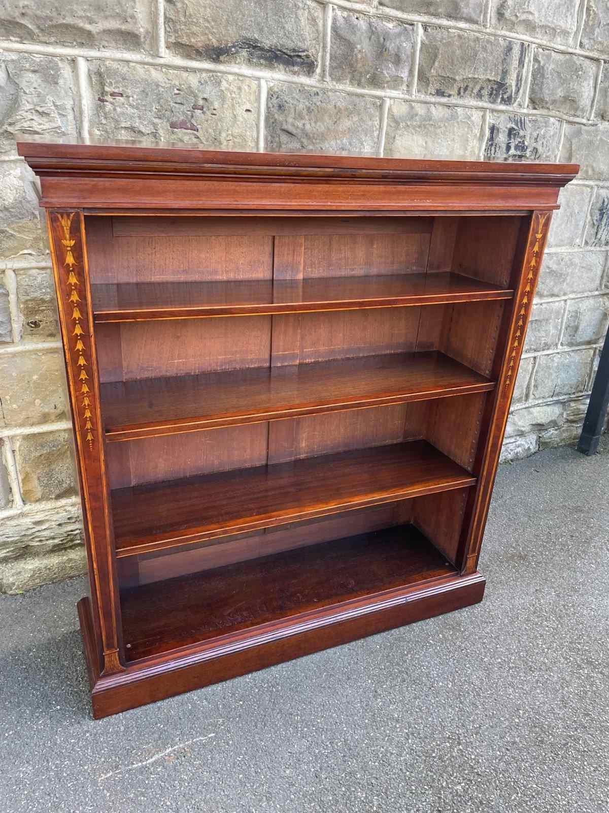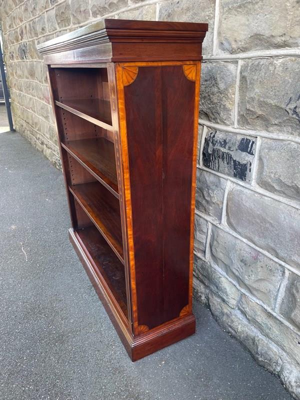 Offered for sale is this good quality antique inlaid mahogany open bookcase.
