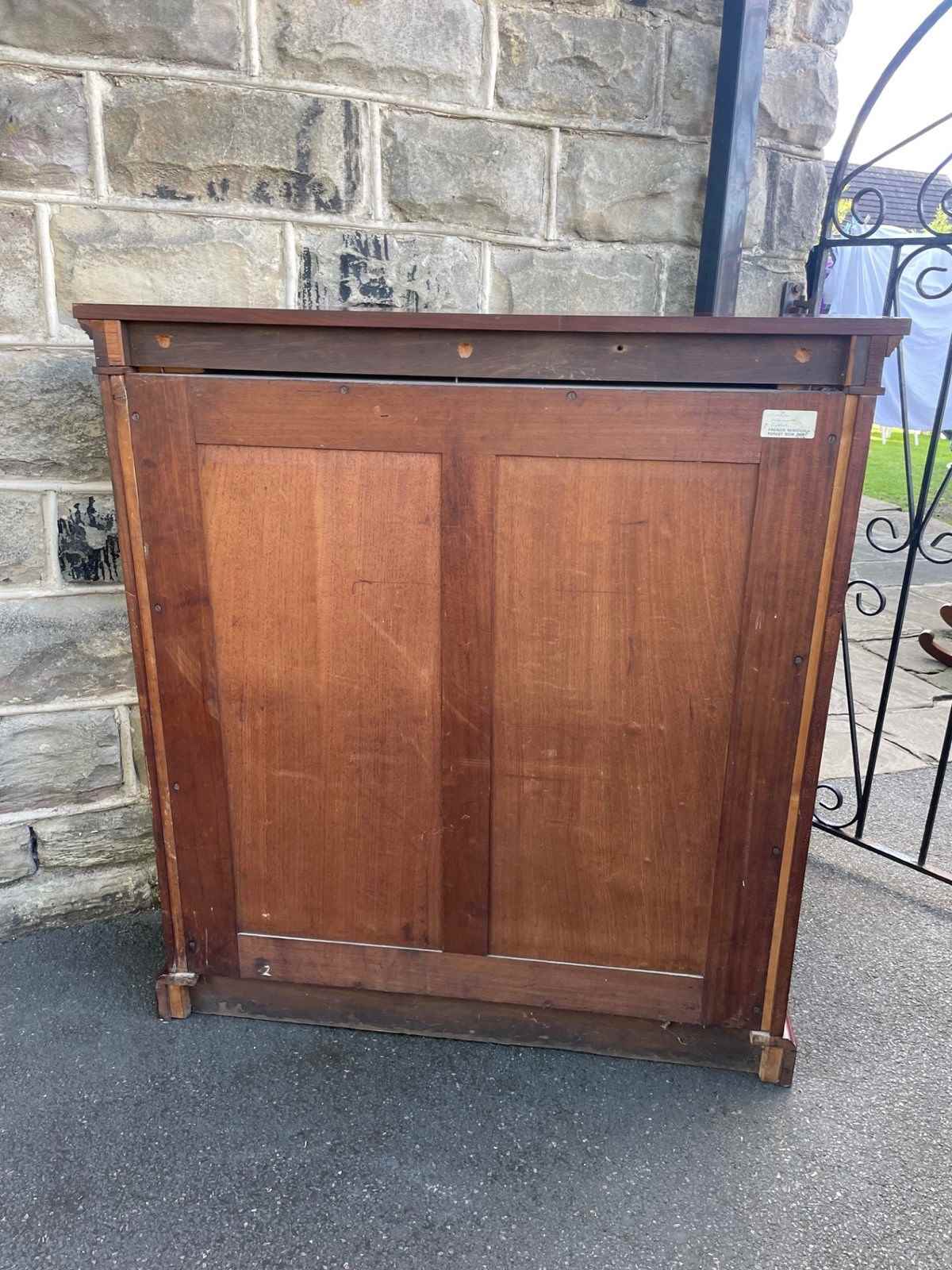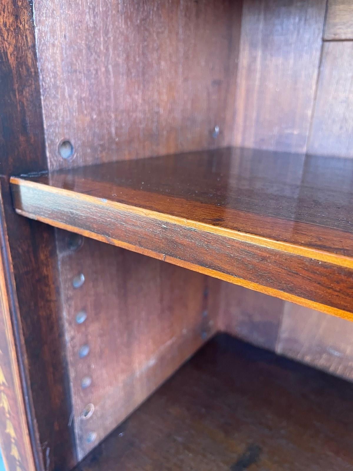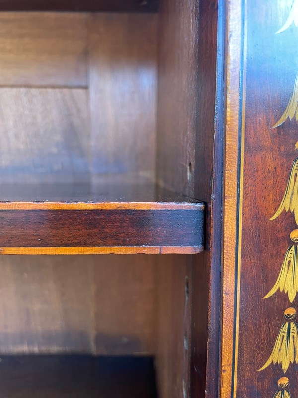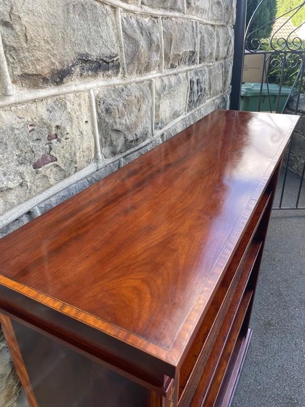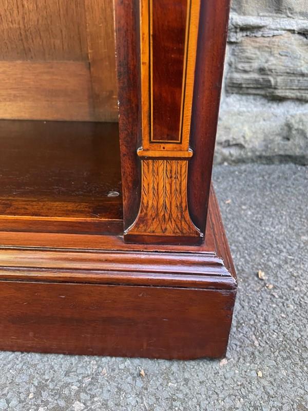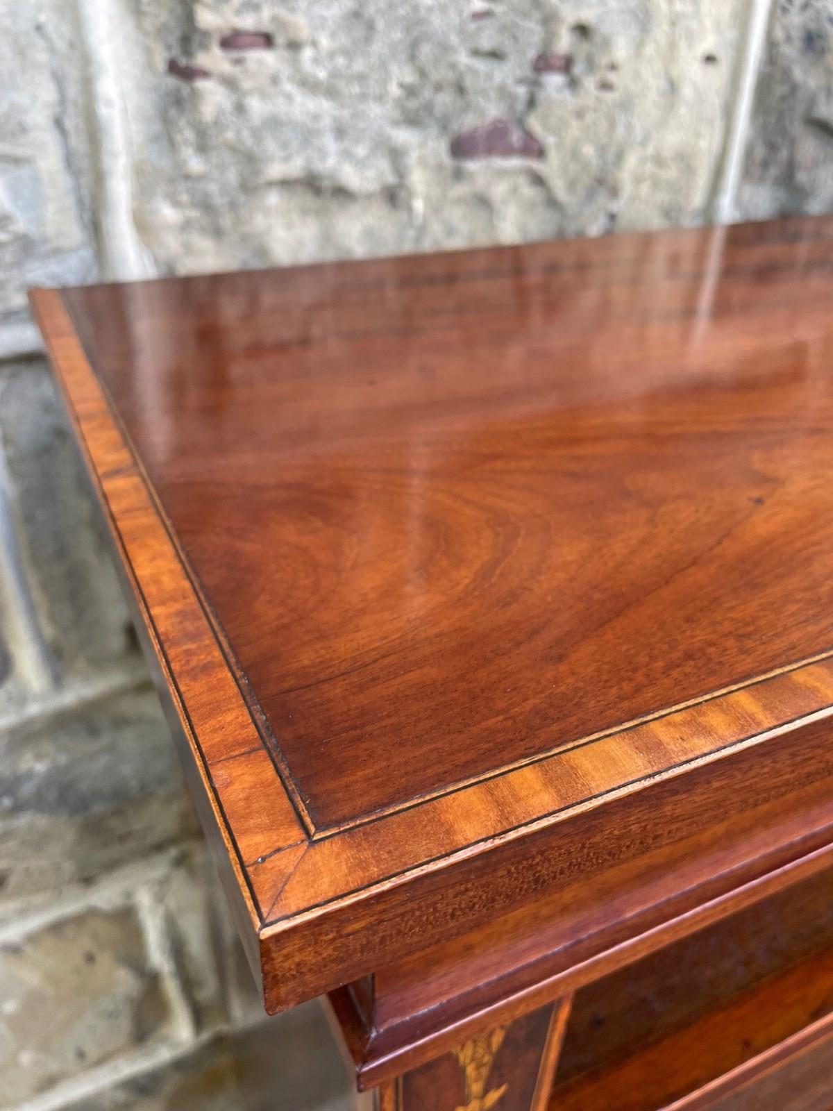 In mahogany having satinwood banded decoration around the top edge, husks inlay down the front edges. It has 3 adjustable shelves. Polished mahogany sides, standing on a plinth base.