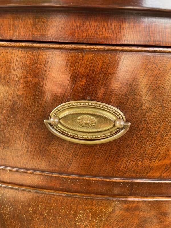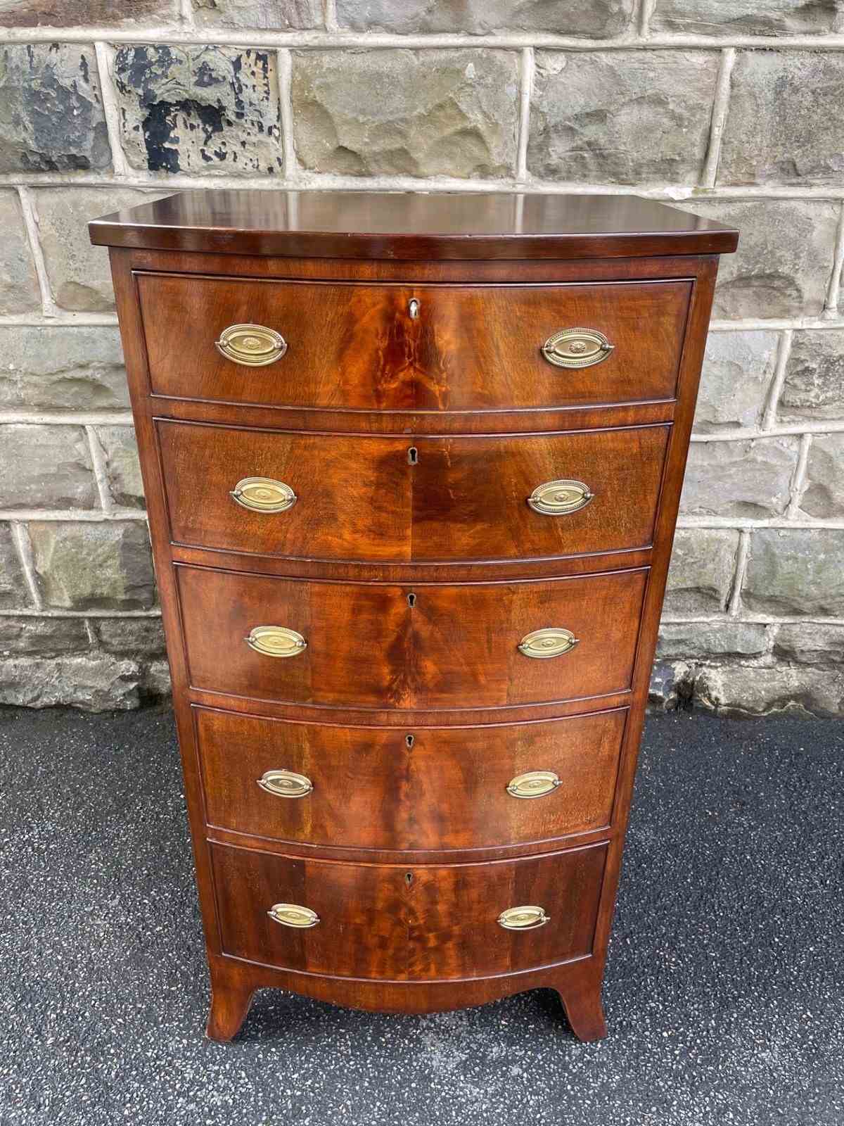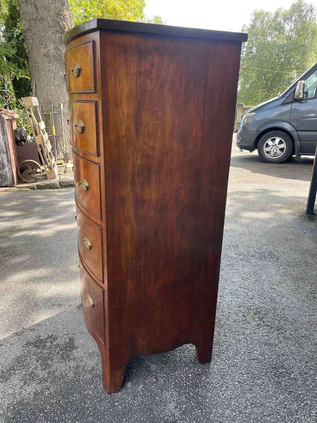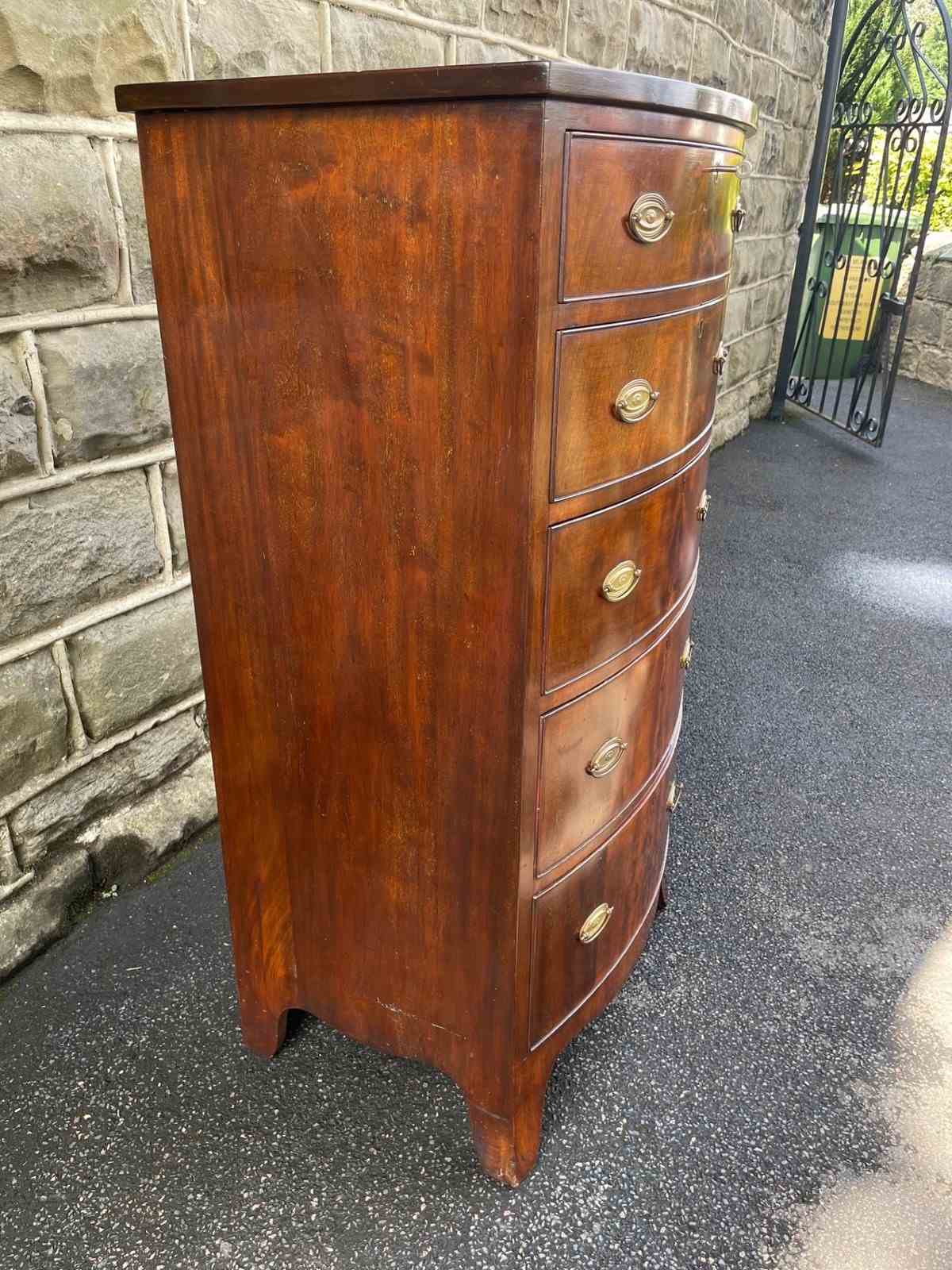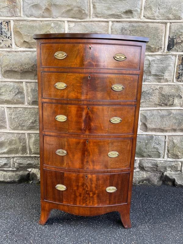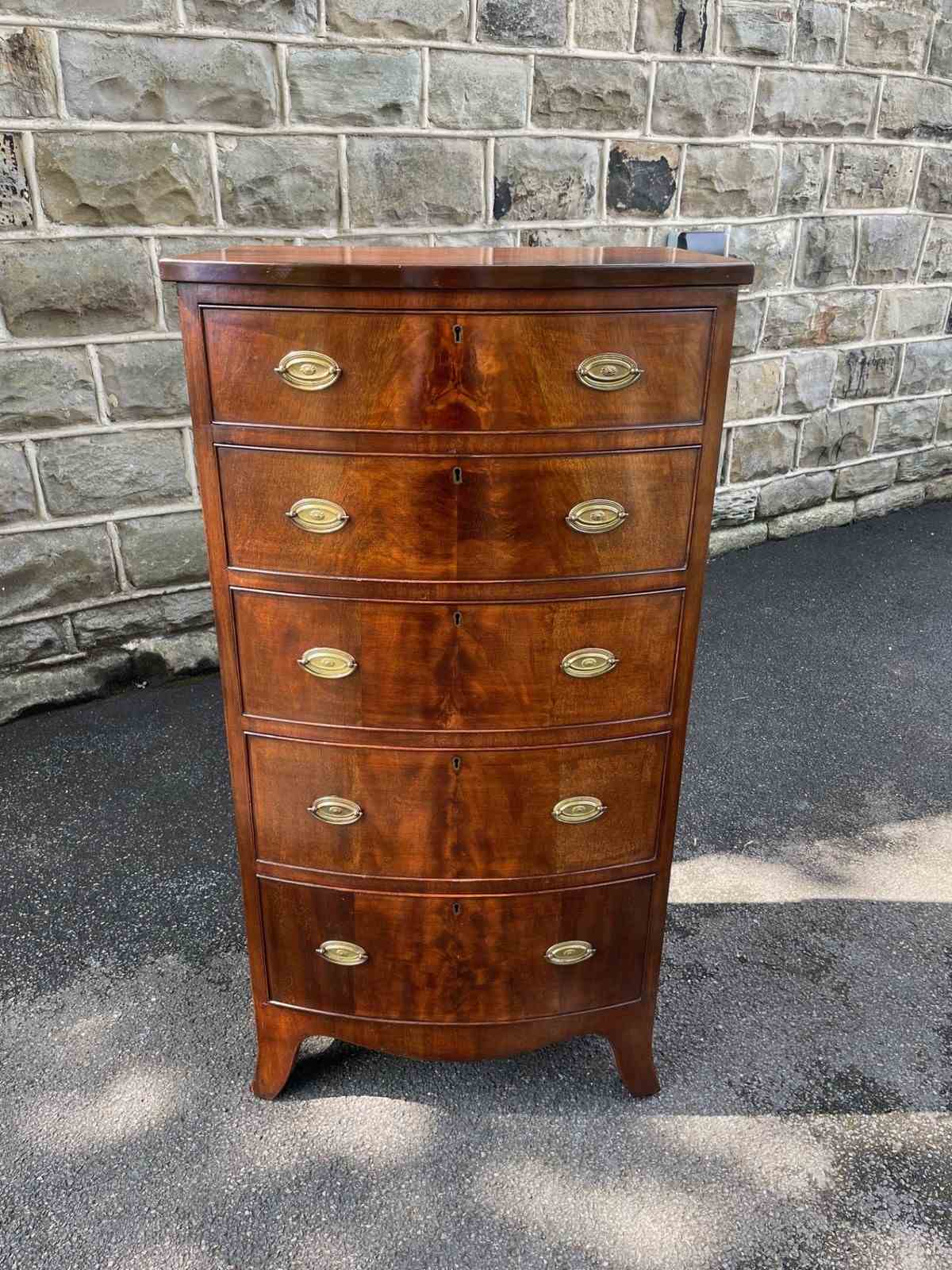 Nice slim & tall proportions, in mahogany bow front, mahogany top, 5 flamed mahogany draws all with oval brass drop handles, polished mahogany sides, standing on splayed bracket feet. Oak lined draws all with brass locks & key.