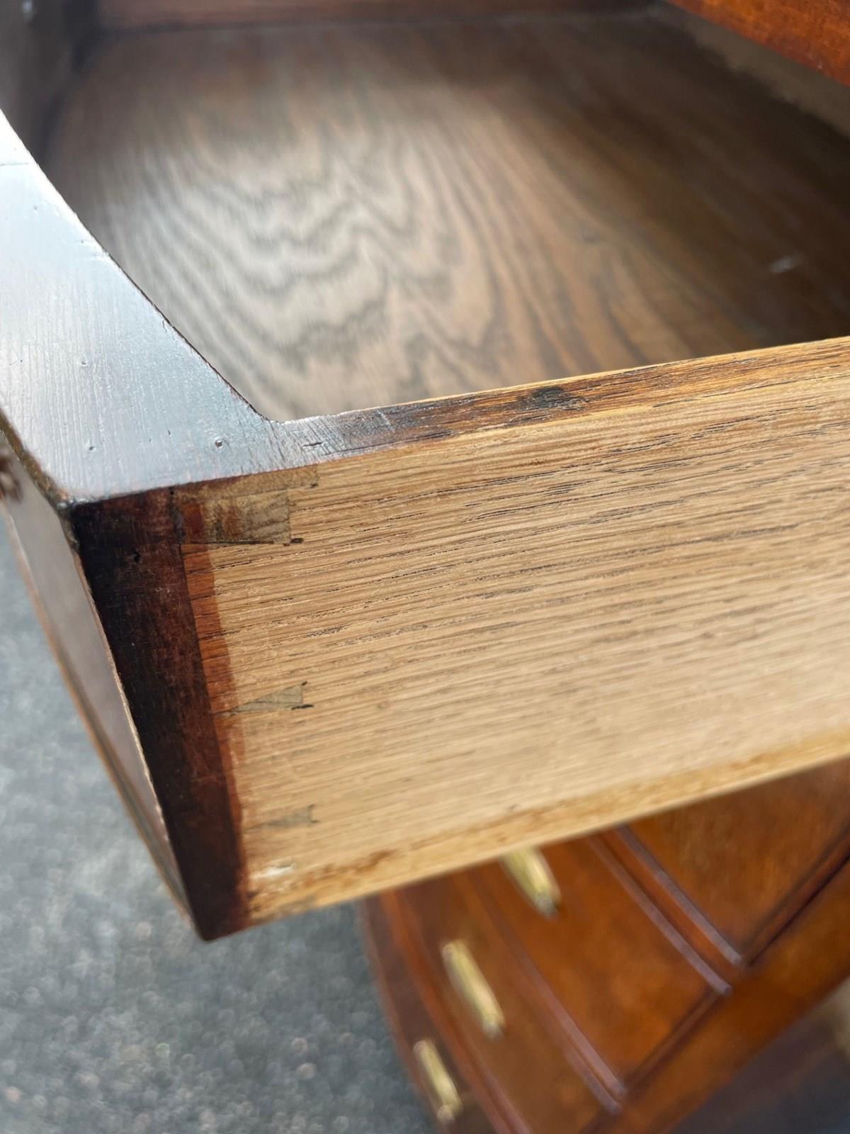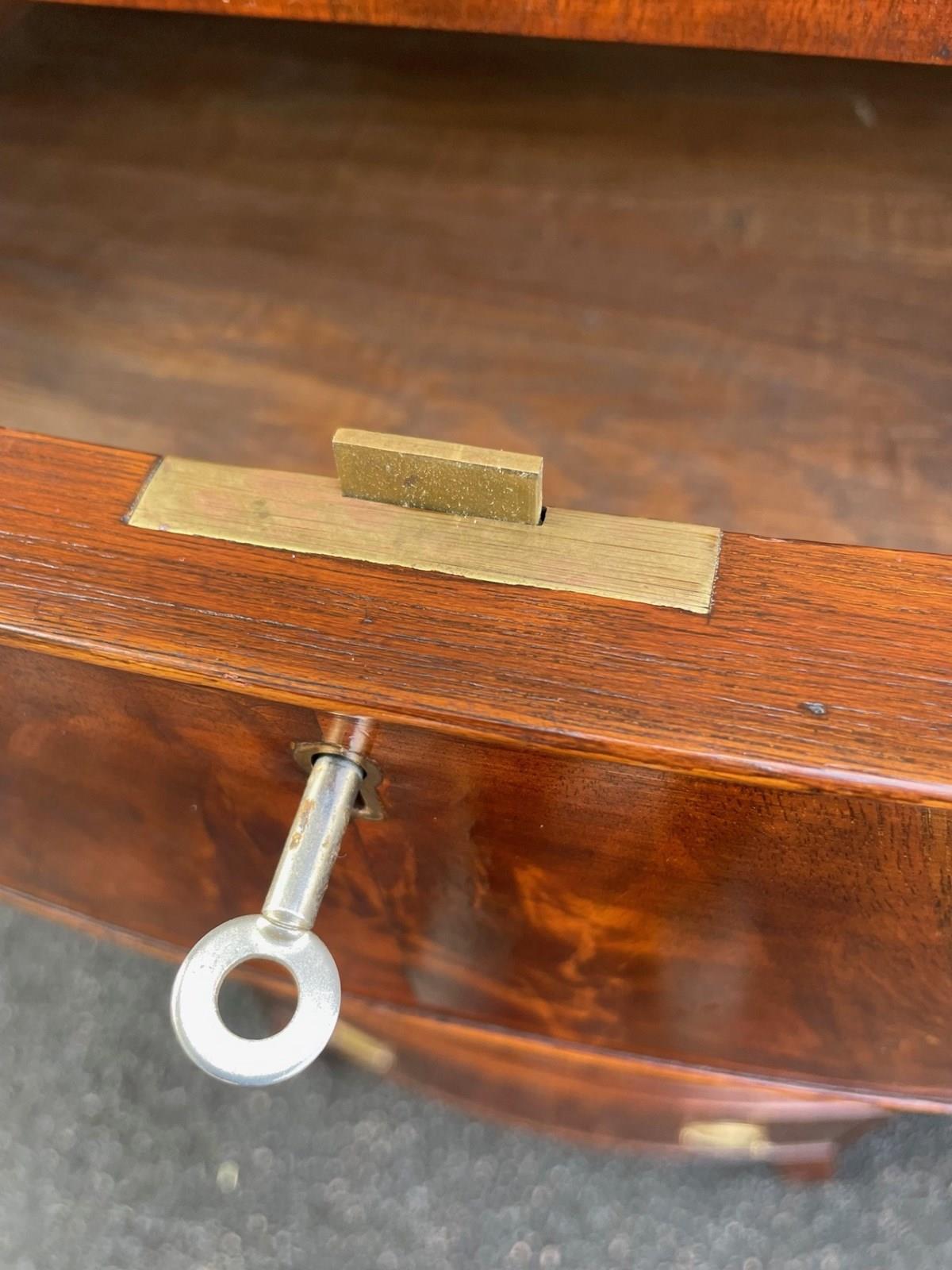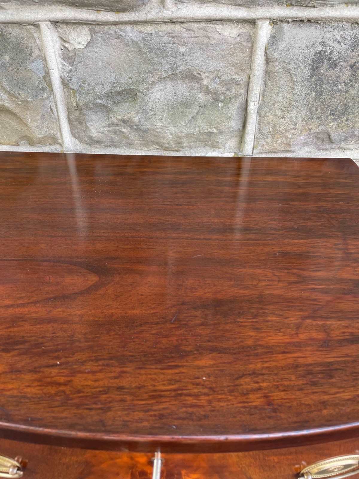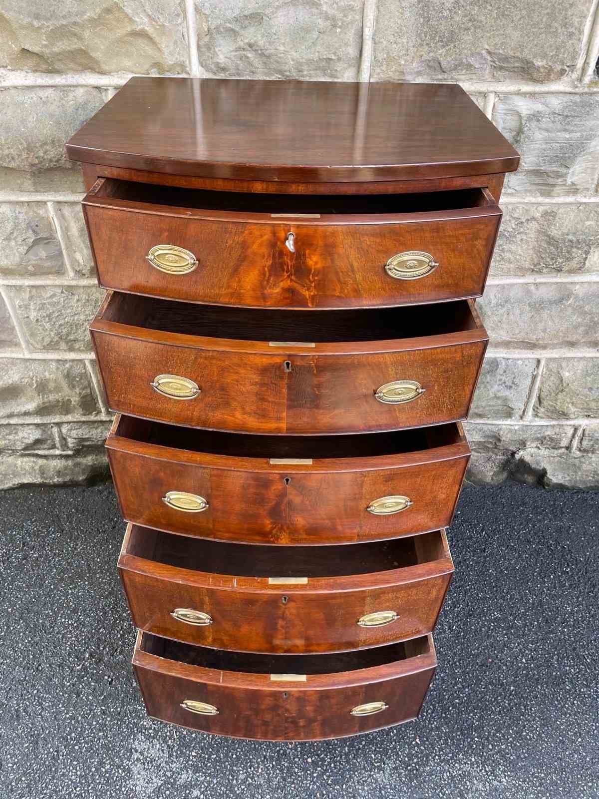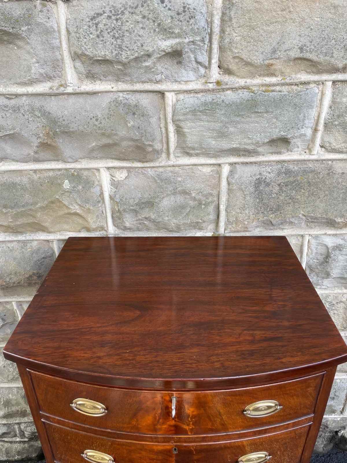 Nice slim & tall proportions, in mahogany bow front, mahogany top, 5 flamed mahogany draws all with oval brass drop handles, polished mahogany sides, standing on splayed bracket feet. Oak lined draws all with brass locks & key.