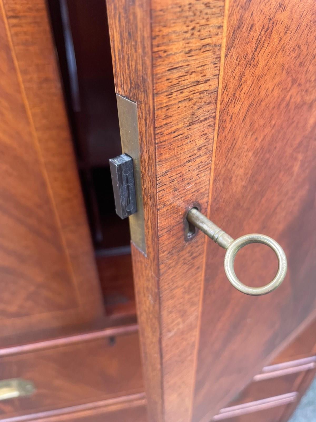 Offered for sale is this unusual brass bound mahogany military campaign style secretaire chest drawers.