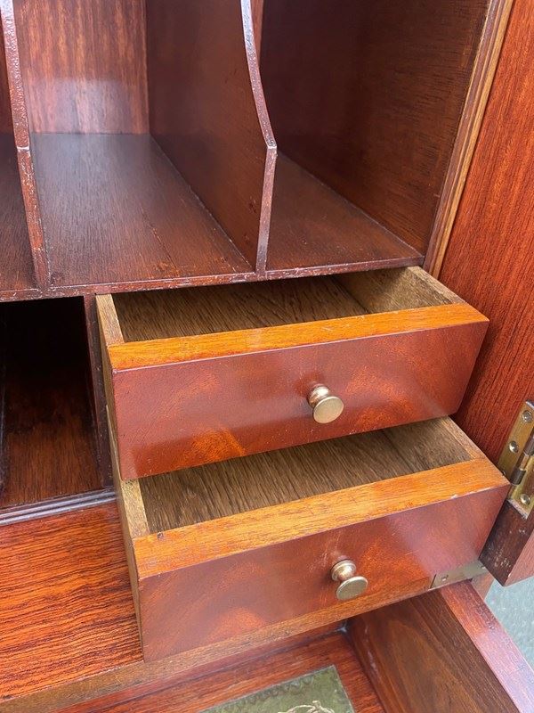 In mahogany having brass bound mounts. Pair of cupboard doors with 4 small internal draws & filing compartments. The top draw had a pull out secretaire with tooled leather writing surface. There a 4 more graduated height draws. Polished mahogany sides with brass carrying handles. Standing on a plinth base.