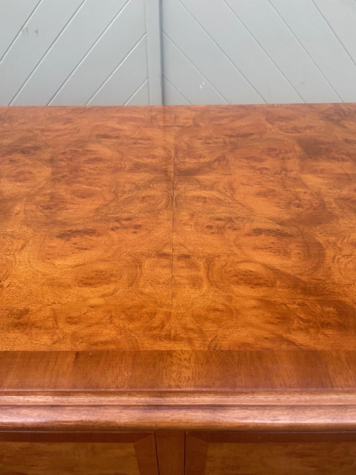 It has a quarter veneered burr walnut top with a cross banded border. It has 2 small over 4 larger graduated draws. All the draw fronts are in burr walnut with a cross banded edge, ornate brass handles. Polished walnut sides standing on bracket feet.
