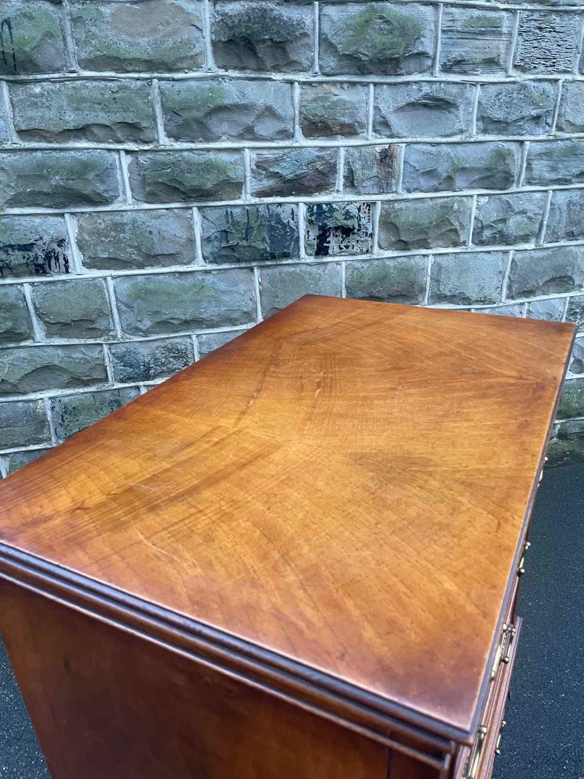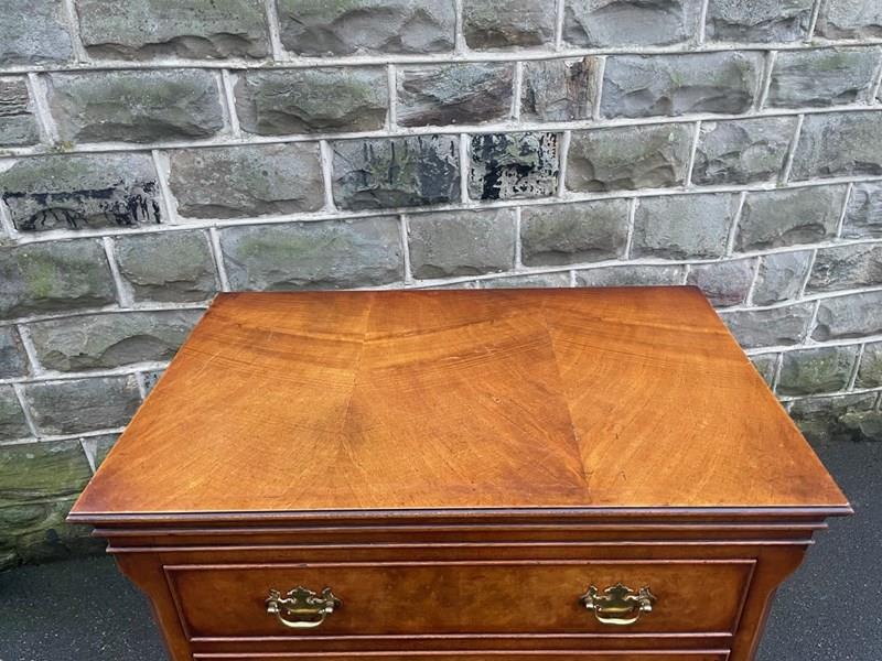 Walnut top. Burr walnut fronted draws, ornate brass drop handles. Reeded column sides. Standing on bracket feet. Brush slide to the centre. Polished walnut sides. It is 1 fixed piece of furniture.