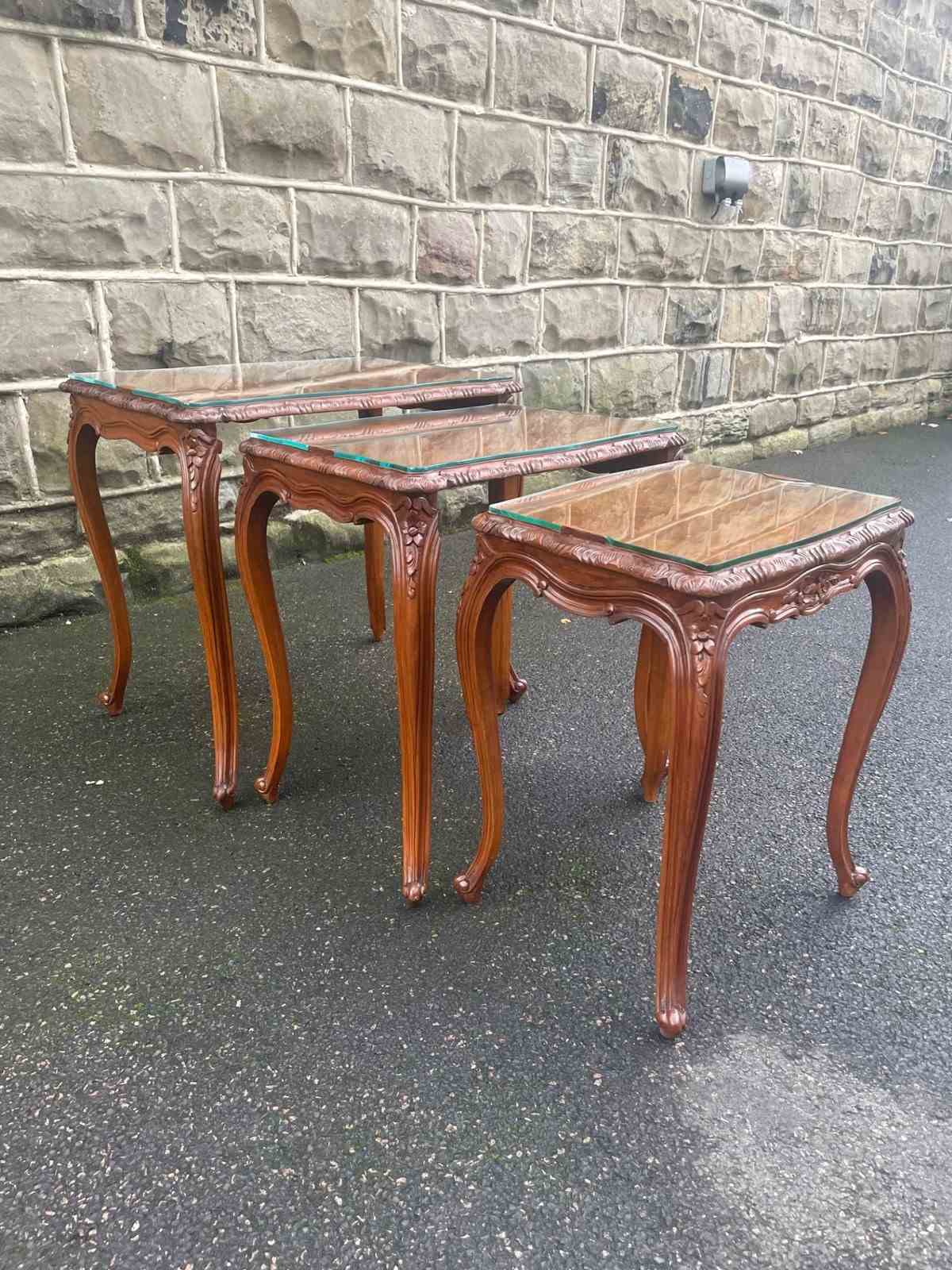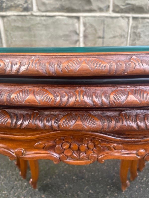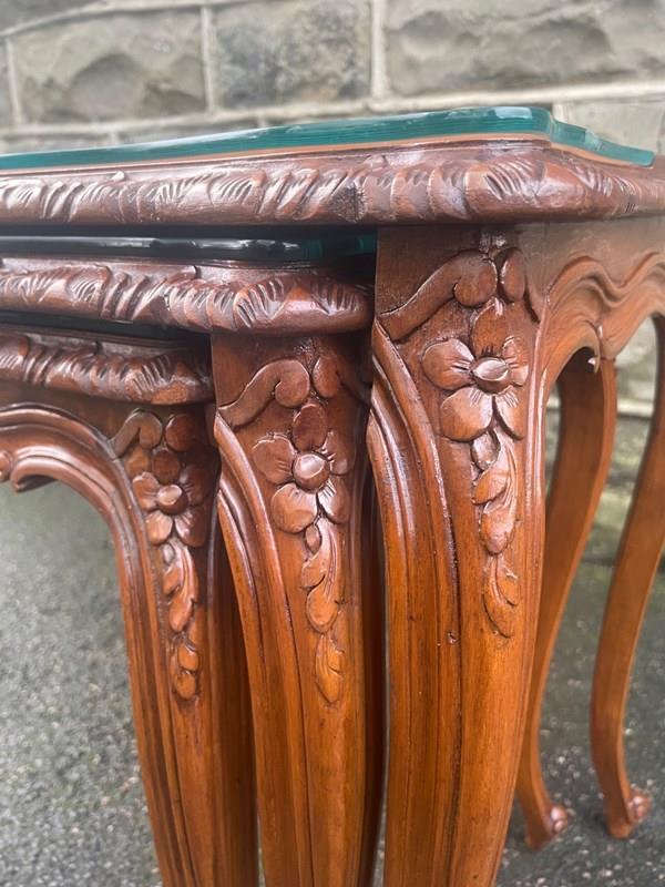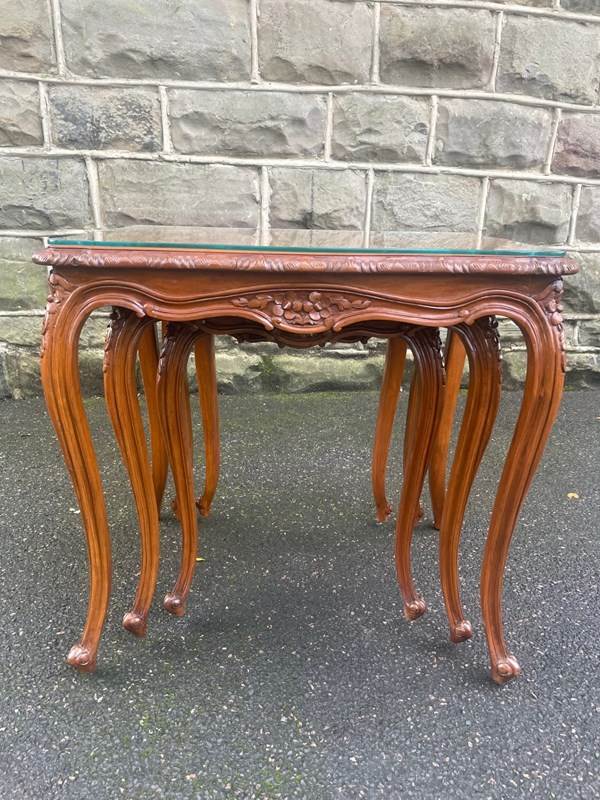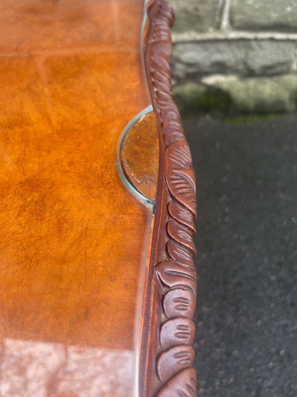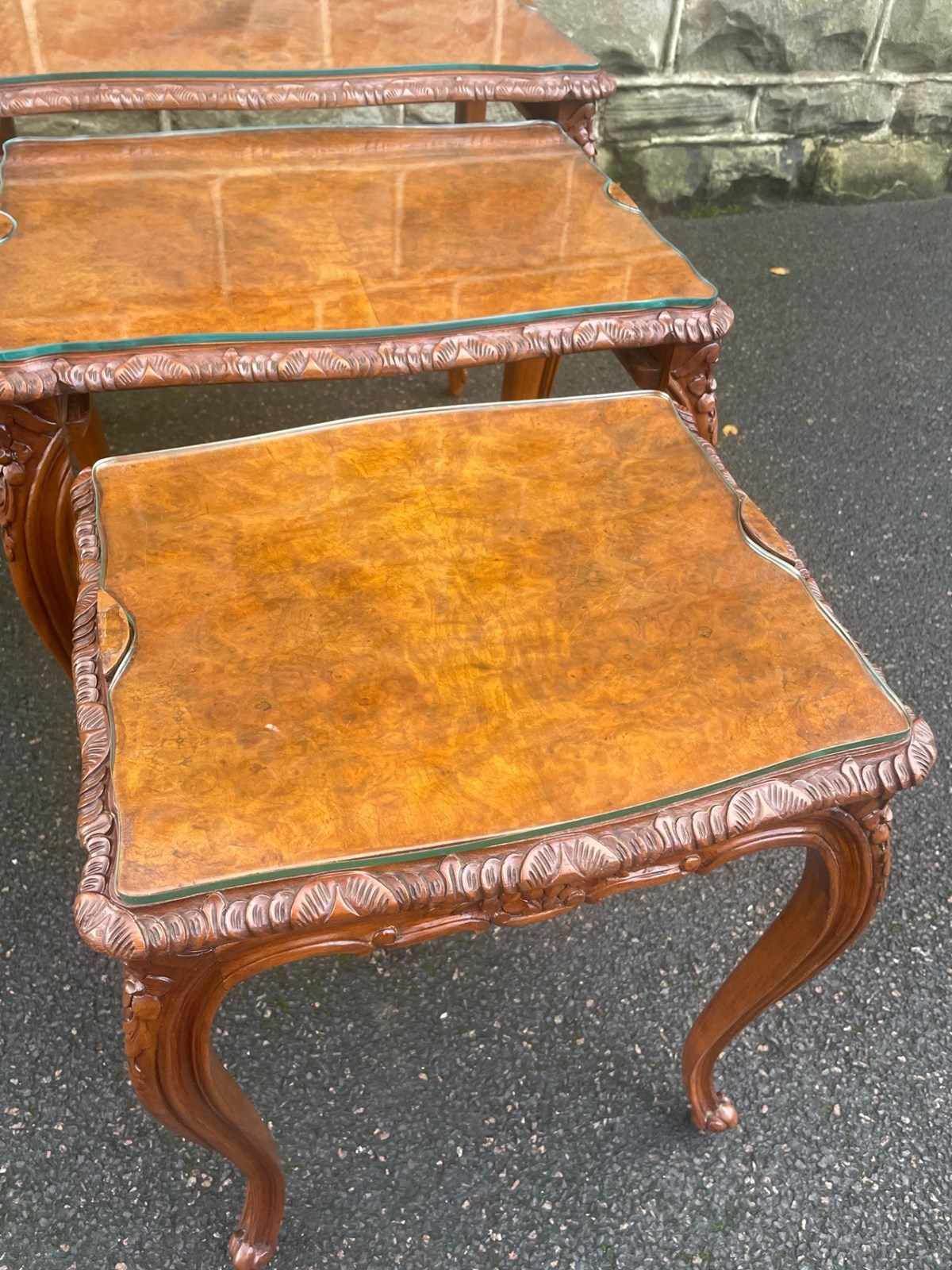 Each table a protective glass top, burr walnut table tops with carved edge, standing on slender well carved walnut cabriole legs with a carved freize.