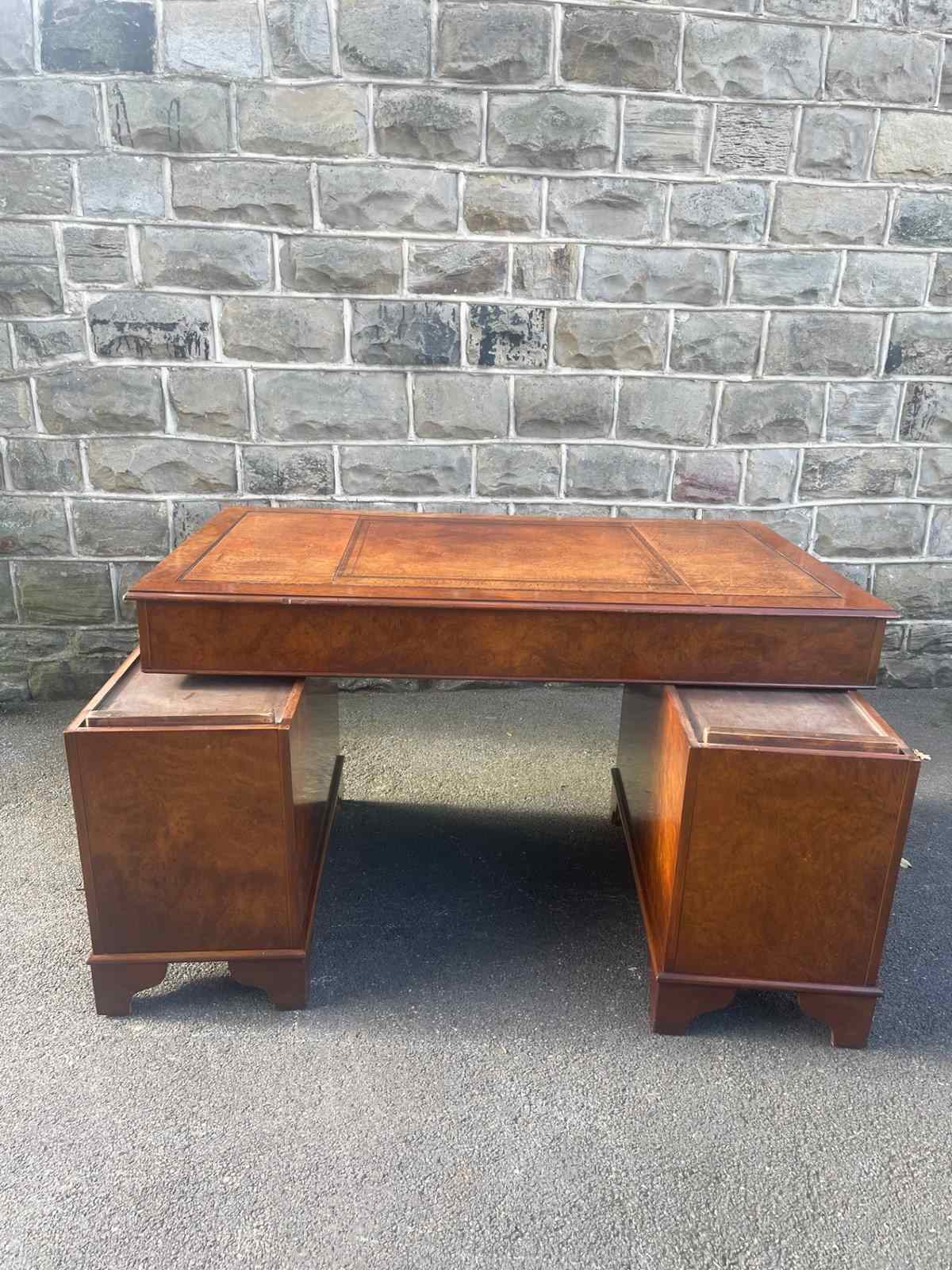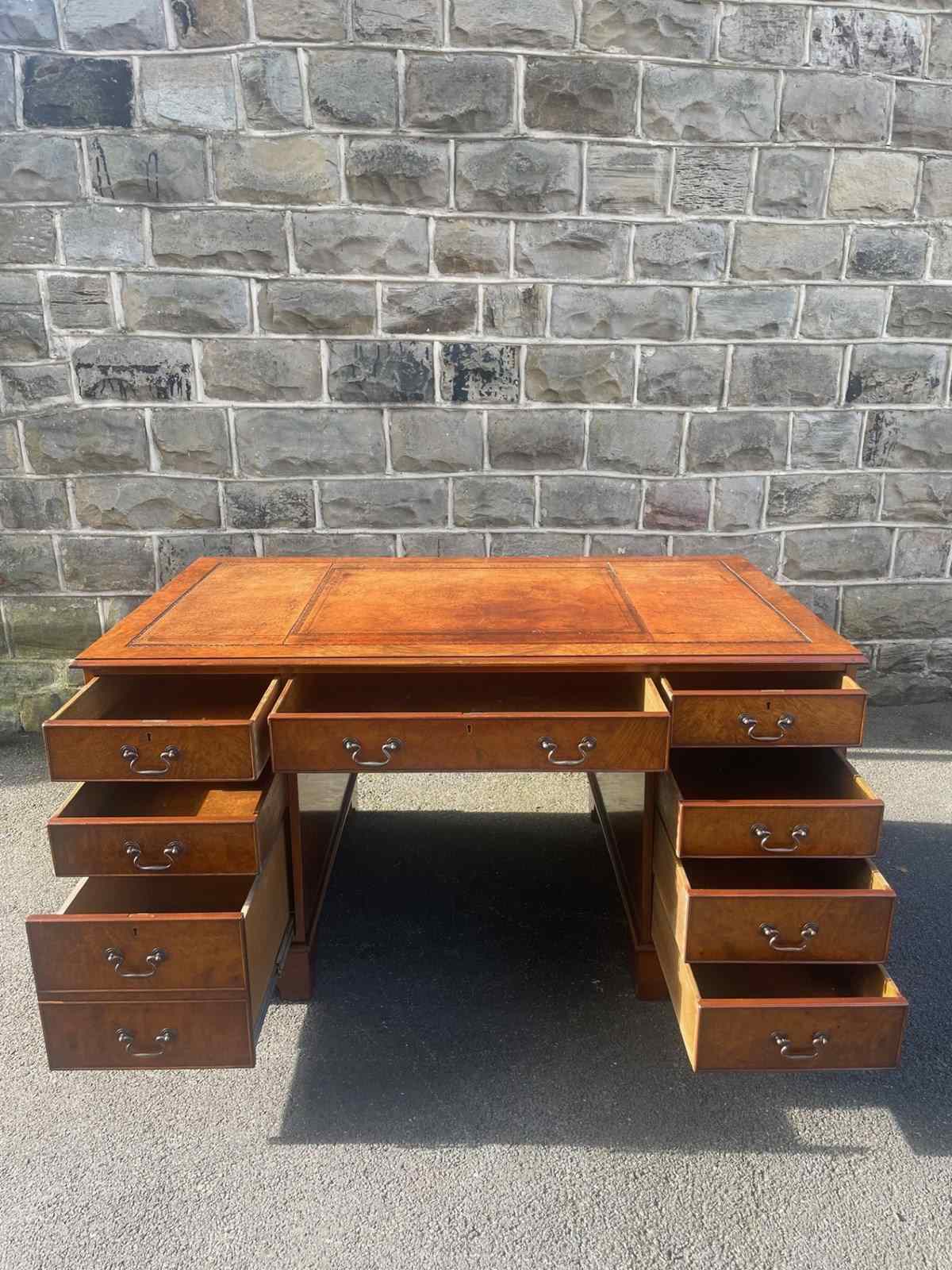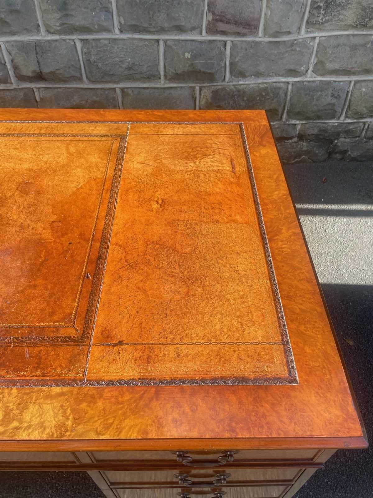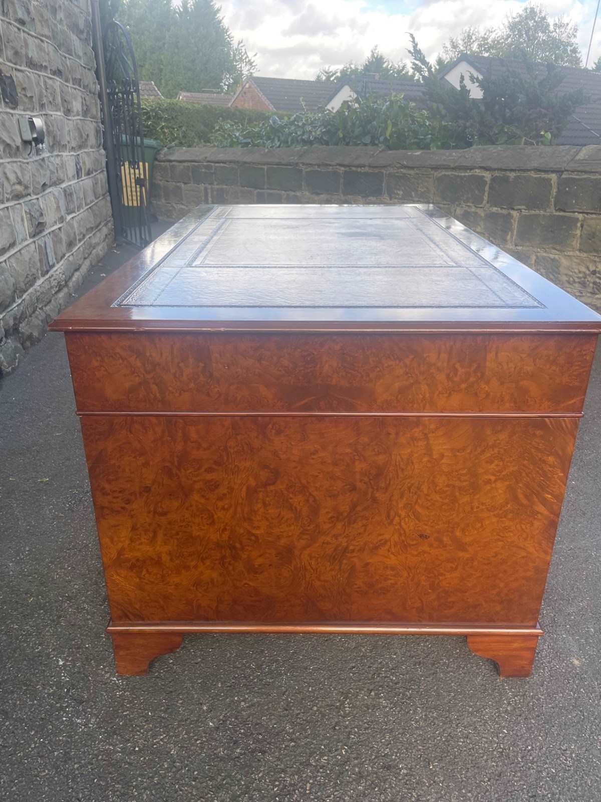In burr walnut, the top having the original tooled leather inset top with a burr walnut border. There are 3 draws across the top, with 3 graduated draws to each pedestal. All the draw front are in burr walnut with brass drop handles. Polished burr walnut sides & back, standing on bracket feet.