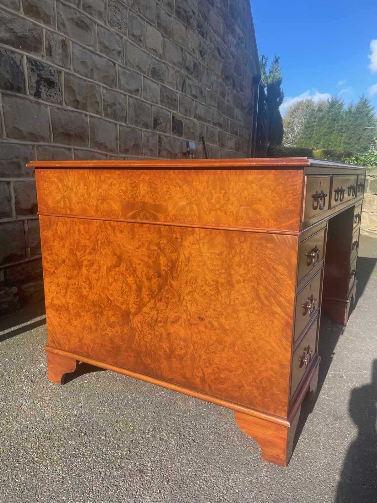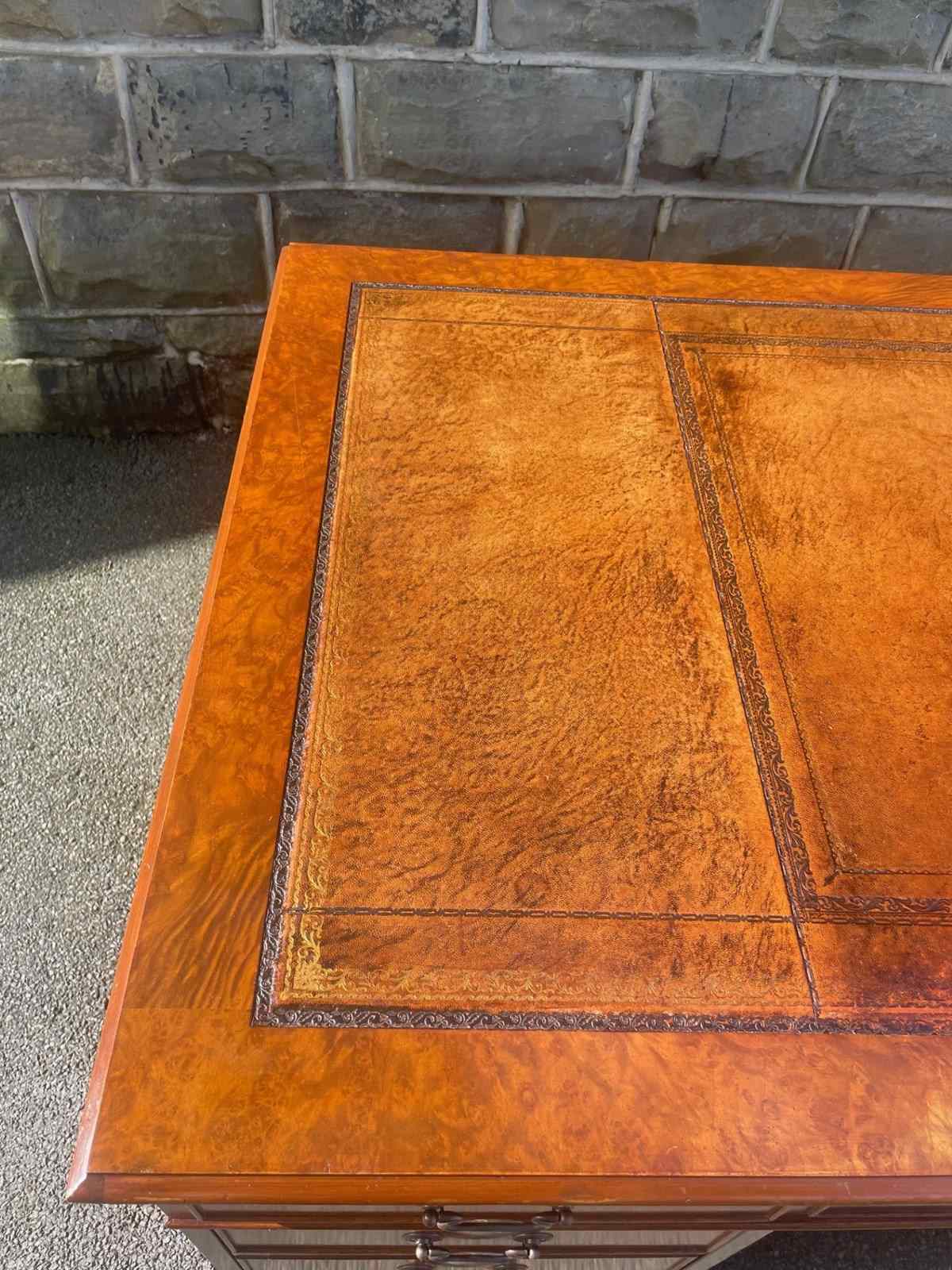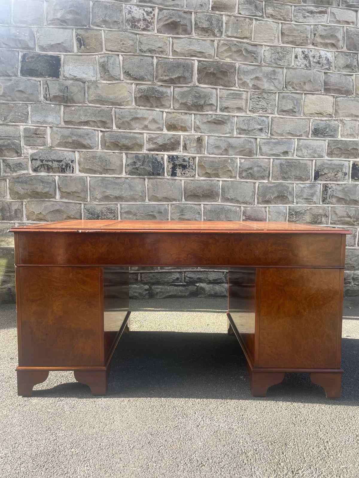 In burr walnut, the top having the original tooled leather inset top with a burr walnut border. There are 3 draws across the top, with 3 graduated draws to each pedestal. All the draw front are in burr walnut with brass drop handles. Polished burr walnut sides & back, standing on bracket feet.