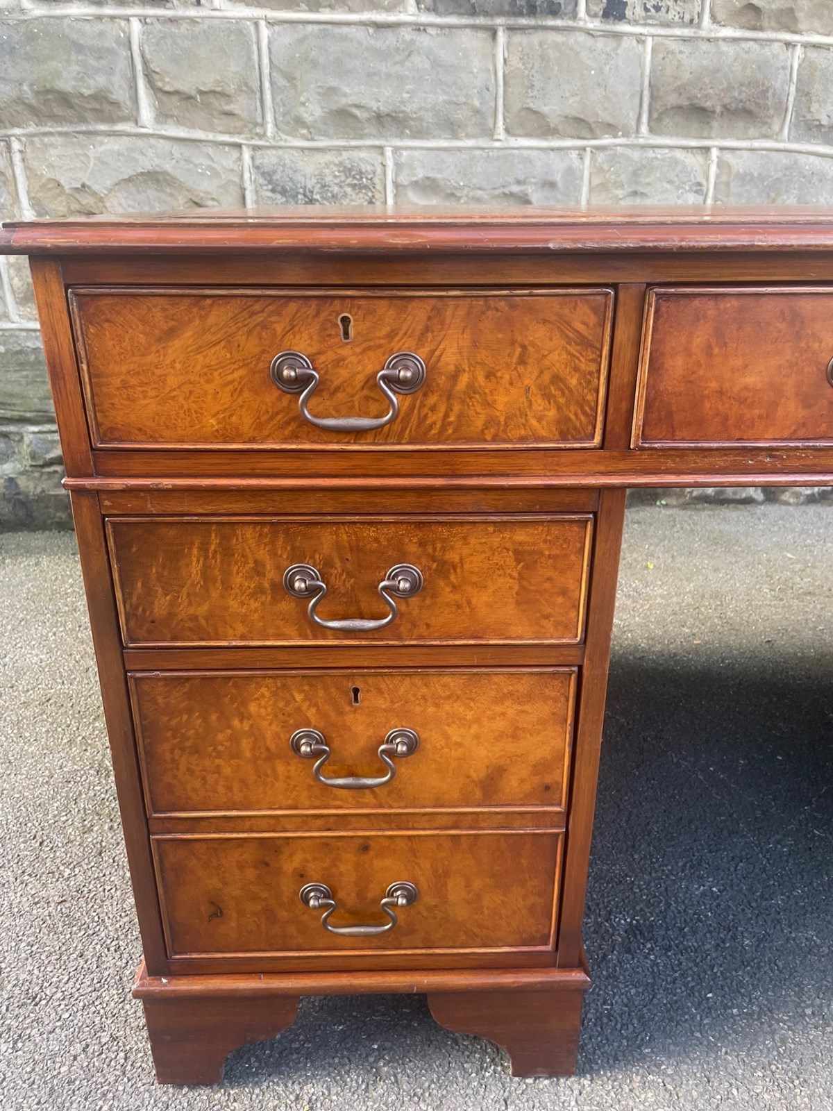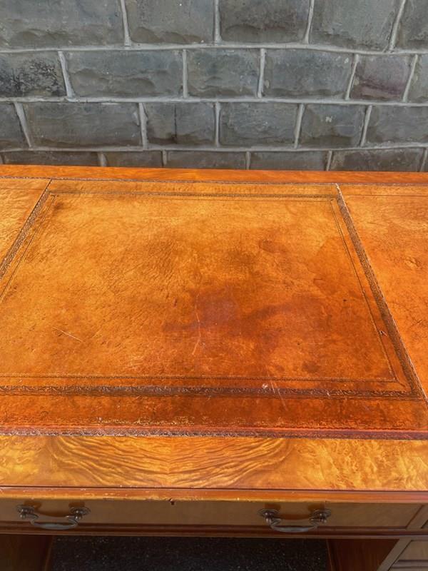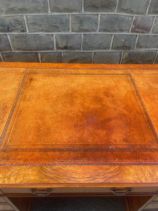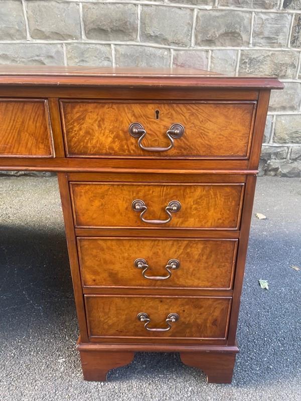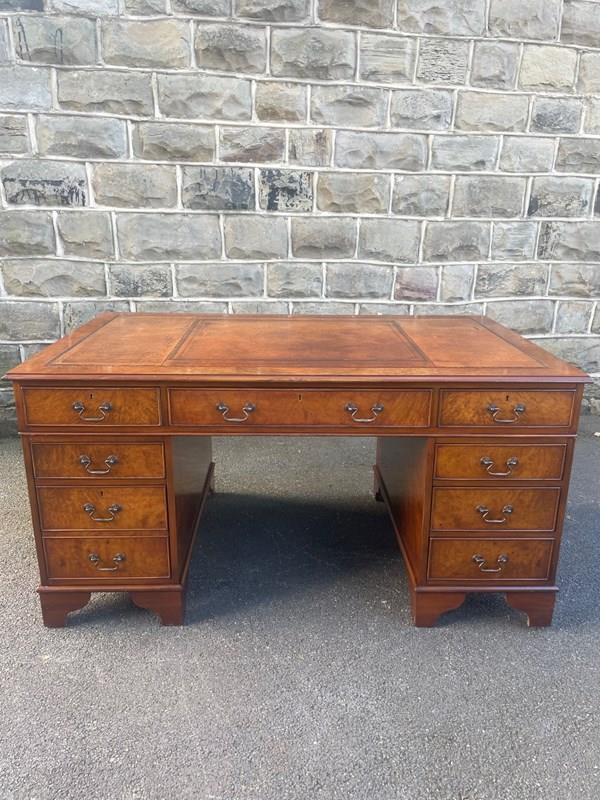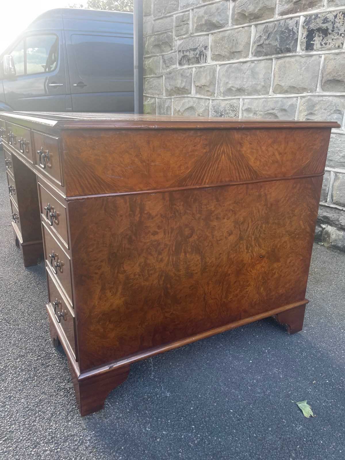 In burr walnut, the top having the original tooled leather inset top with a burr walnut border. There are 3 draws across the top, with 3 graduated draws to each pedestal. All the draw front are in burr walnut with brass drop handles. Polished burr walnut sides & back, standing on bracket feet.