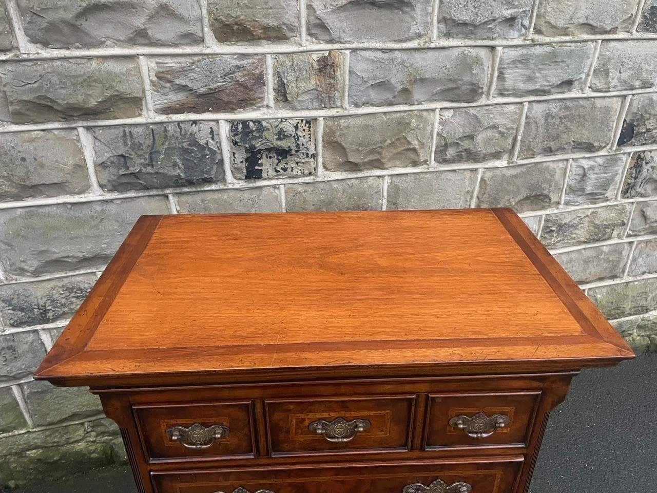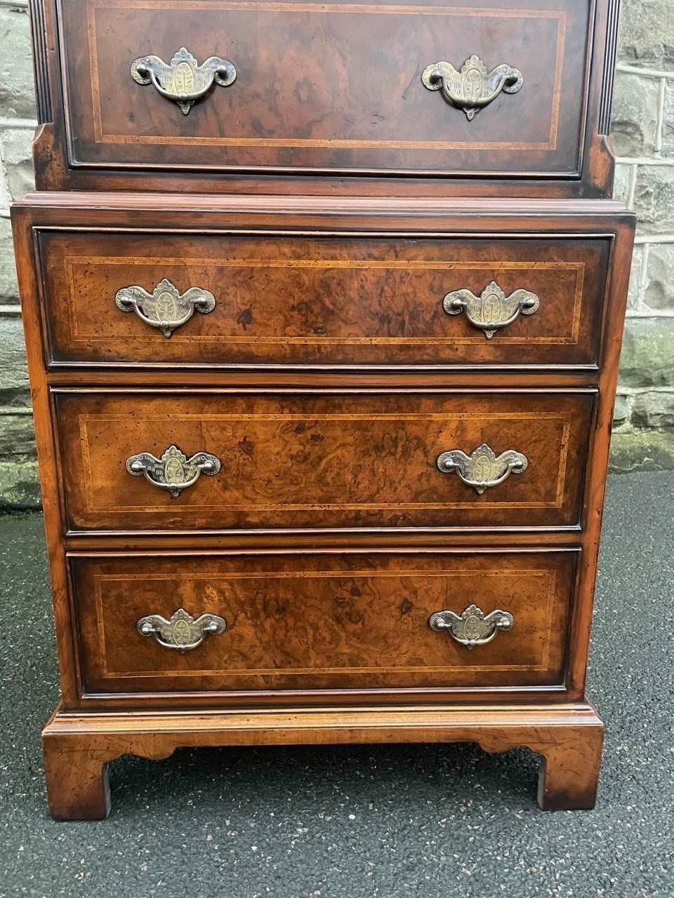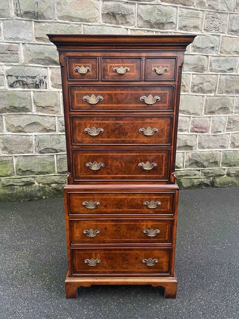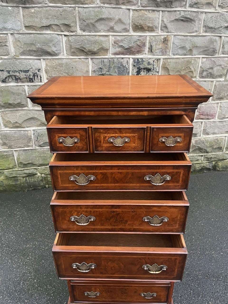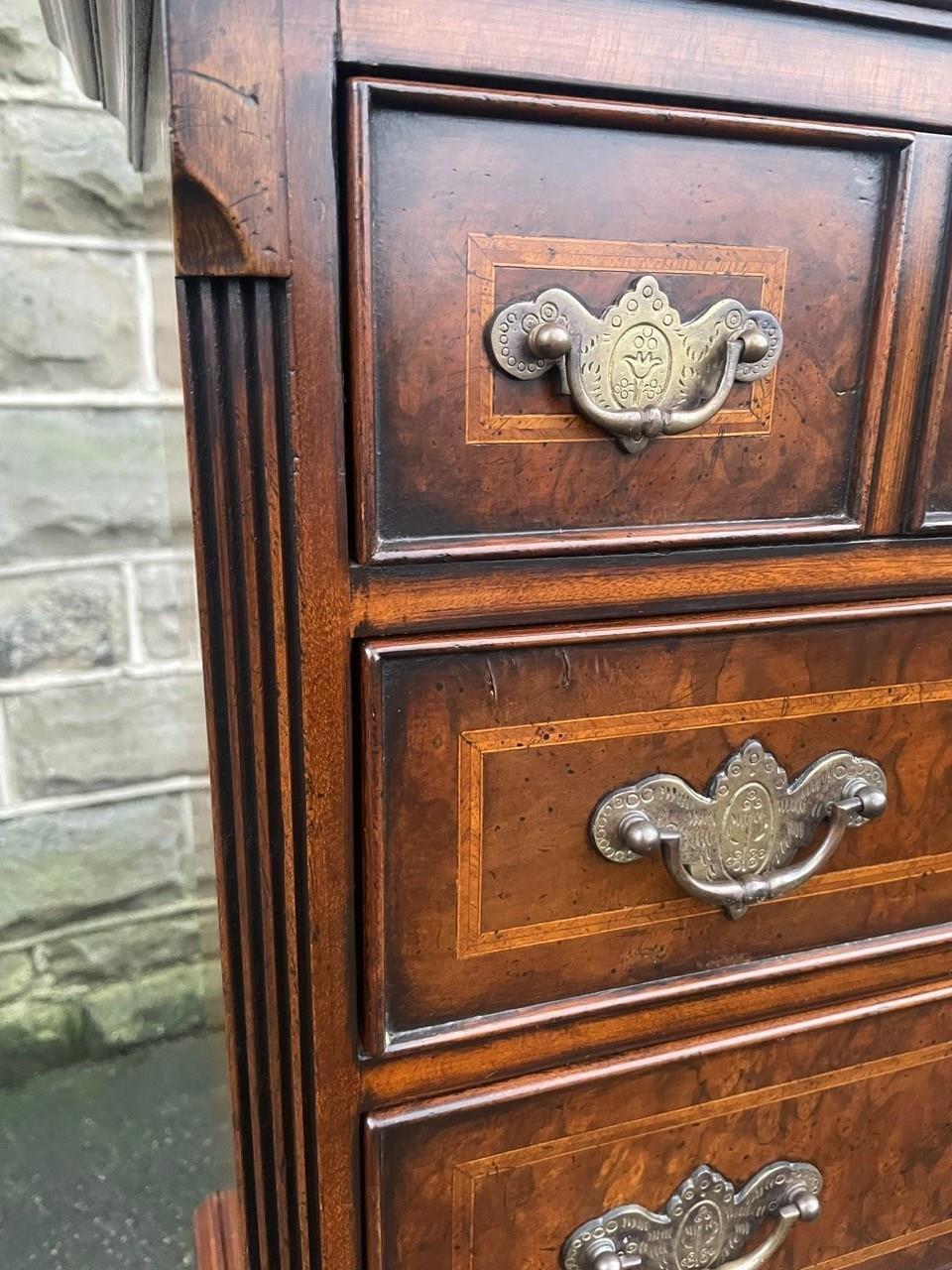 Lovely slim size & proportions. Made in 2 pieces. The top section having 4 draws (top draw being a dummy looking 3 small draws) with the bottom section having 3 draws. Burr walnut fronted draws with inlaid feather banding & ornate brass handles. Polished walnut sides standing on bracket feet
