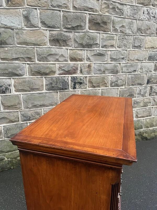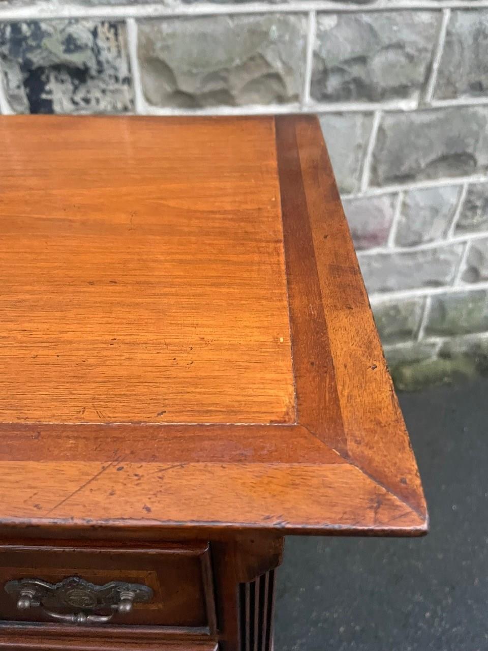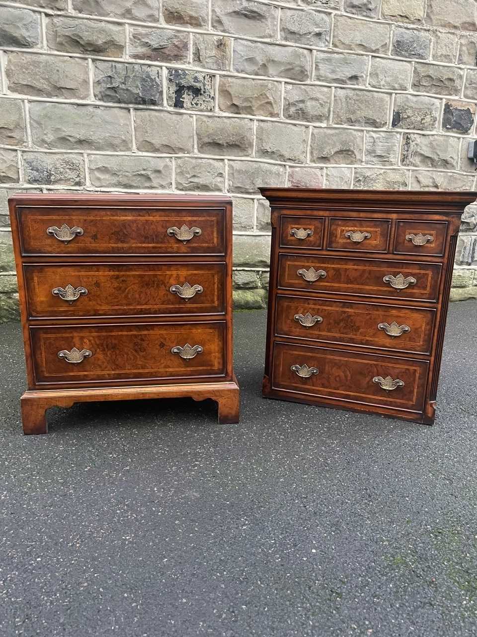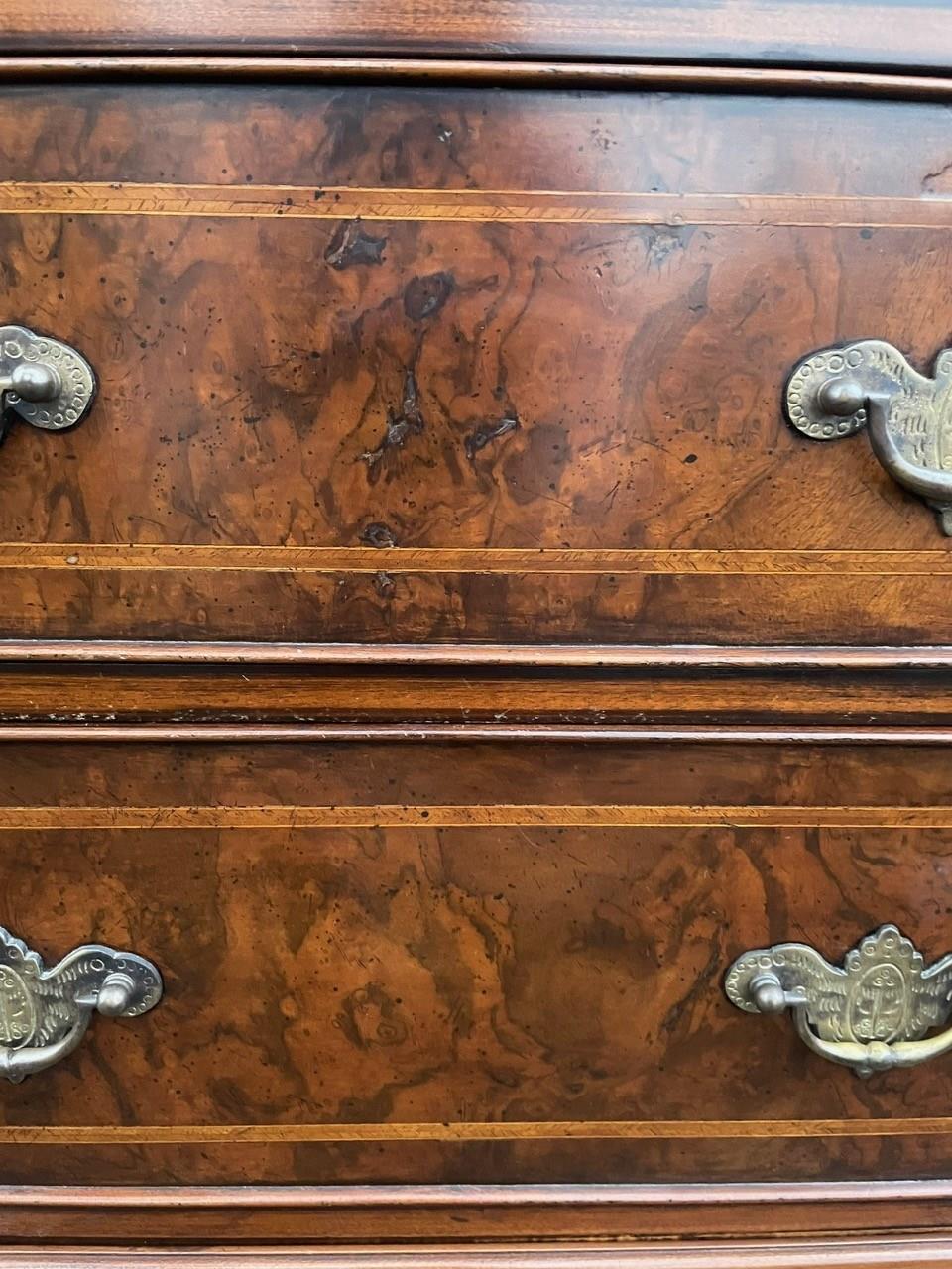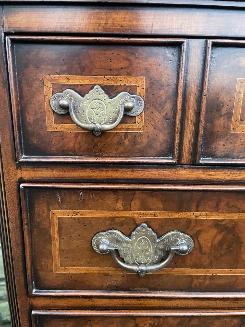 Lovely slim size & proportions. Made in 2 pieces. The top section having 4 draws (top draw being a dummy looking 3 small draws) with the bottom section having 3 draws. Burr walnut fronted draws with inlaid feather banding & ornate brass handles. Polished walnut sides standing on bracket feet
