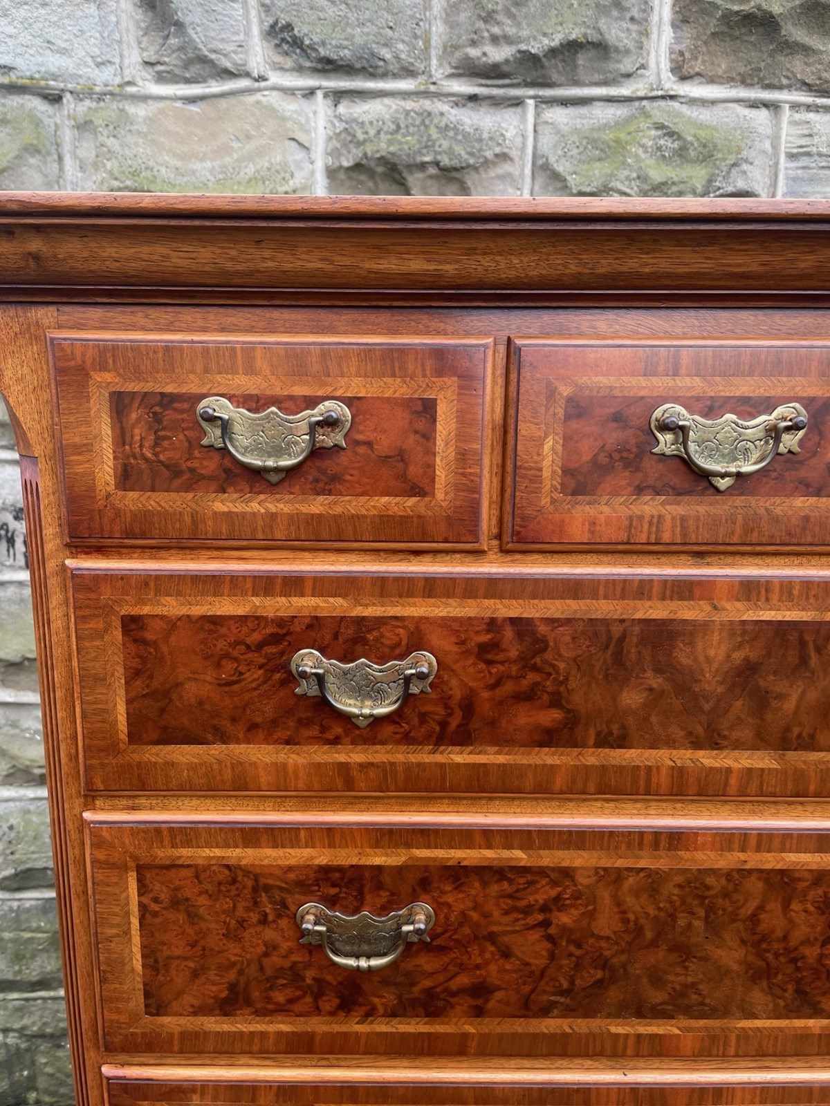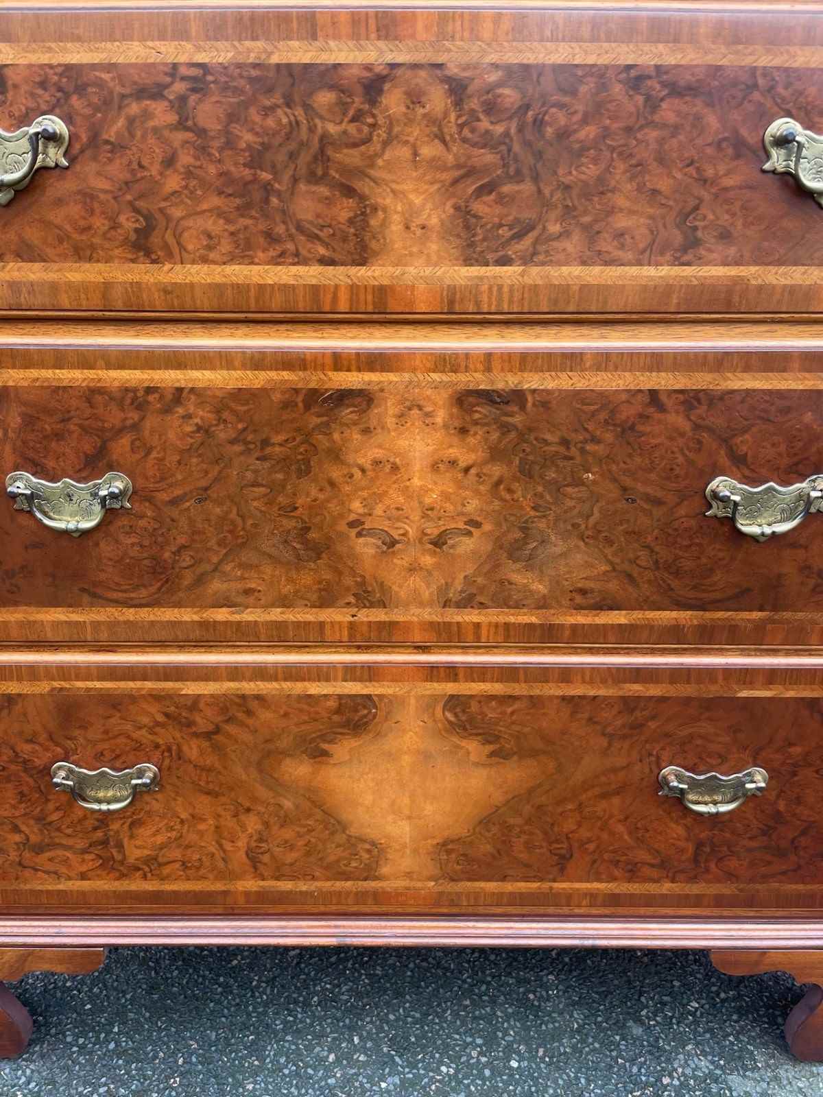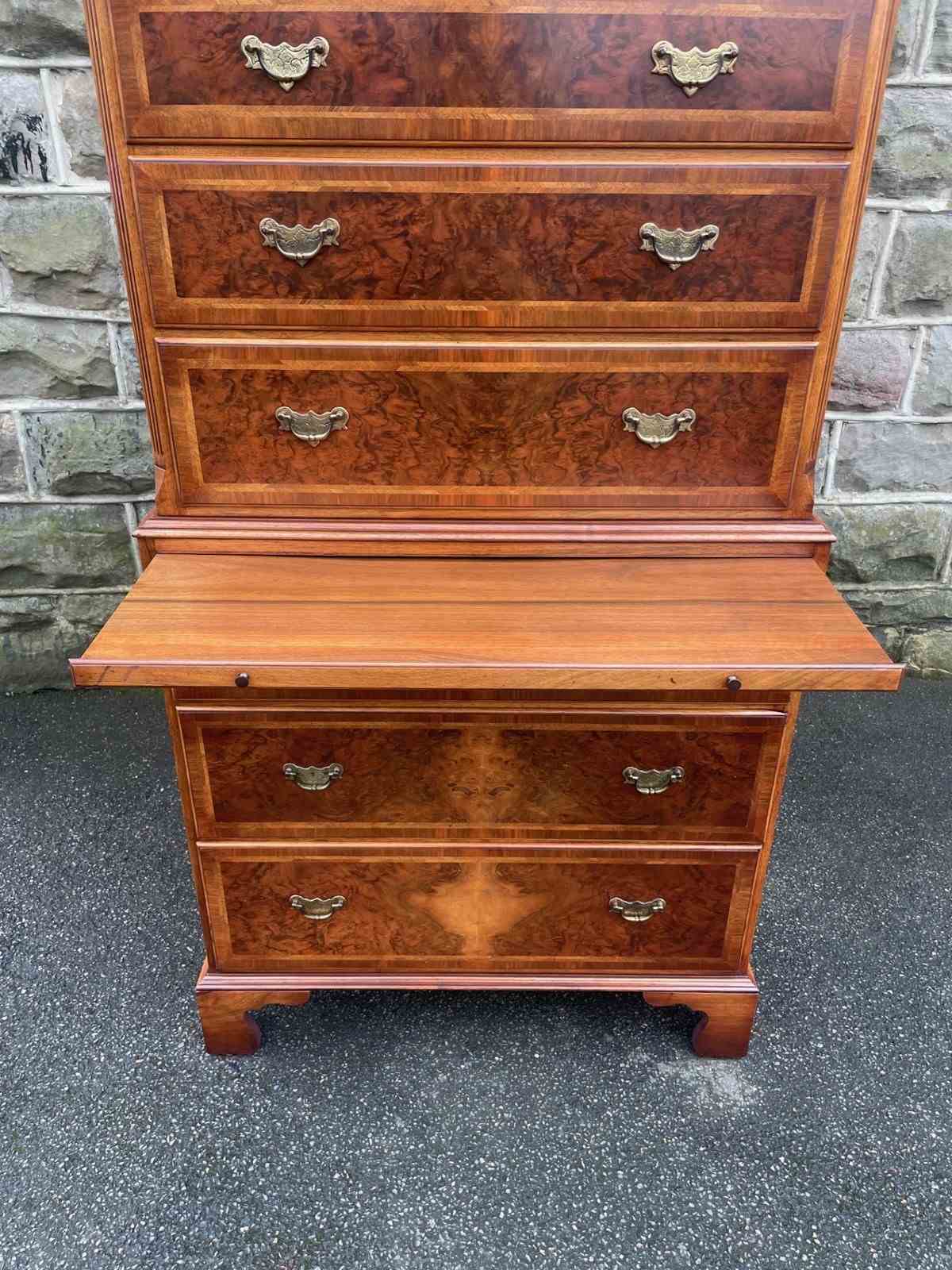 Lovely size & proportions. The top section having 3 smaller draws over 3 larger draws, pull out slide, the bottom section having 3 graduated draws. Burr walnut fronted draws with inlaid feather banding & ornate brass handles. Polished burr walnut sides standing on bracket feet.