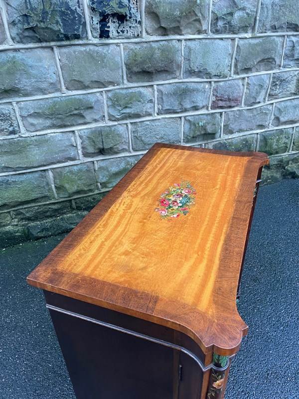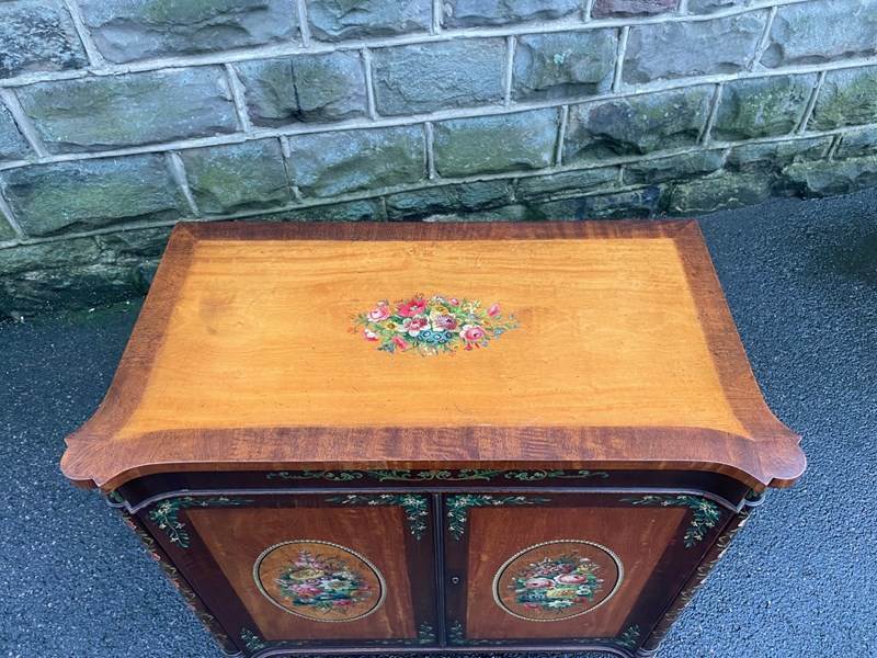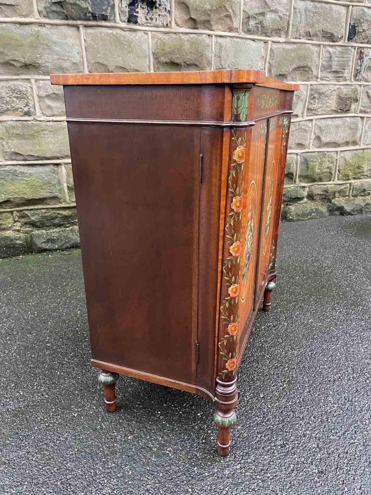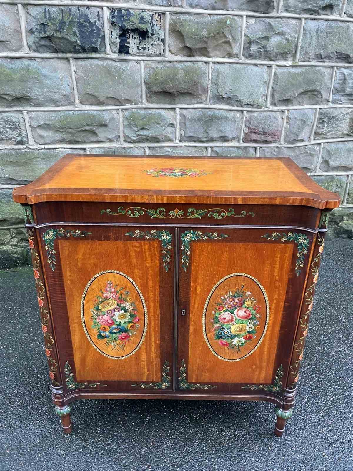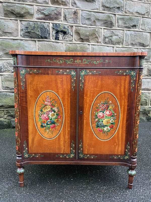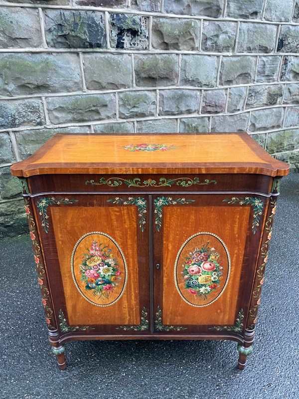 Offered for sale is this very decorative painted satinwood side cabinet. Of lovely neat proportions. In satinwood having painted floral decoration, pair cupboard doors with internal shelf standing on turned feet