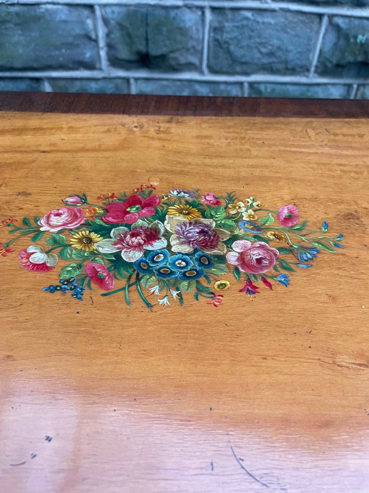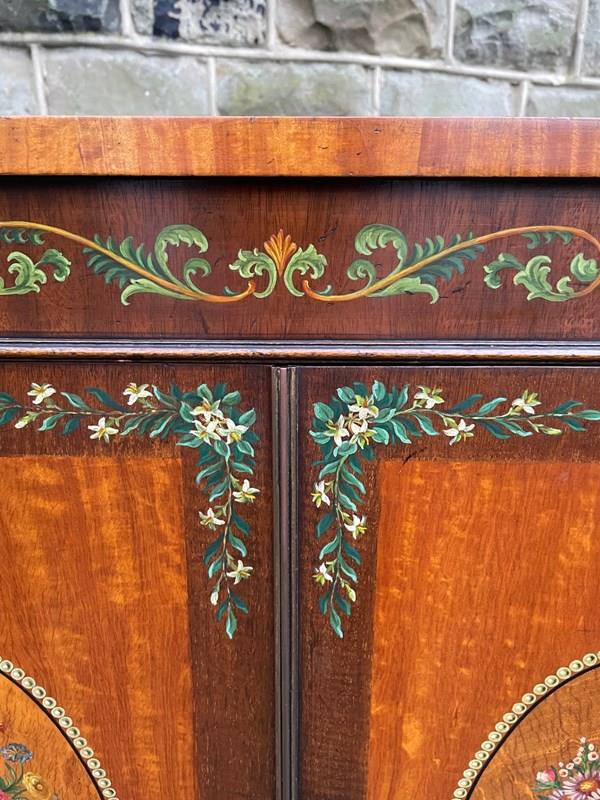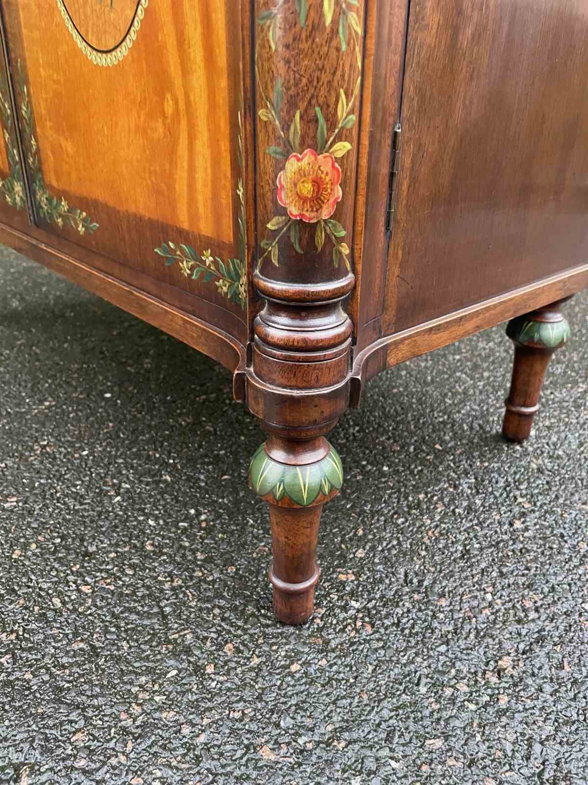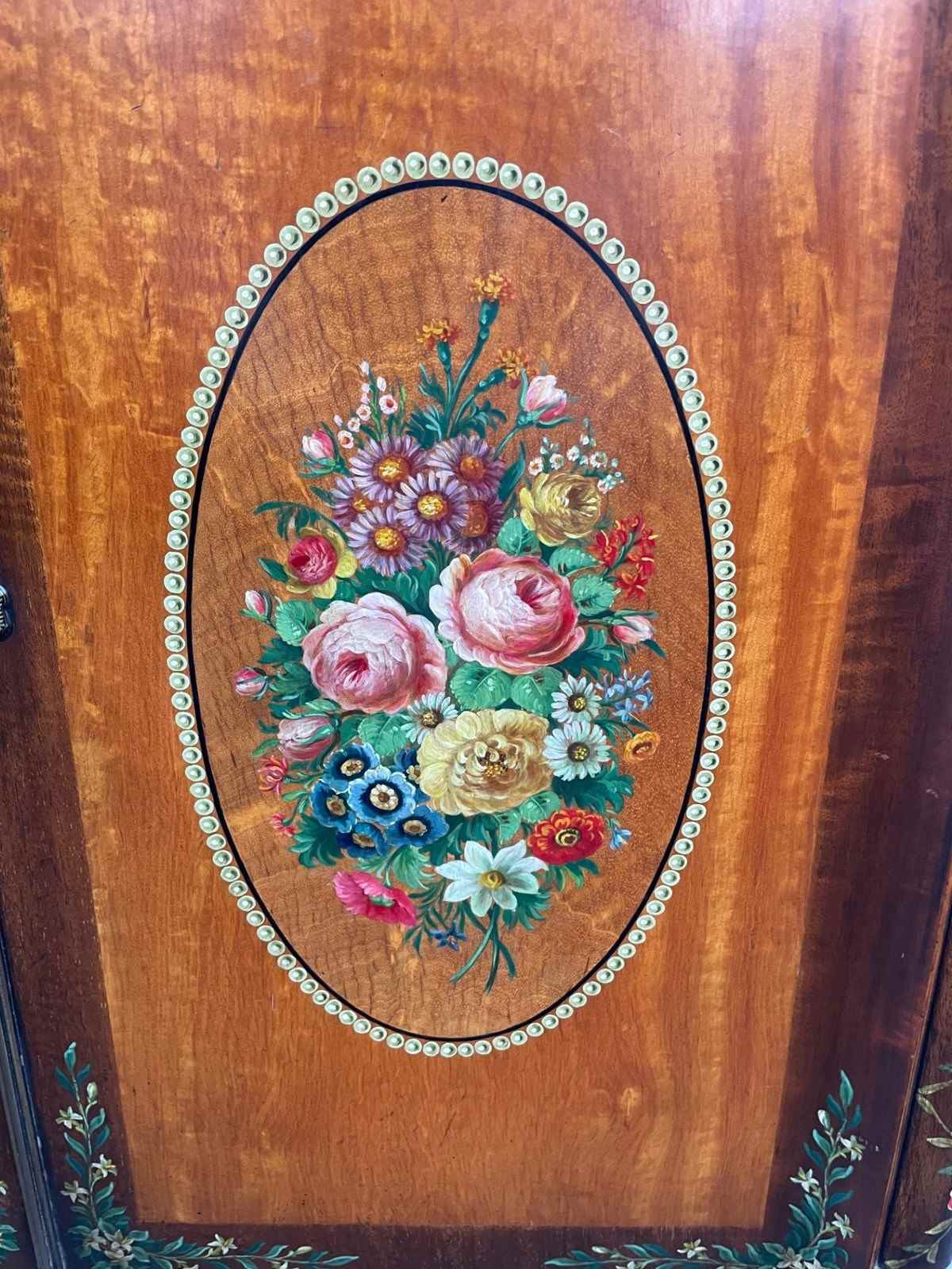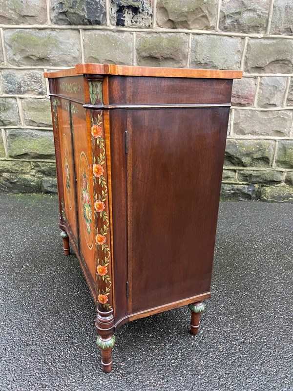 Offered for sale is this very decorative painted satinwood side cabinet. Of lovely neat proportions. In satinwood having painted floral decoration, pair cupboard doors with internal shelf standing on turned feet